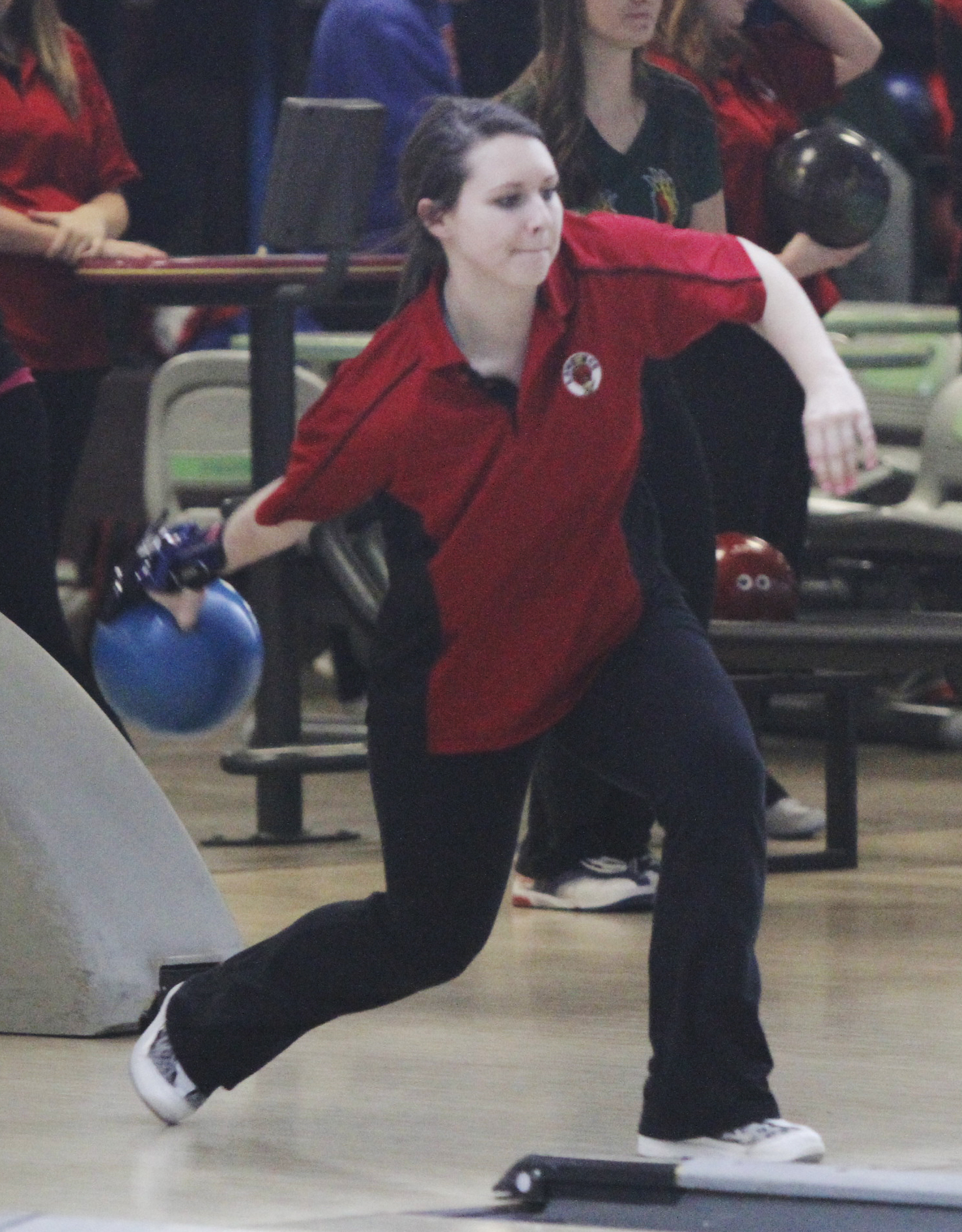 Lawrence High senior Miranda Krom competes in the bowling City Showdown on Monday, Feb. 15, 2016, at Royal Crest Lanes.