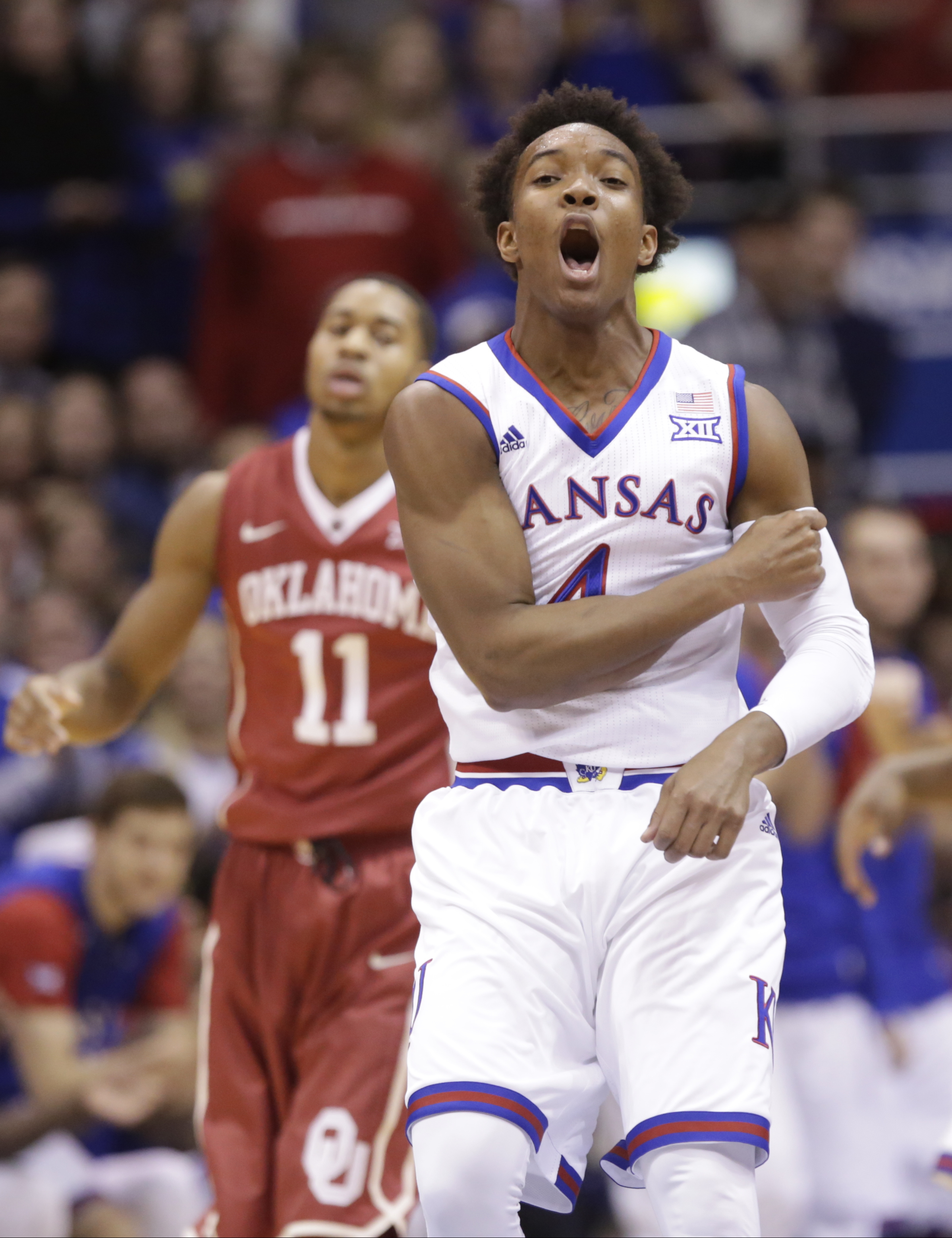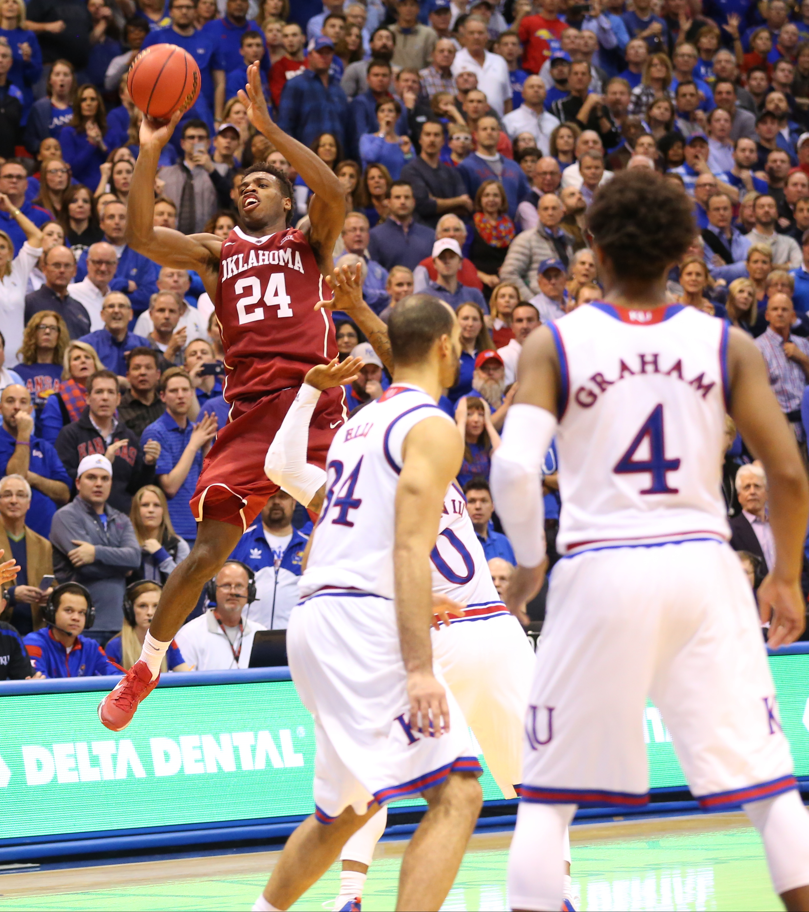 Kansas guard Devonte' Graham (4) hangs for a shot against the Oklahoma defense during the first half, Monday, Jan. 4, 2016 at Allen Fieldhouse.