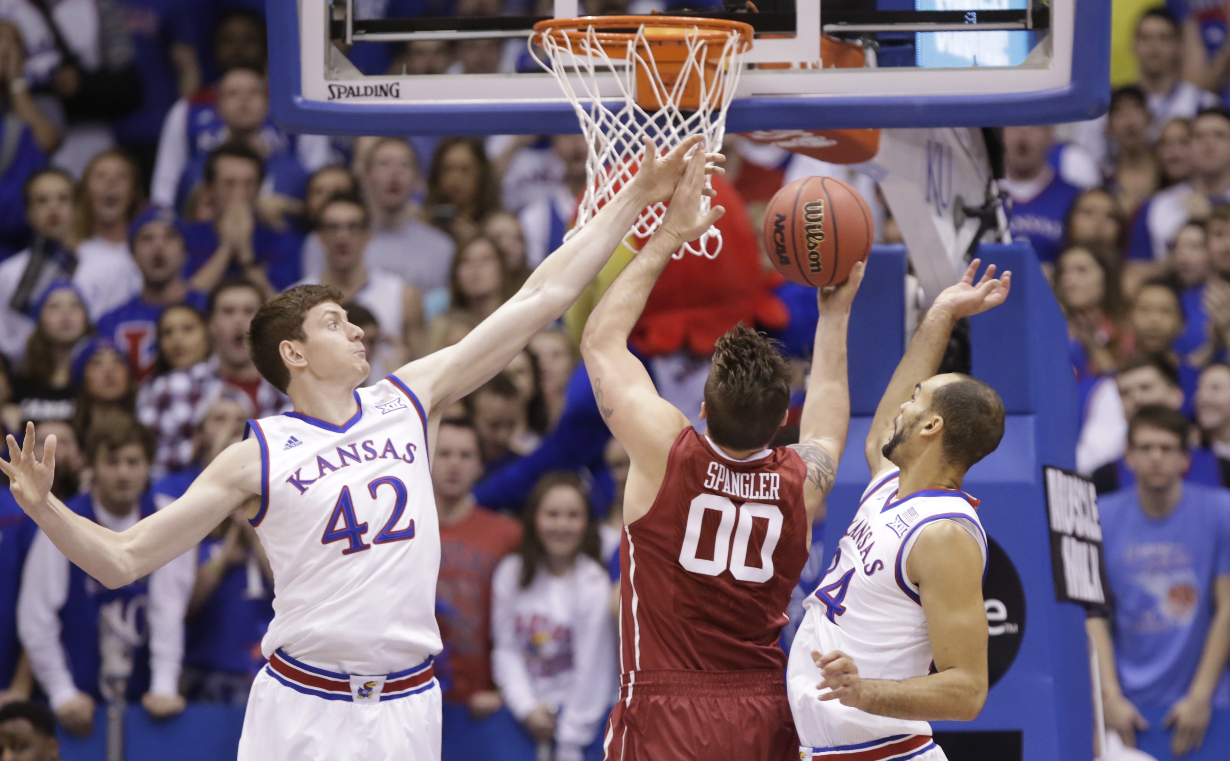 Kansas forward Hunter Mickelson (42) and forward Perry Ellis defend as Oklahoma forward Ryan Spangler (00) heads to the bucket during the first half, Monday, Jan. 4, 2016 at Allen Fieldhouse.