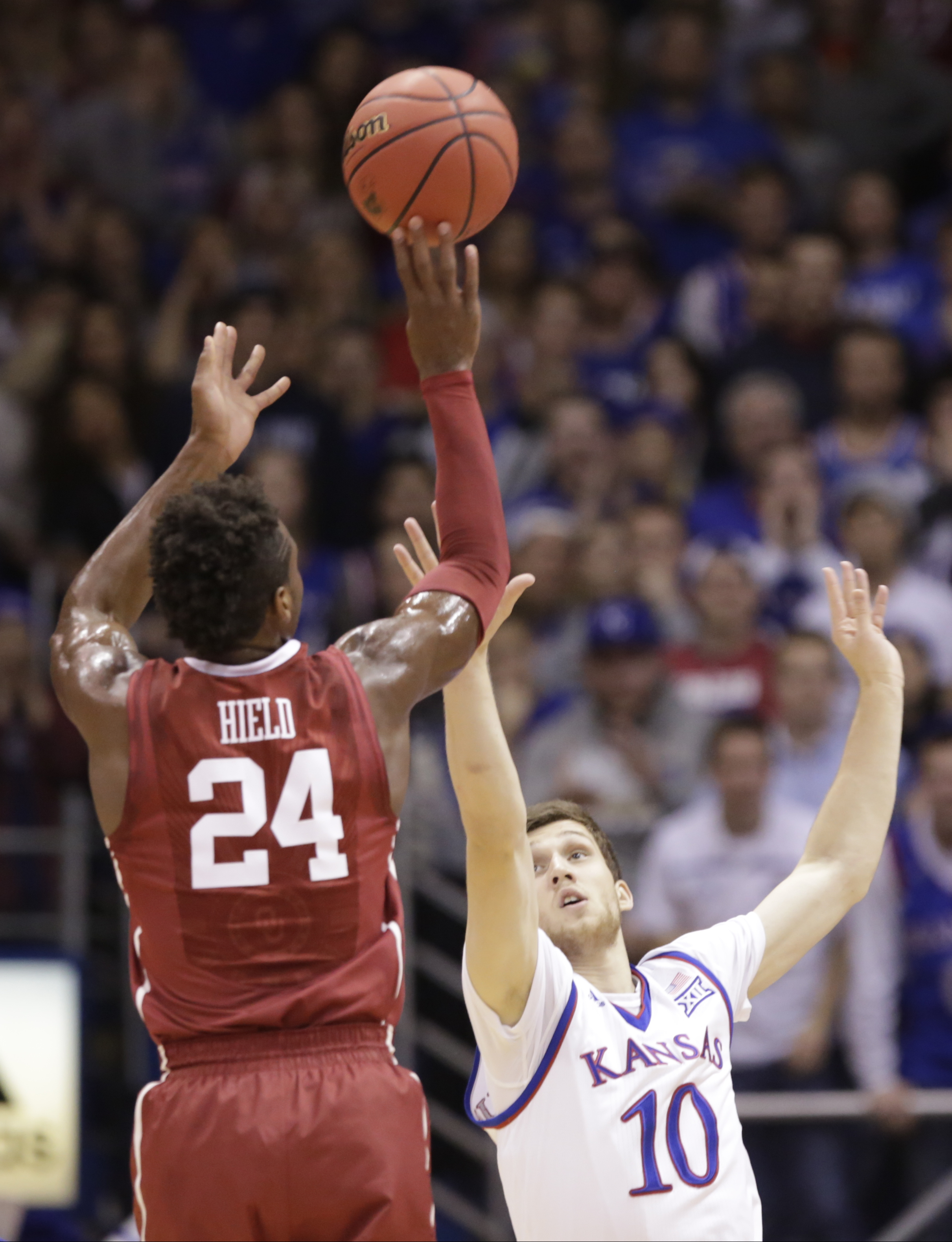 Oklahoma guard Buddy Hield (24) puts a shot over Kansas guard Sviatoslav Mykhailiuk (10) during the first half, Monday, Jan. 4, 2016 at Allen Fieldhouse.