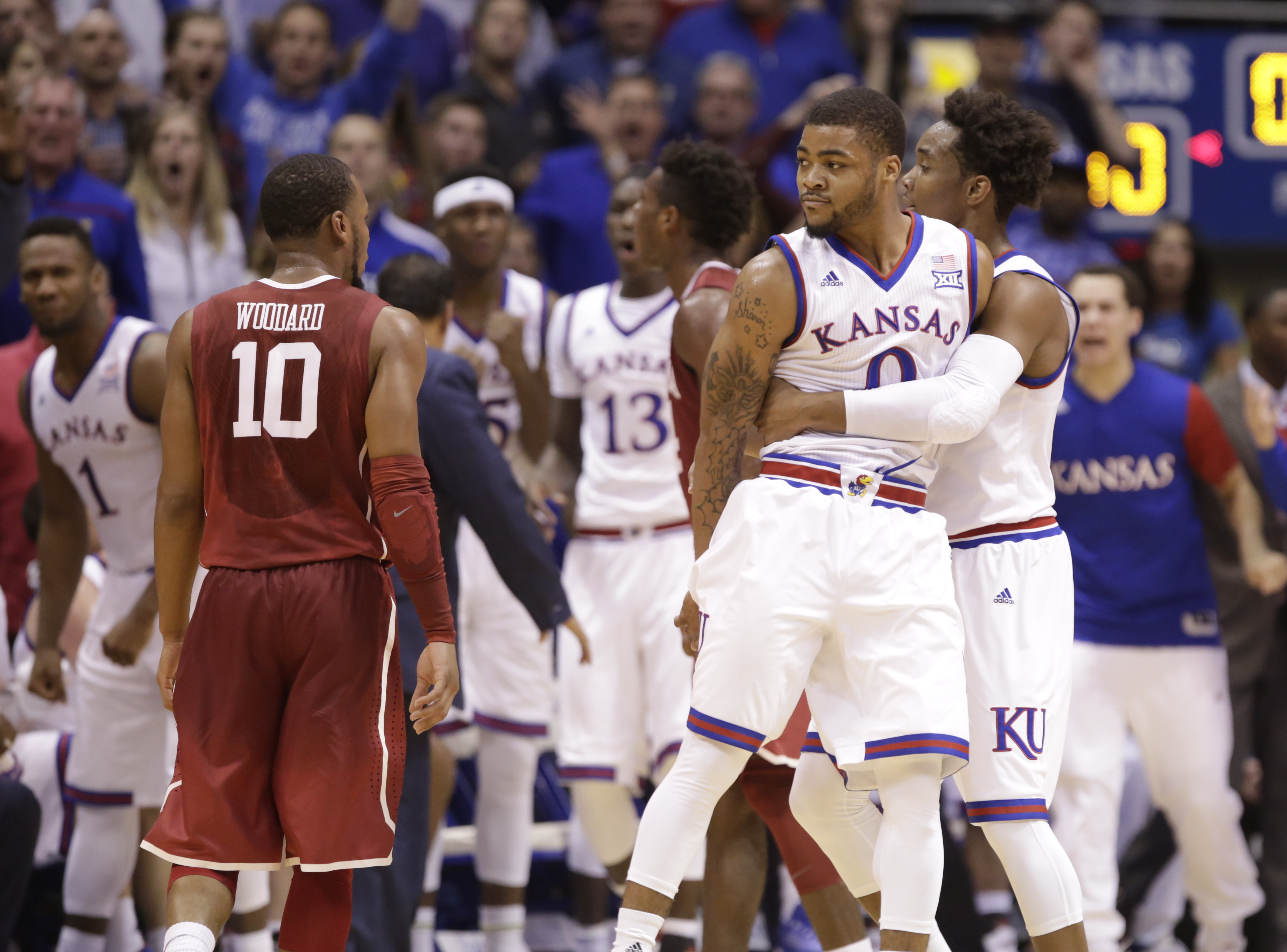 Kansas head coach Bill Self comes in to slap hands and hug Oklahoma guard Buddy Hield (24) following the Jayhawks' 109-106 triple overtime win over the Sooners.