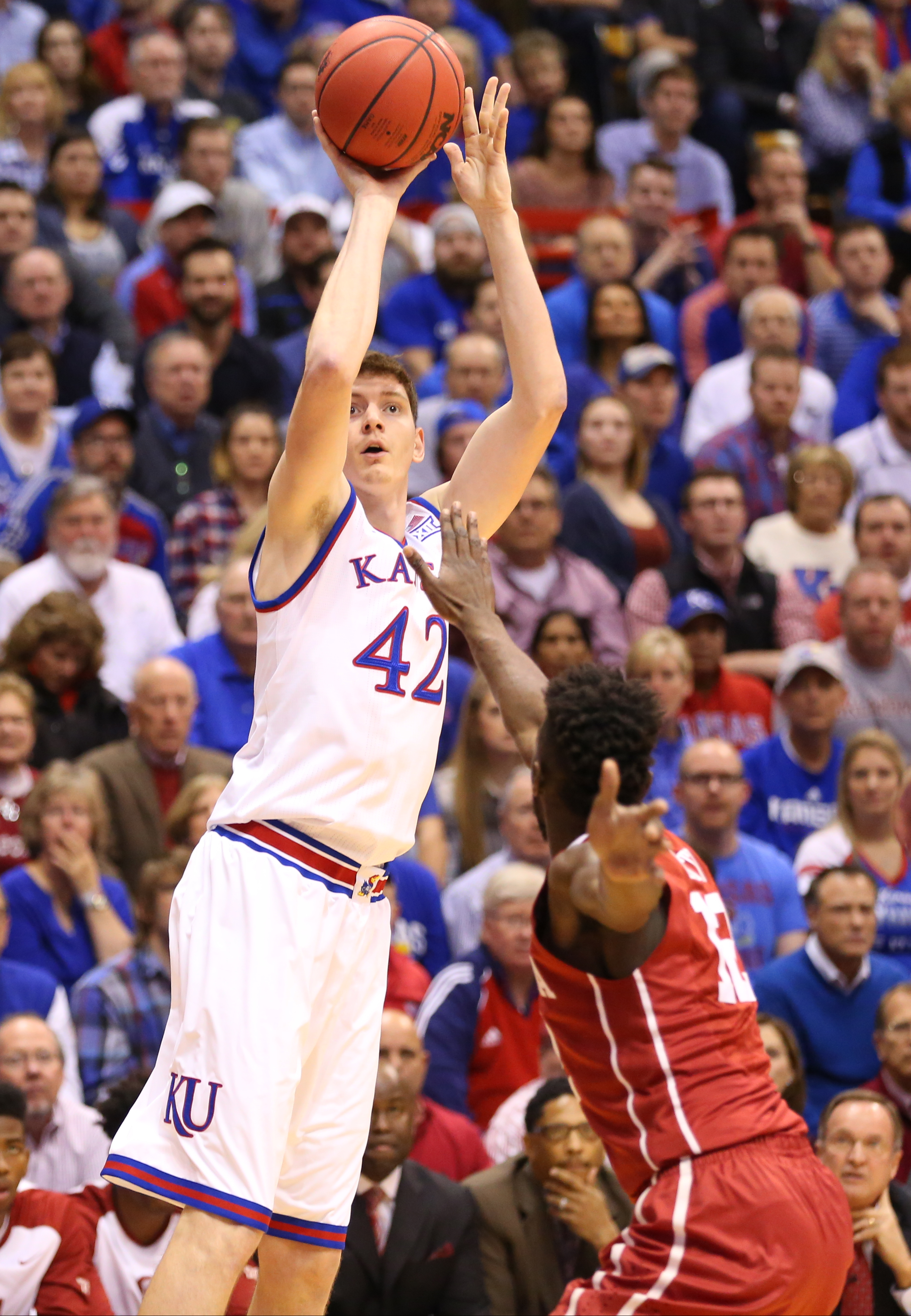 Kansas forward Hunter Mickelson (42) turns for a shot over Oklahoma forward Khadeem Lattin (12) during the first half, Monday, Jan. 4, 2016 at Allen Fieldhouse.