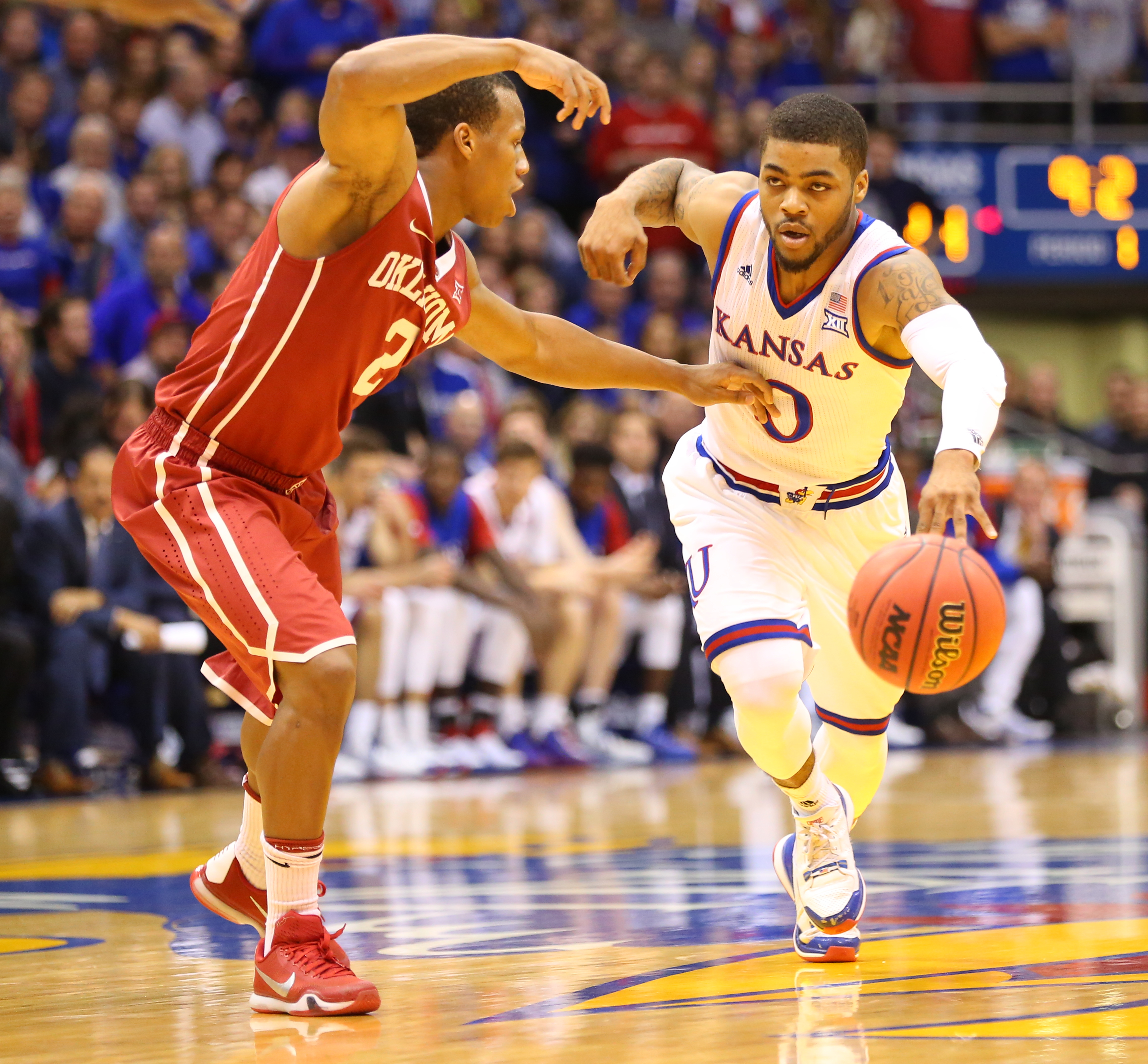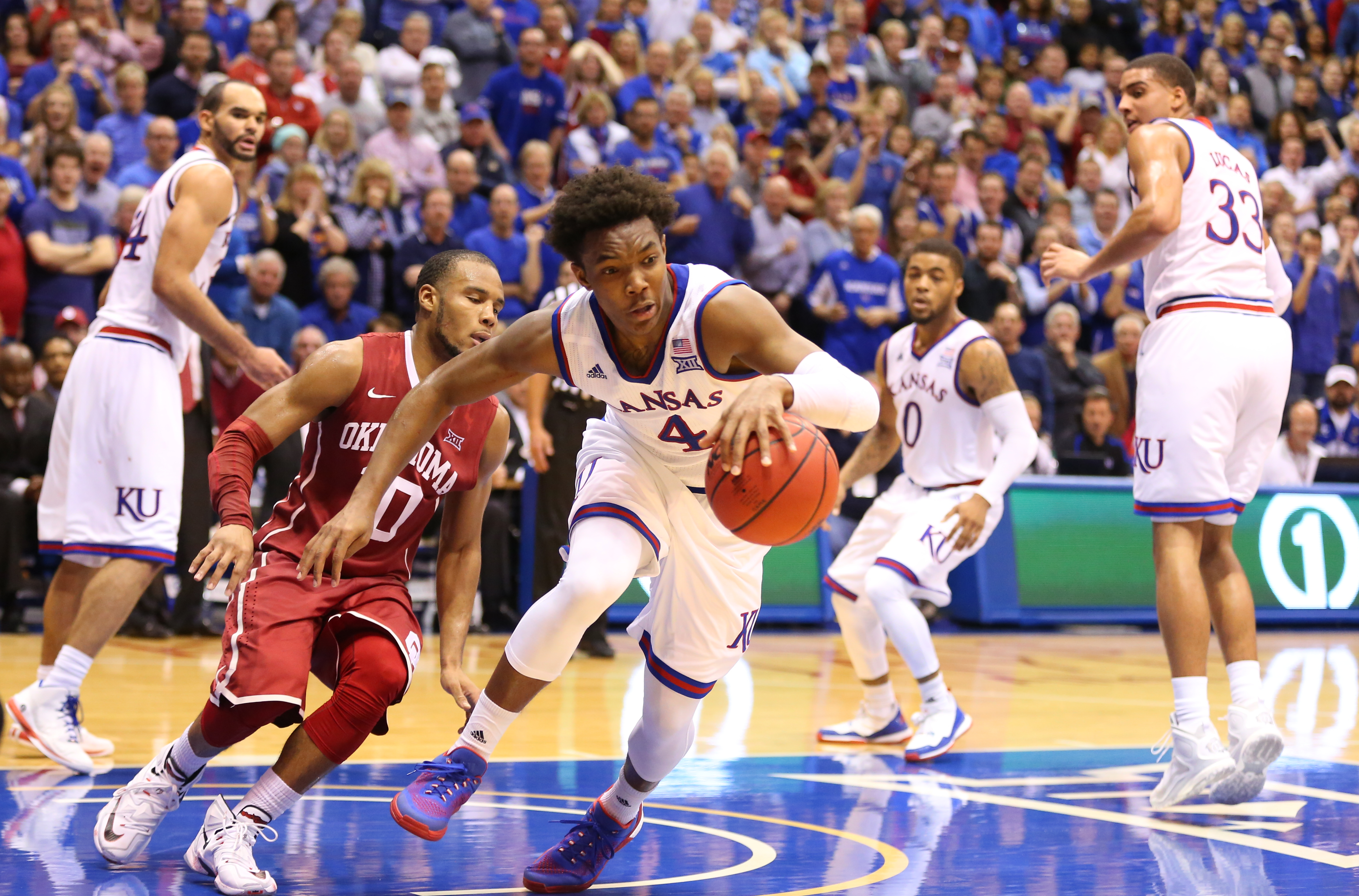 Kansas guard Frank Mason III (0) drives against Oklahoma guard Jordan Woodard (10) during the first half, Monday, Jan. 4, 2016 at Allen Fieldhouse.