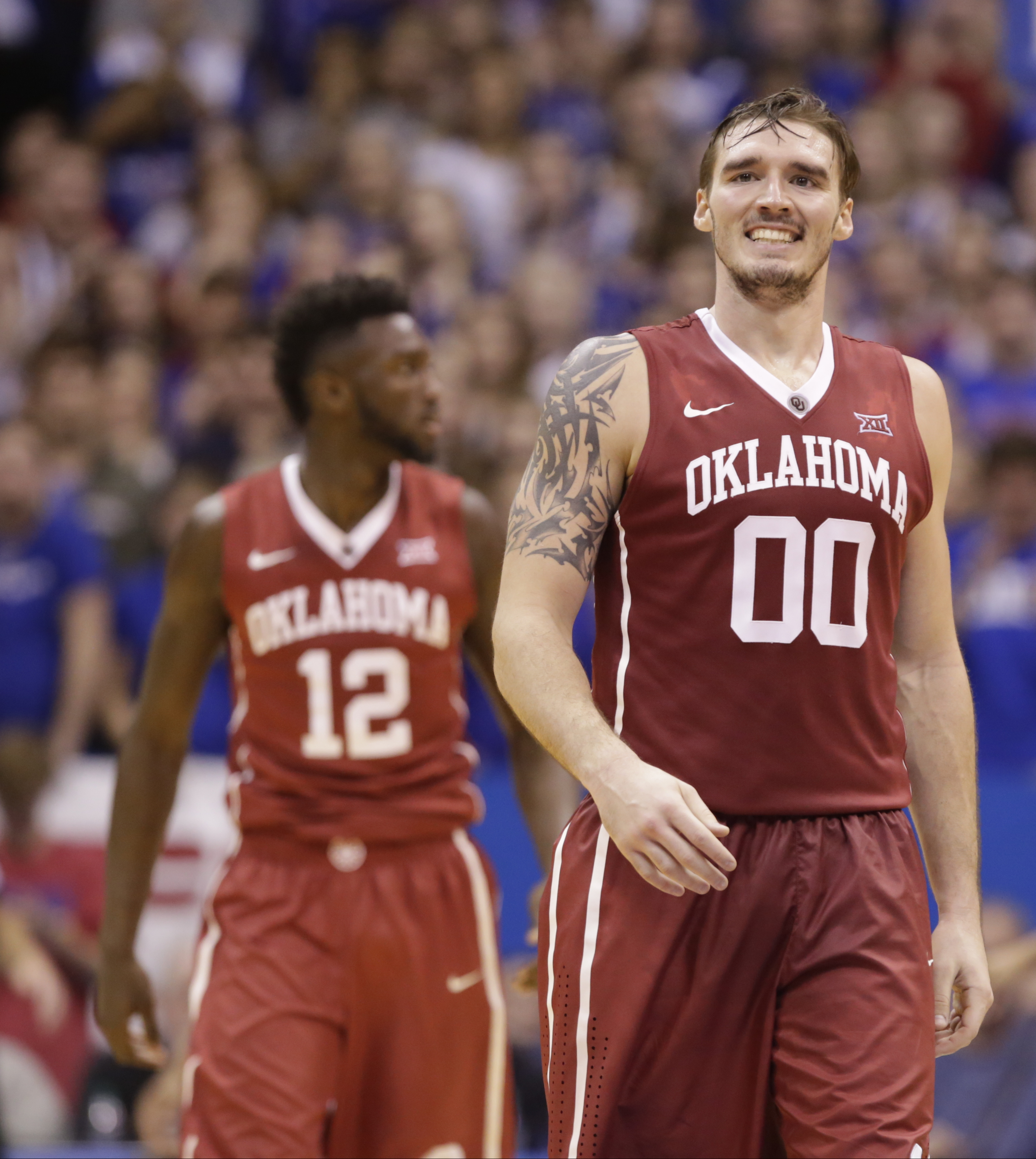 Oklahoma forward Ryan Spangler (00) grimaces after picking up a foul during the second half, Monday, Jan. 4, 2016 at Allen Fieldhouse.