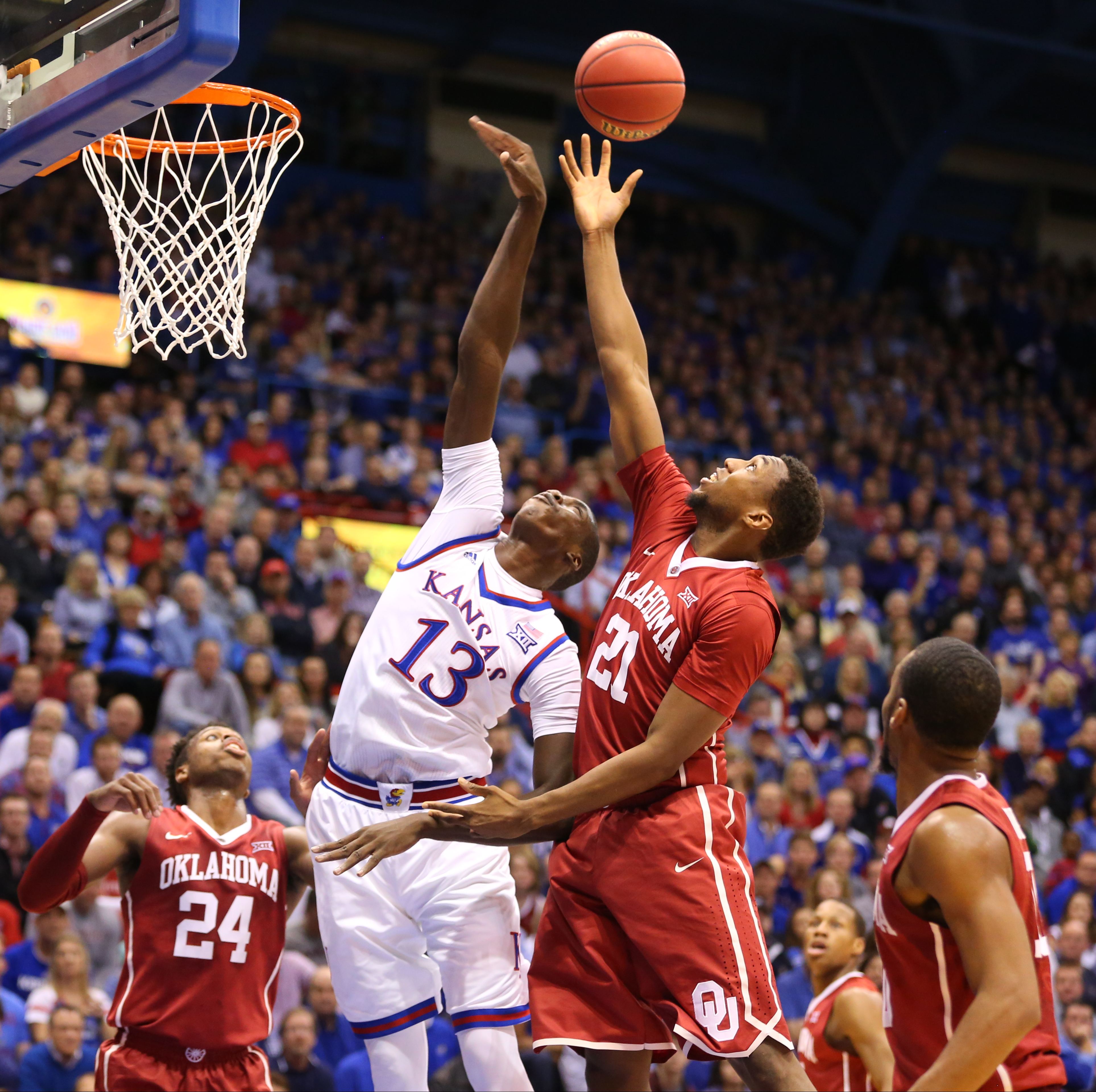 Kansas forward Cheick Diallo (13) tips a rebound out over Oklahoma forward Dante Buford (21) during the first half, Monday, Jan. 4, 2016 at Allen Fieldhouse. Also pictured are Oklahoma guard Buddy Hield (24) and guard Jordan Woodard, right.