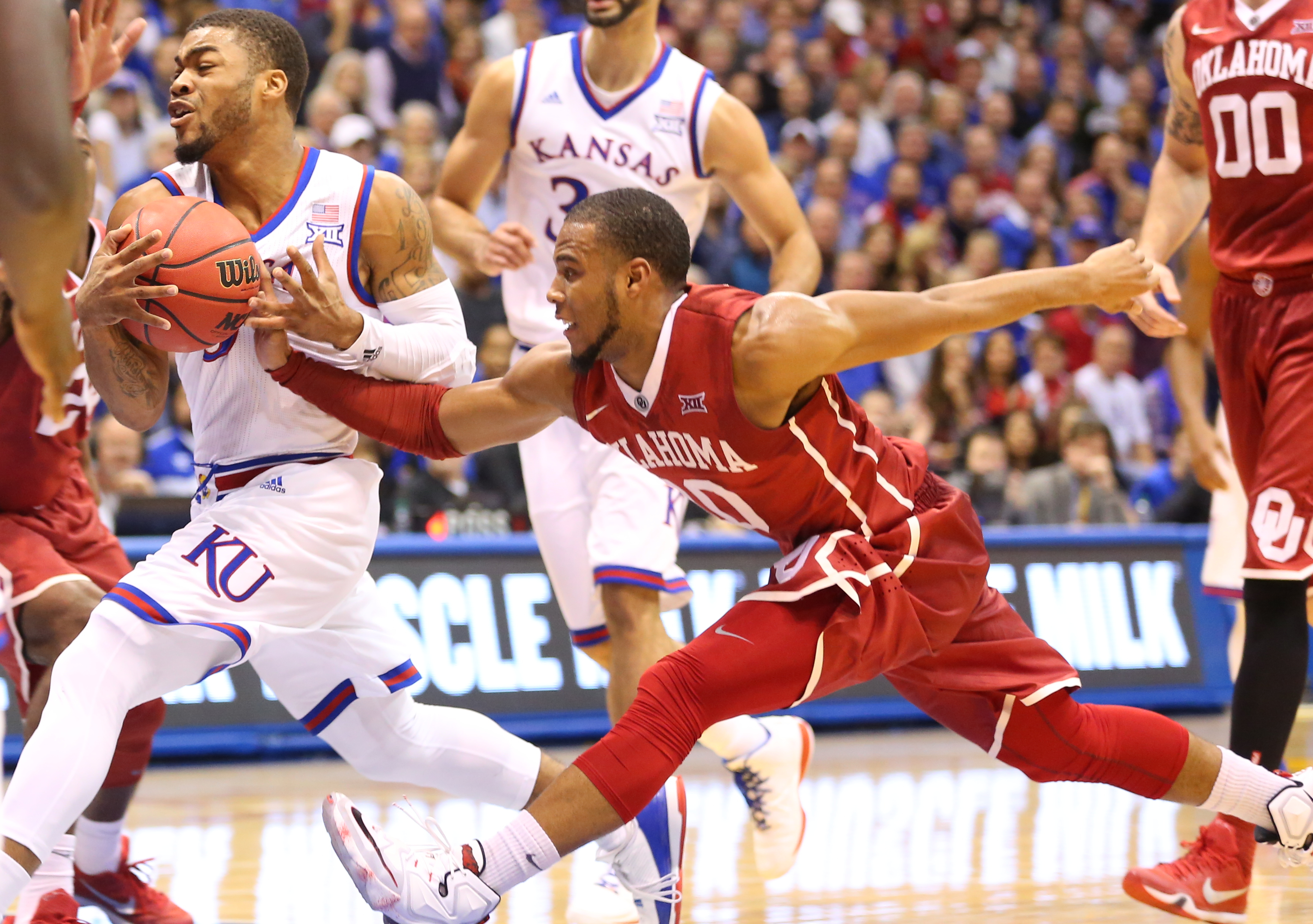 Kansas guard Wayne Selden Jr. (1) strips a ball from Oklahoma guard Buddy Hield (24) during the second half, Monday, Jan. 4, 2016 at Allen Fieldhouse.