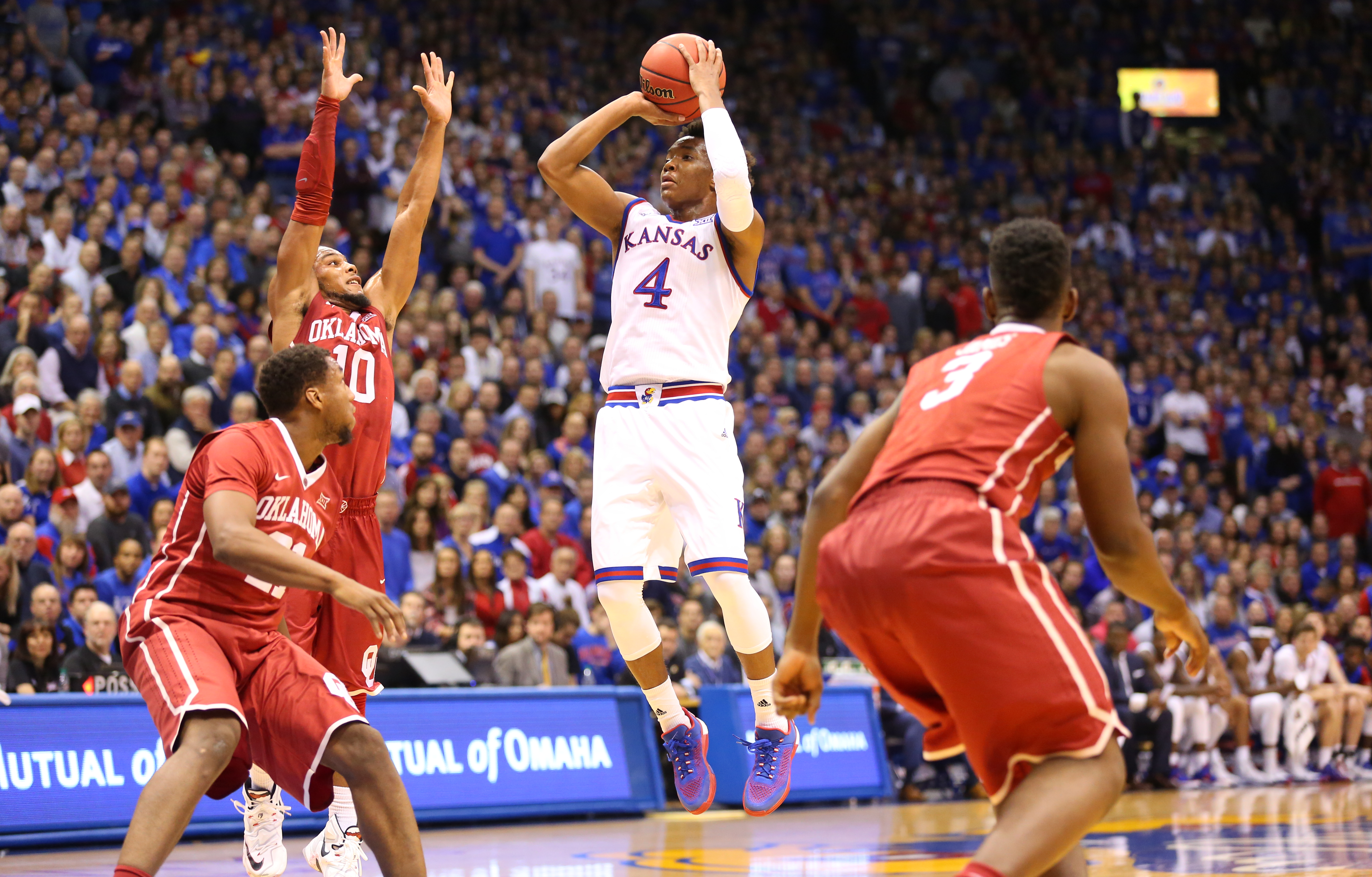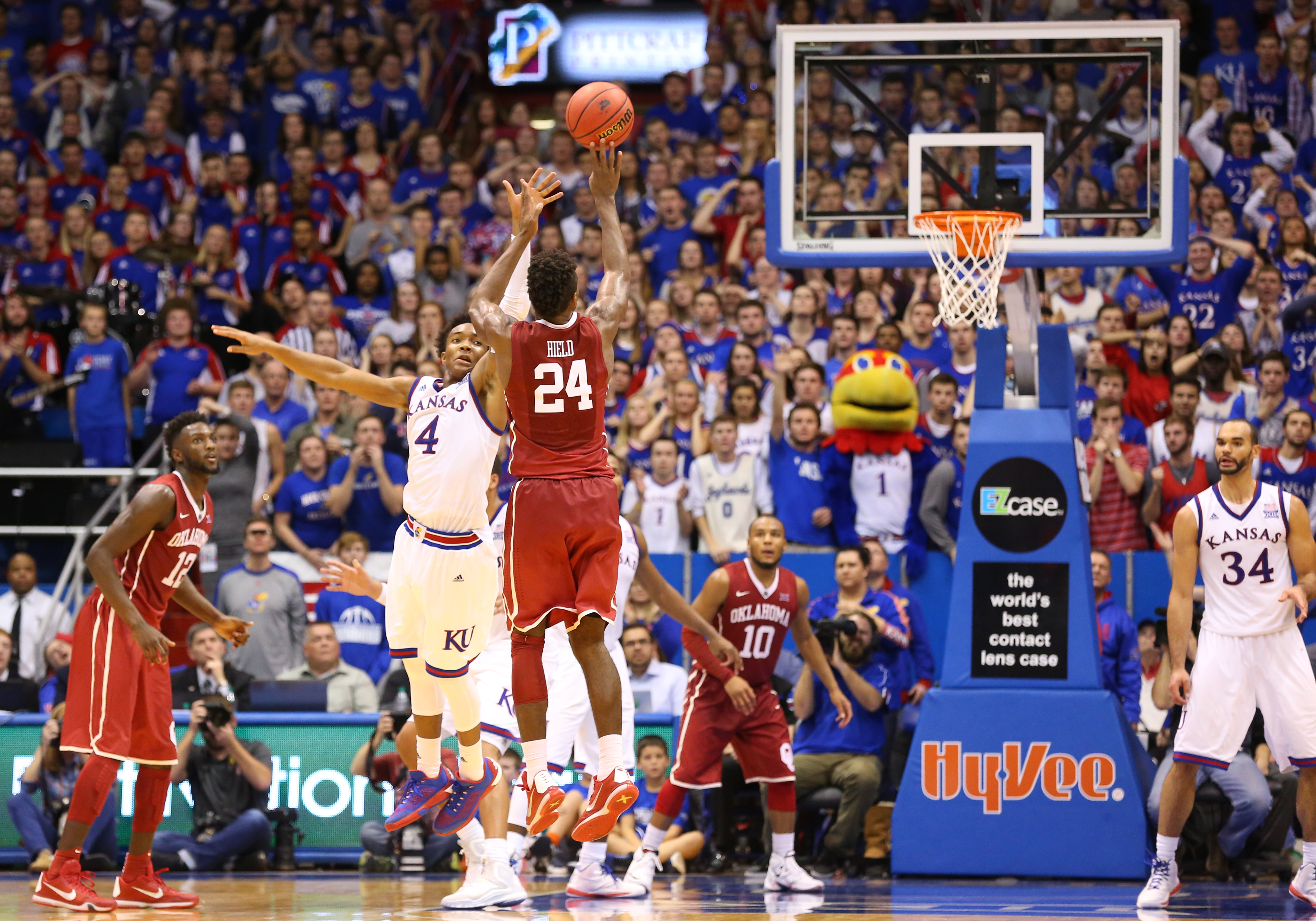Kansas guard Frank Mason III (0) defends against a three from Oklahoma guard Buddy Hield (24) during the second half, Monday, Jan. 4, 2016 at Allen Fieldhouse.