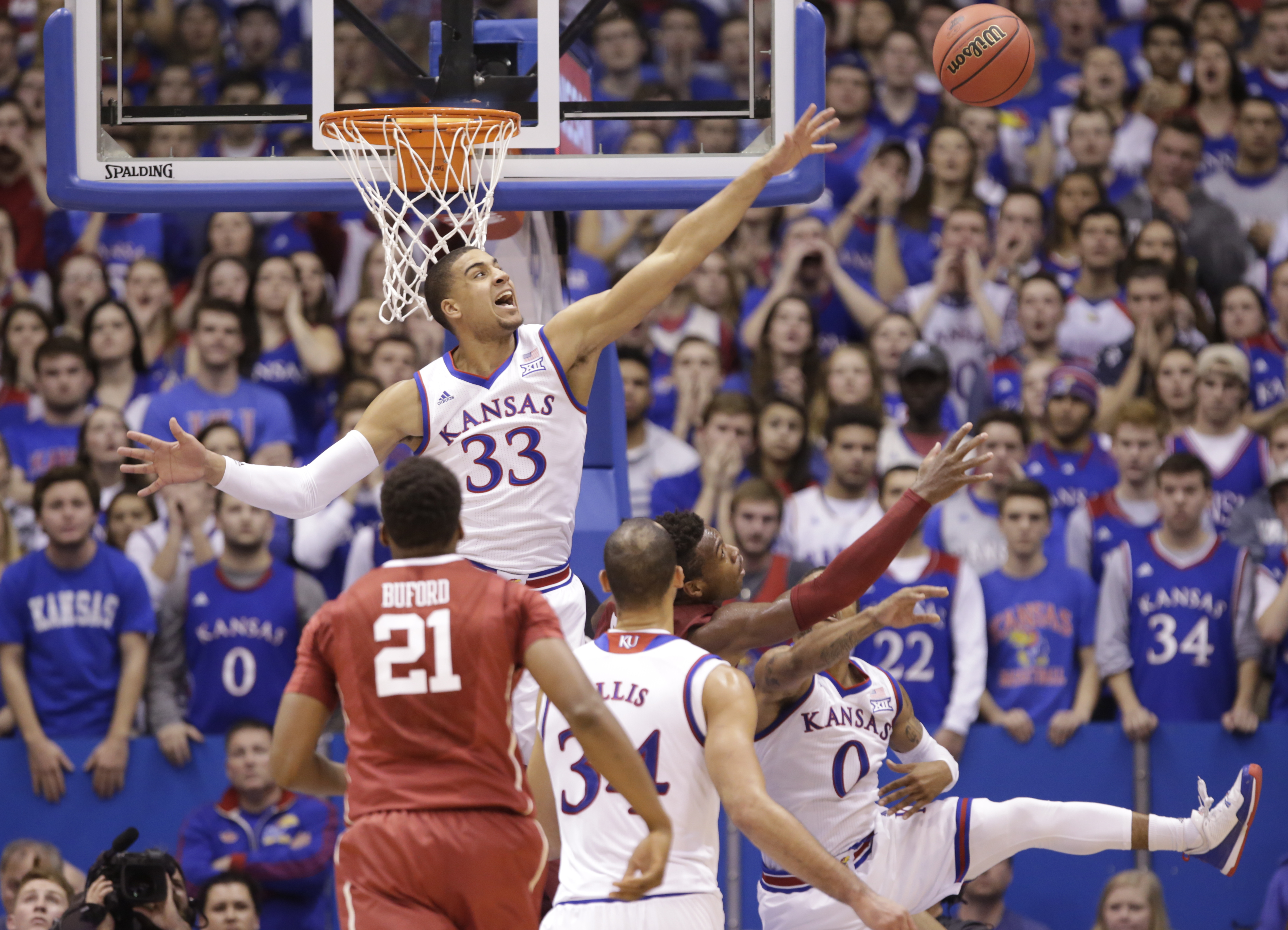 Kansas forward Landen Lucas (33) defends a shot from Oklahoma guard Buddy Hield (24) during the second half, Monday, Jan. 4, 2016 at Allen Fieldhouse.