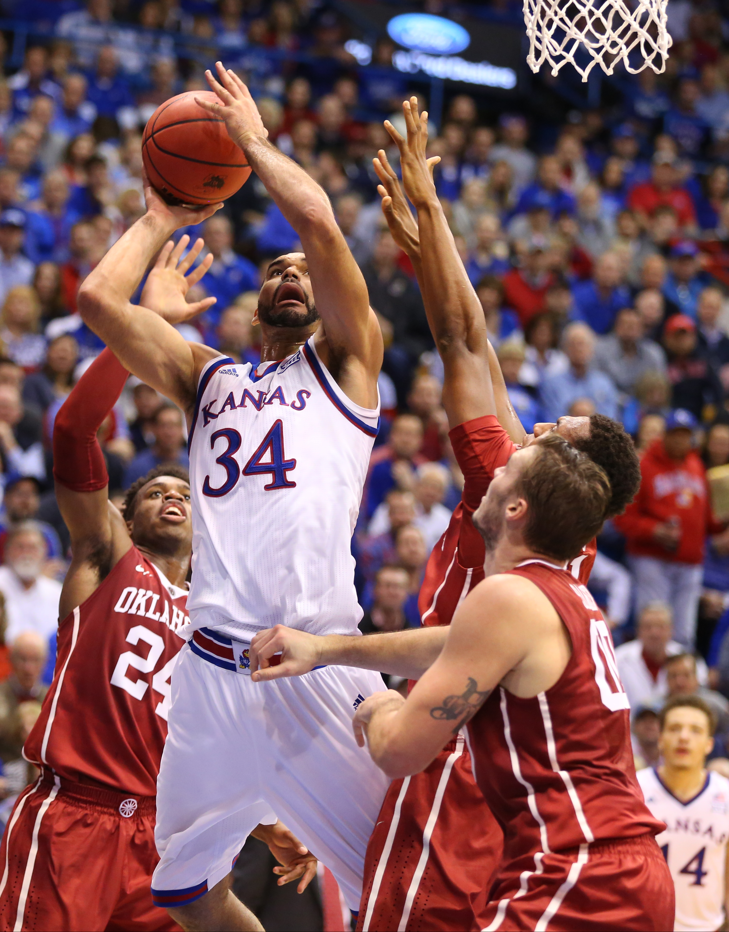 Kansas forward Perry Ellis (34) goes up for a bucket against Oklahoma guard Buddy Hield (24), forward Dante Buford (21) and forward Ryan Spangler (00) during the first half, Monday, Jan. 4, 2016 at Allen Fieldhouse.