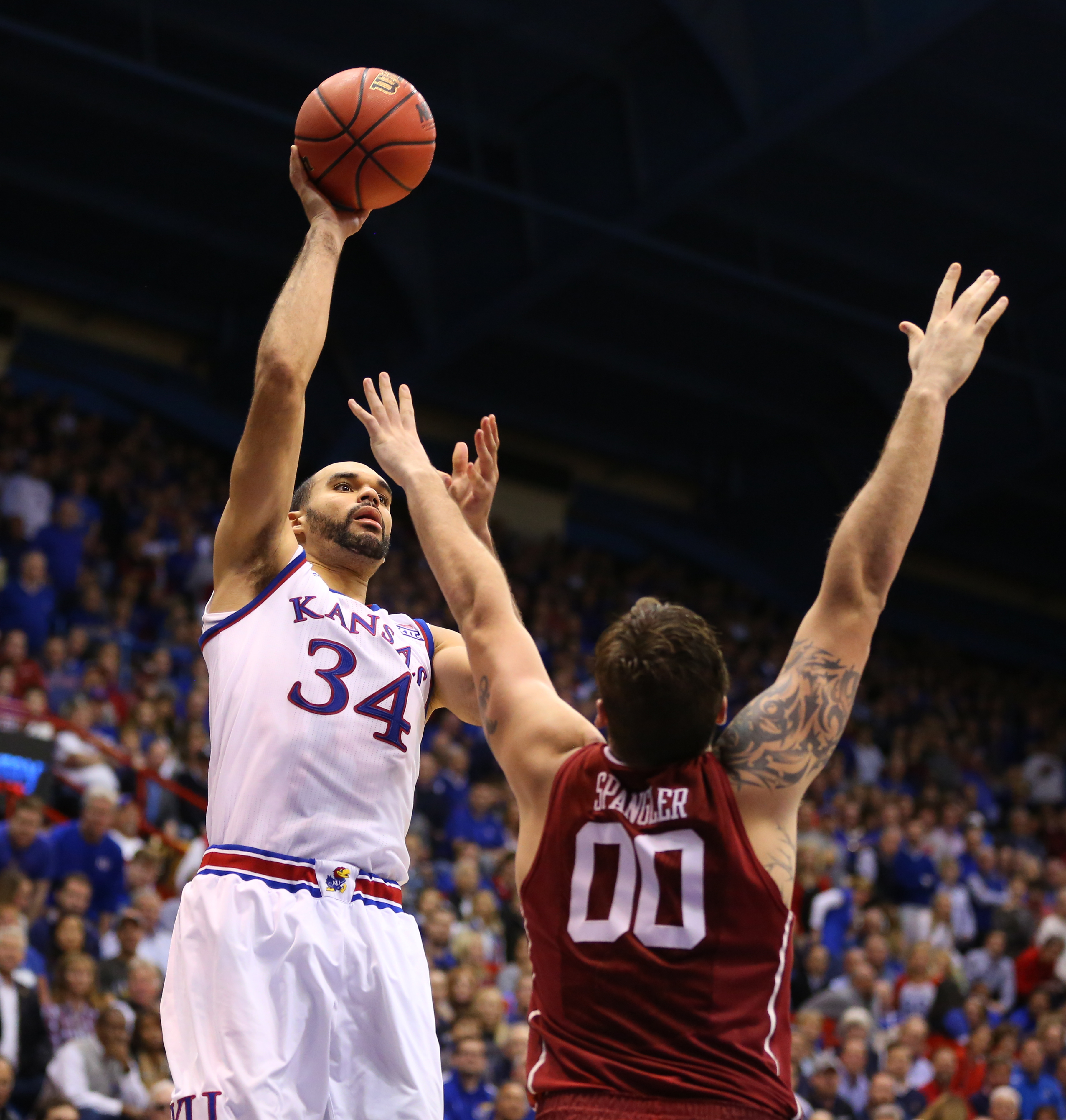 Kansas forward Perry Ellis (34) hoists a shot over Oklahoma forward Ryan Spangler (00) during the second half, Monday, Jan. 4, 2016 at Allen Fieldhouse.