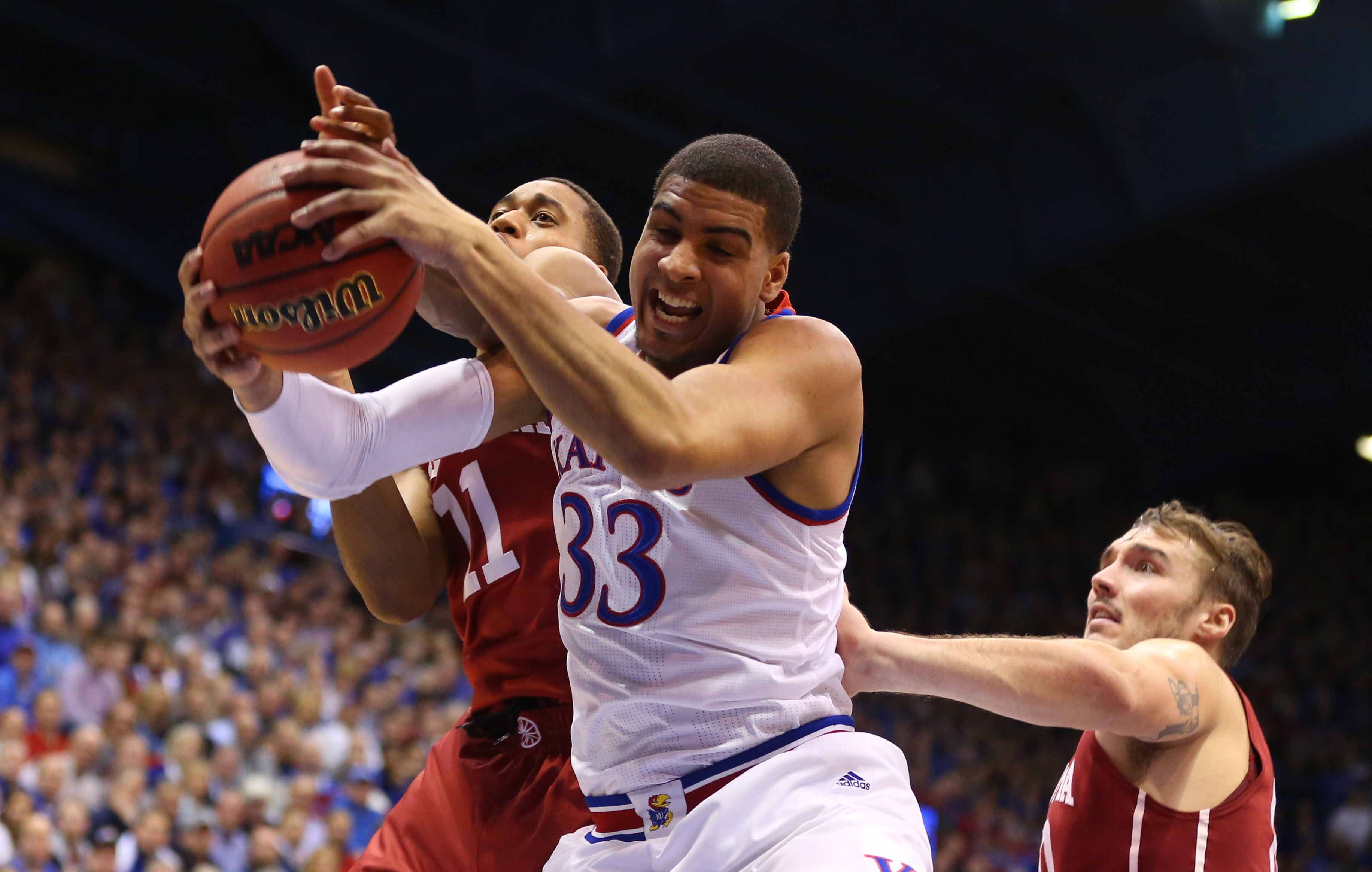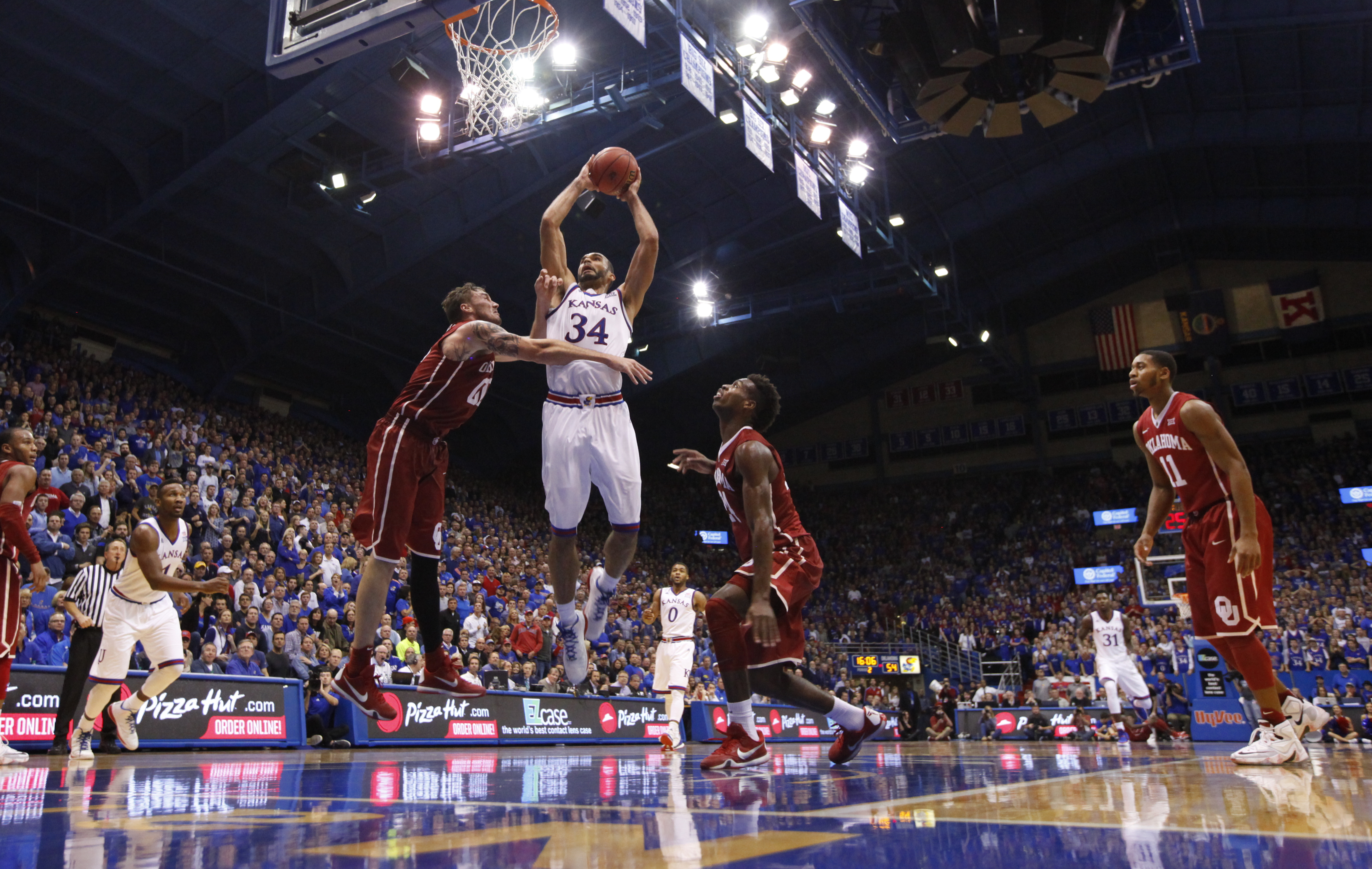 Kansas forward Landen Lucas (33) grabs a rebound from Oklahoma forward Dante Buford (21) during the second half, Monday, Jan. 4, 2016 at Allen Fieldhouse. At right is Oklahoma forward Ryan Spangler (00).