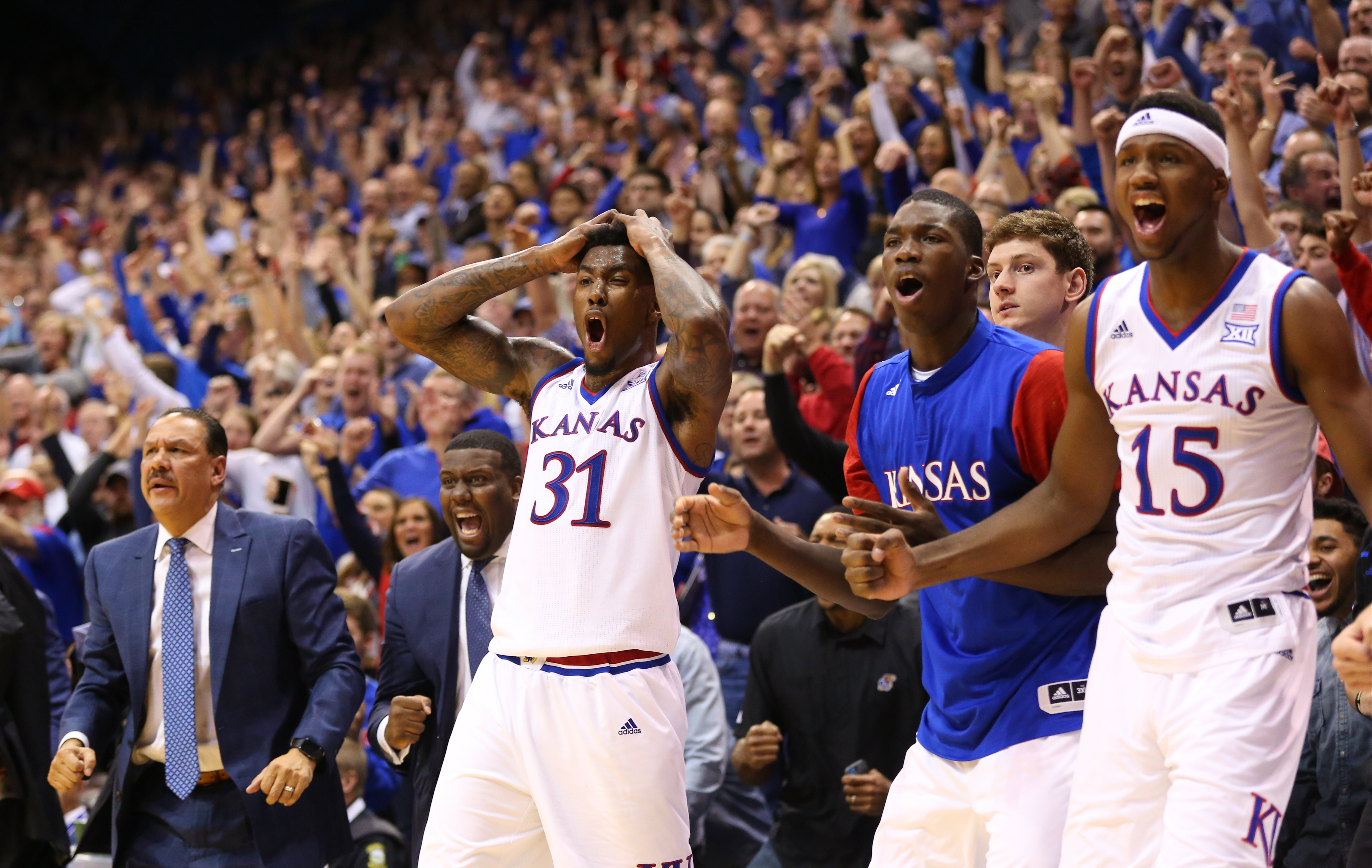 Kansas forward Jamari Traylor (31), forward Cheick Diallo (13) and forward Carlton Bragg Jr. (15) react to an and-one bucket by guard Devonte' Graham (4) to tie the game during the second half, Monday, Jan. 4, 2016 at Allen Fieldhouse.