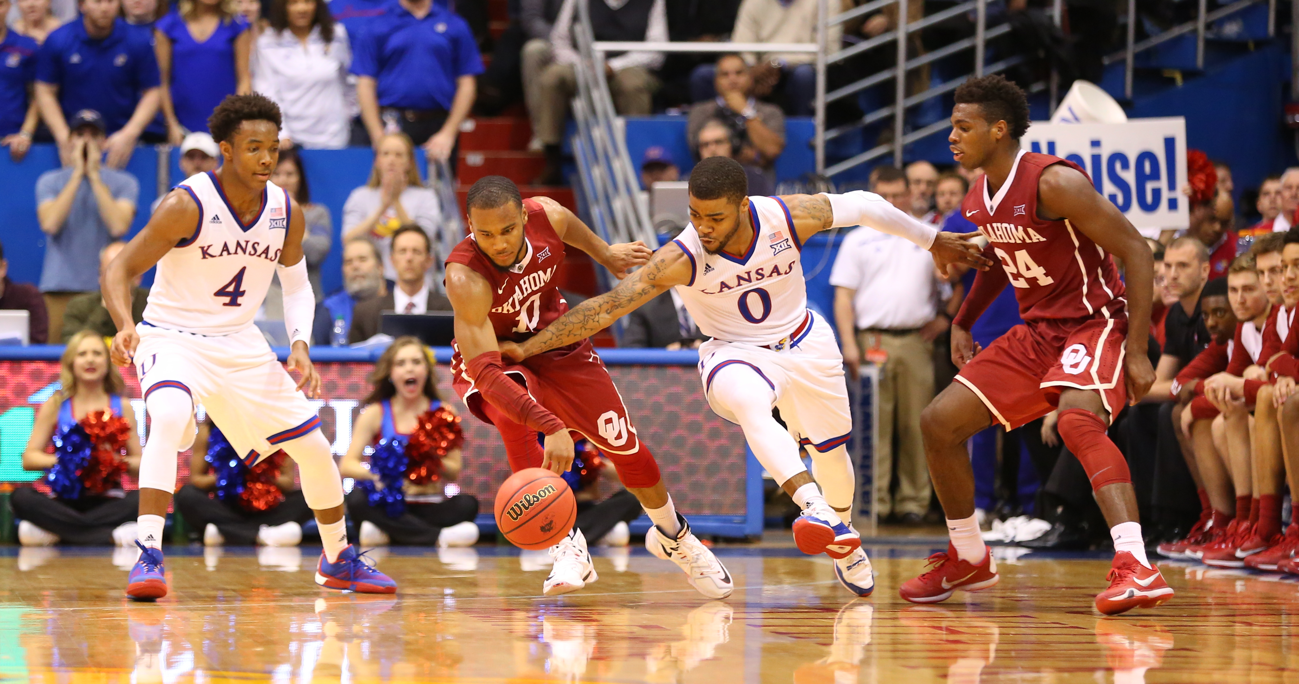 Kansas guard Frank Mason III (0) tries to steal the ball from Oklahoma guard Jordan Woodard (10) during the second half, Monday, Jan. 4, 2016 at Allen Fieldhouse. Also pictured are Kansas guard Devonte' Graham (4) and Oklahoma guard Buddy Hield (24).