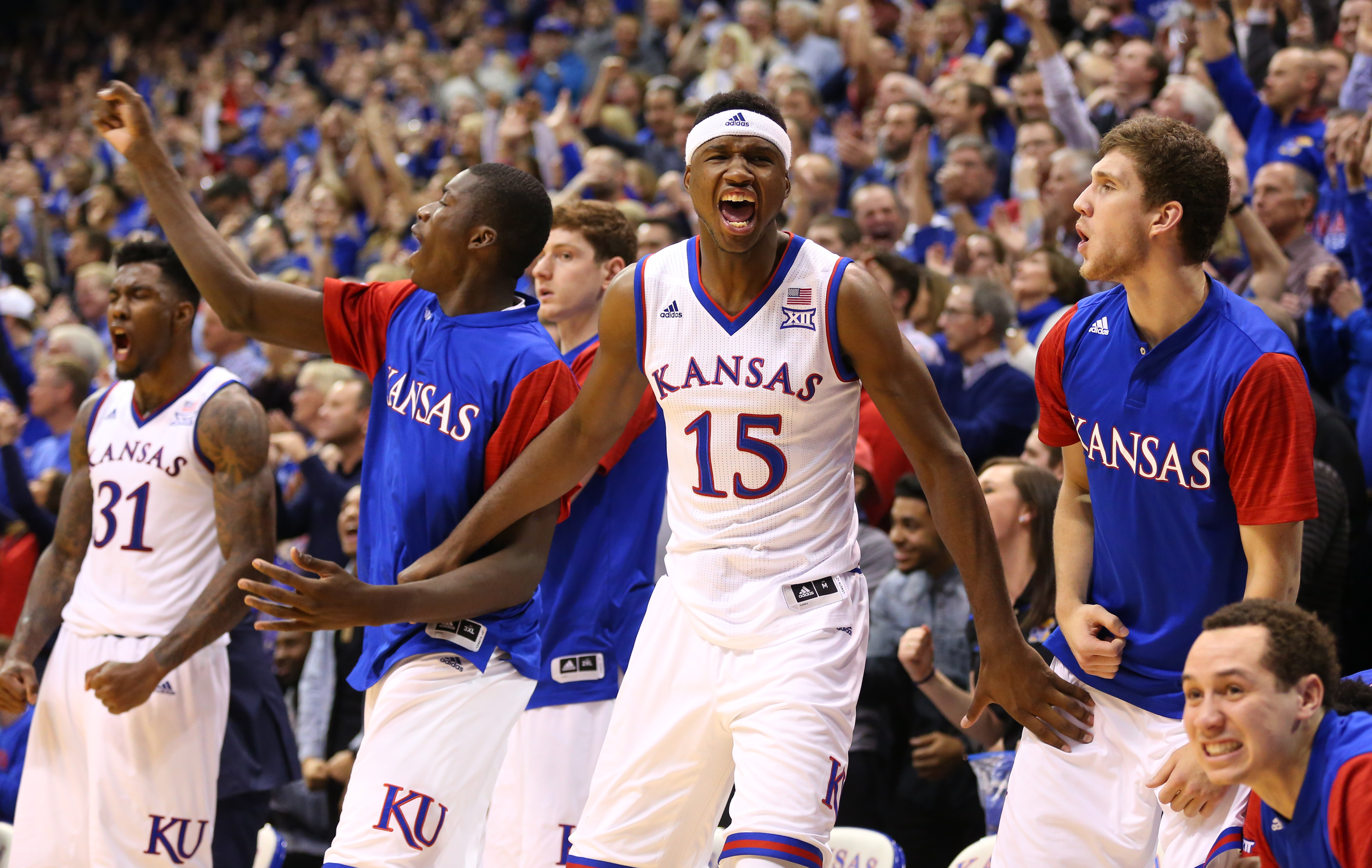Kansas forward Carlton Bragg Jr. (15) and the Jayhawk bench react to a Jayhawk bucket late in the second half, Monday, Jan. 4, 2016 at Allen Fieldhouse.