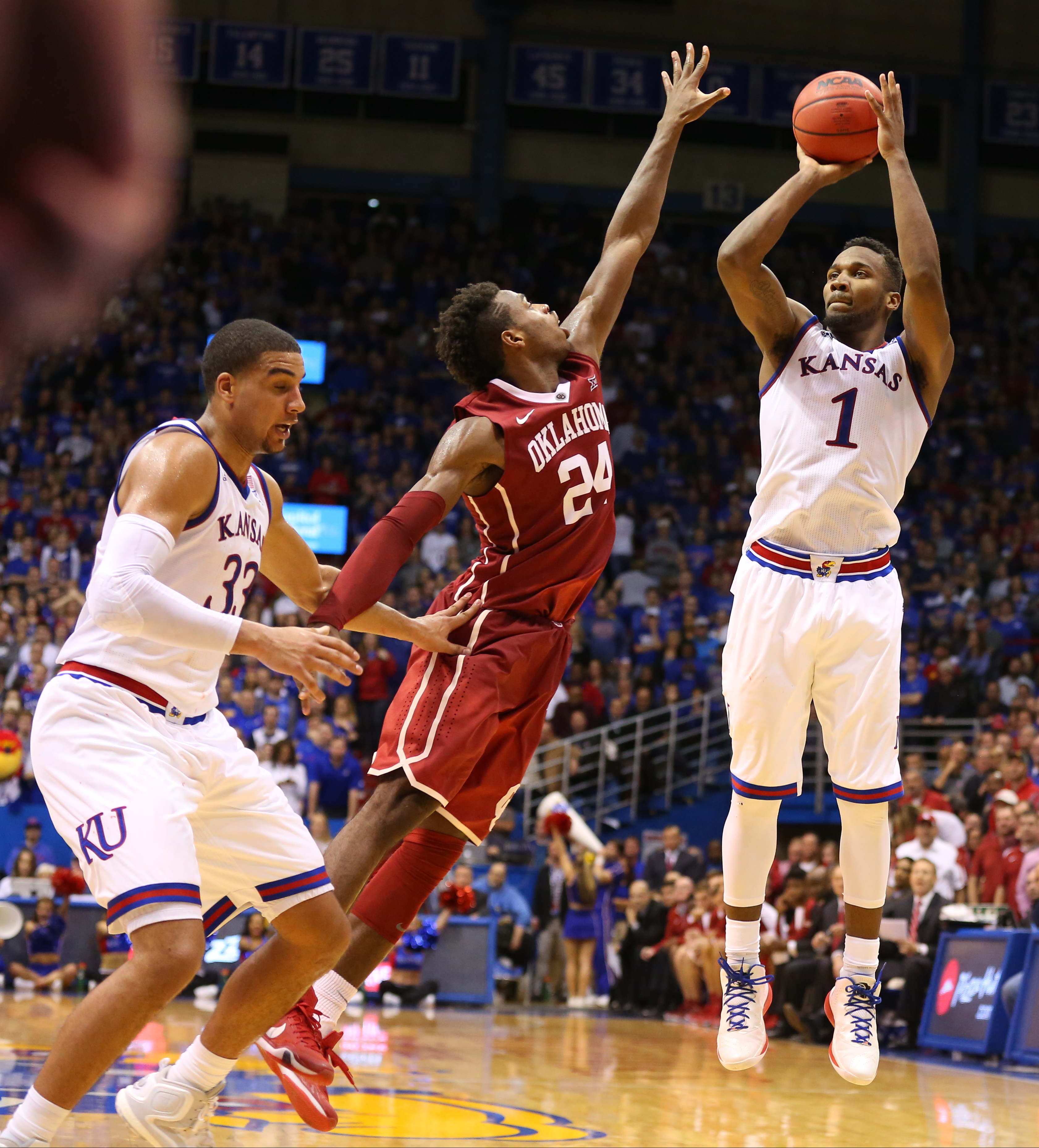 Kansas guard Wayne Selden Jr. (1) is fouled by Oklahoma guard Buddy Hield (24) on a three during third overtime, Monday, Jan. 4, 2016 at Allen Fieldhouse.
