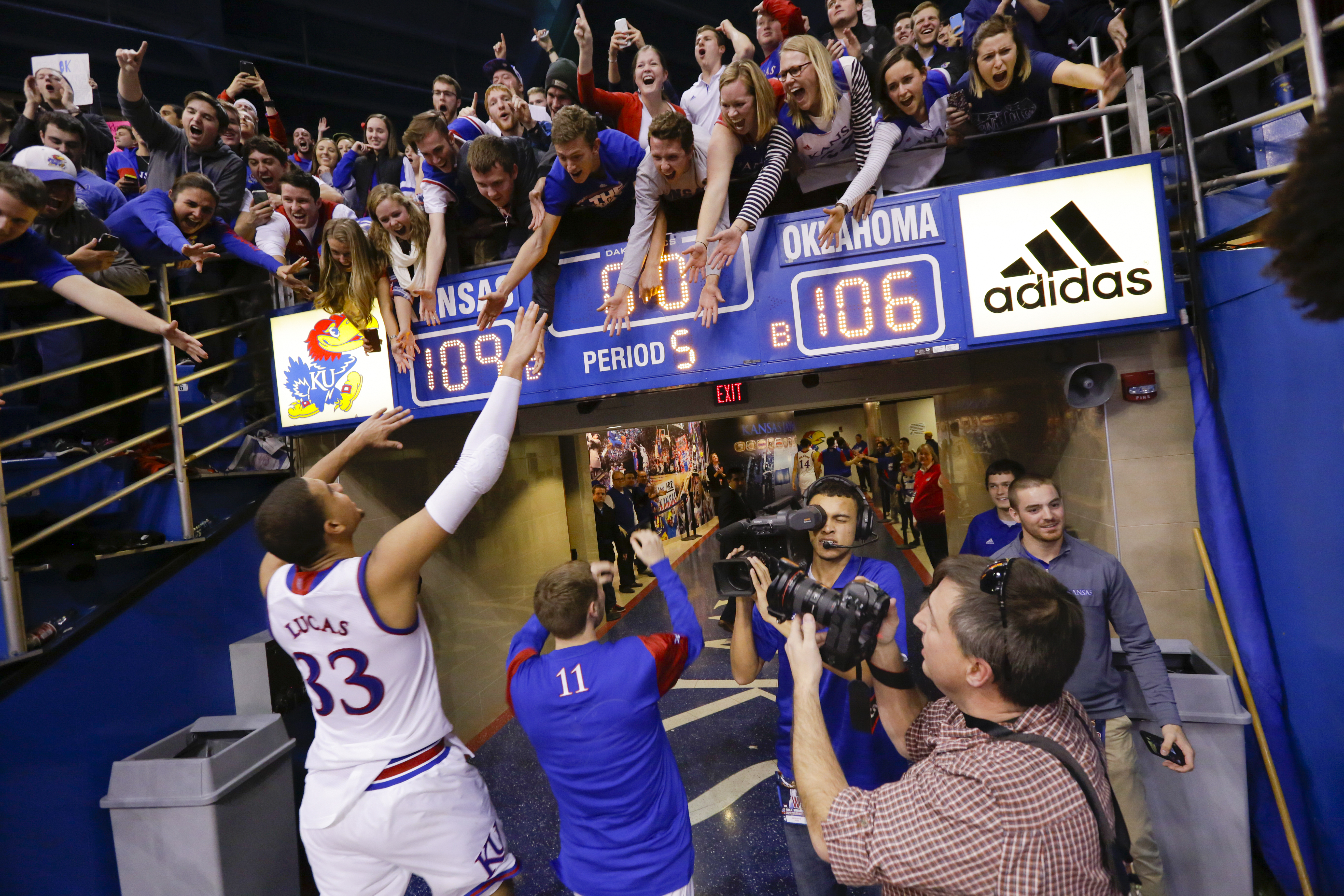 Kansas forward Landen Lucas (33) salutes the fans as he leaves the court following the Jayhawks' 109-106 triple overtime win over the Sooners.
