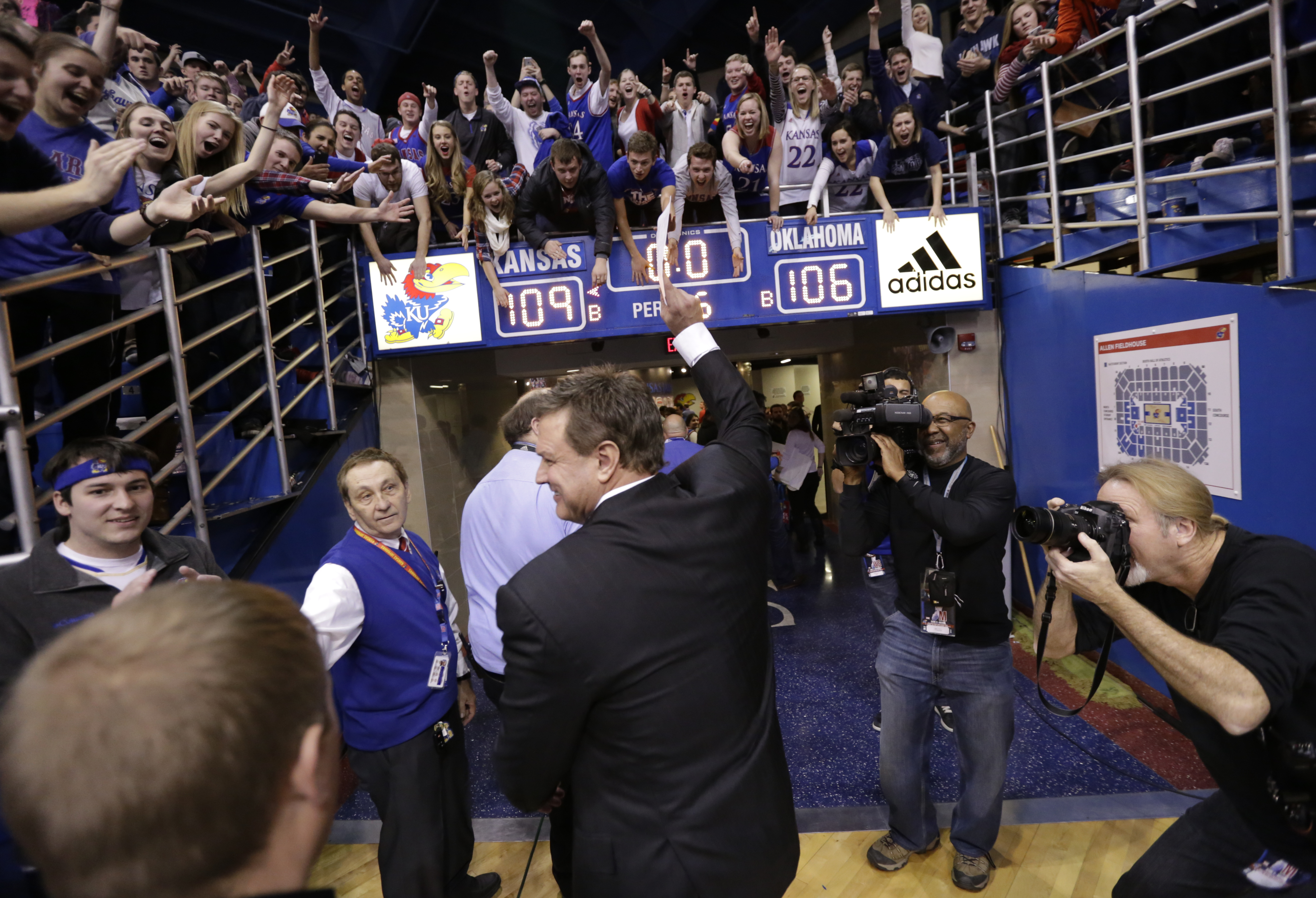 Kansas head coach Bill Self flashes a smile as he leaves the court following the Jayhawks' 109-106 triple overtime win over the Sooners.