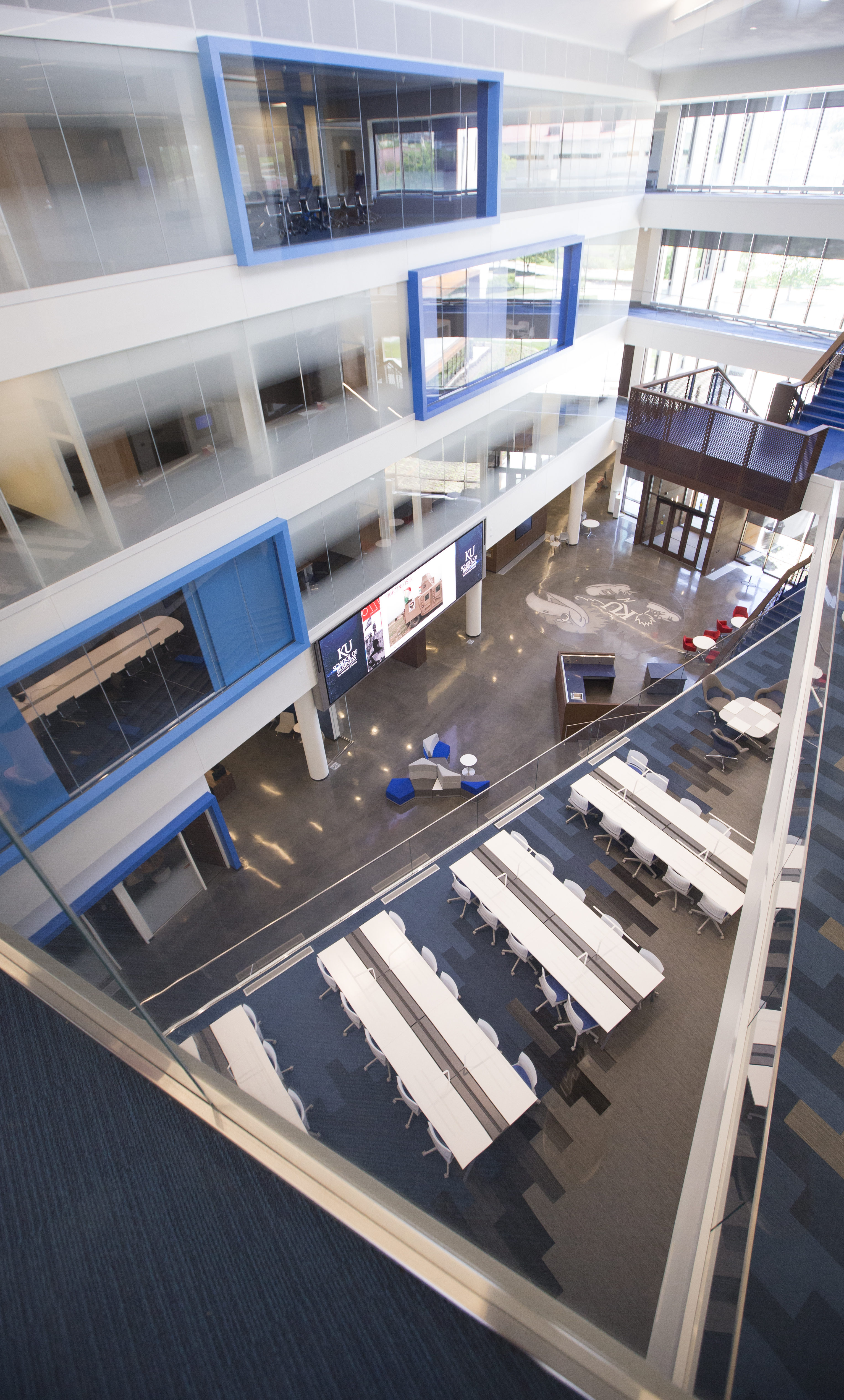 The atrium at Capitol Federal Hall viewed from the fourth floor on Tuesday, May 10, 2016. Just below on the third floor is a teaching assistant help area.