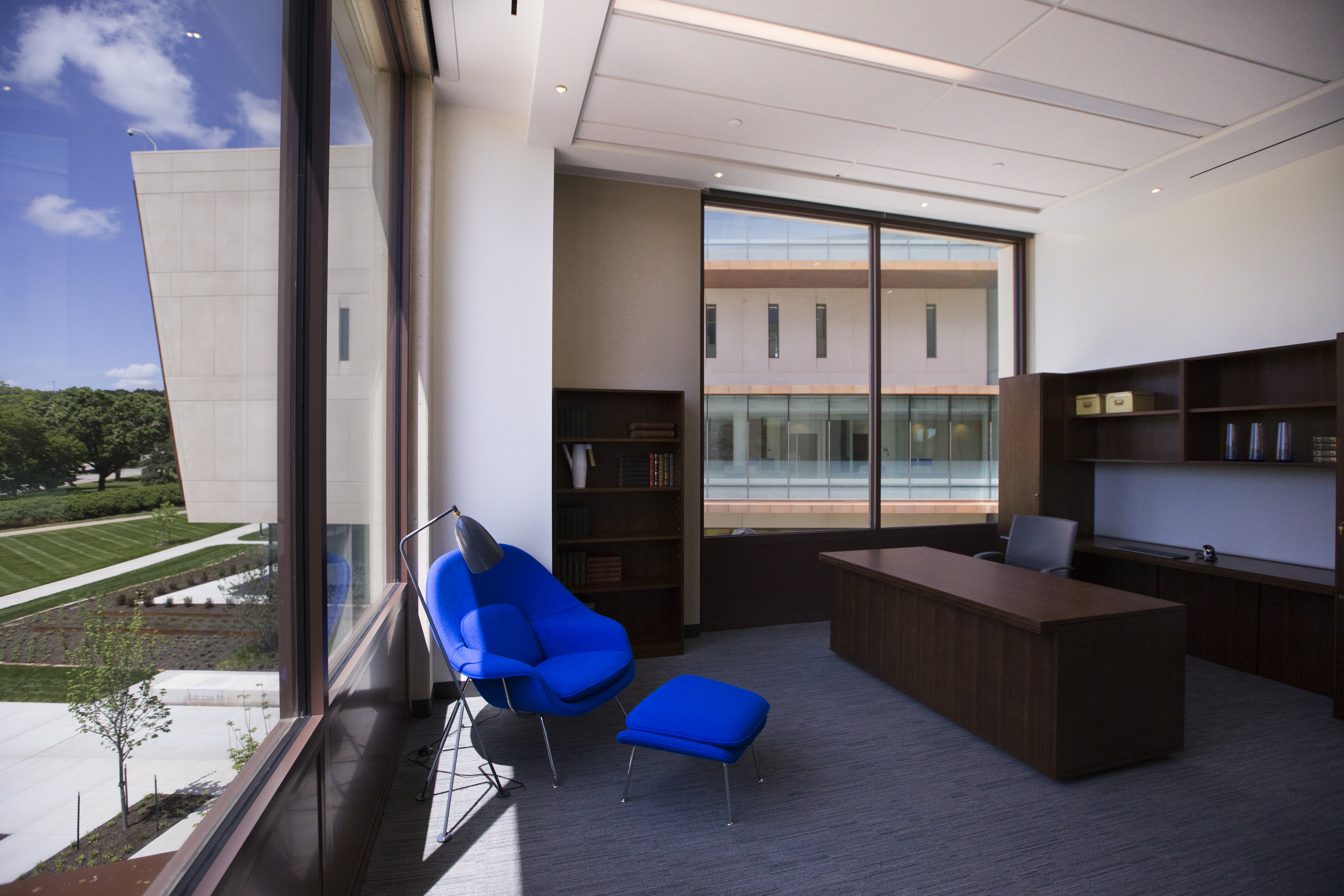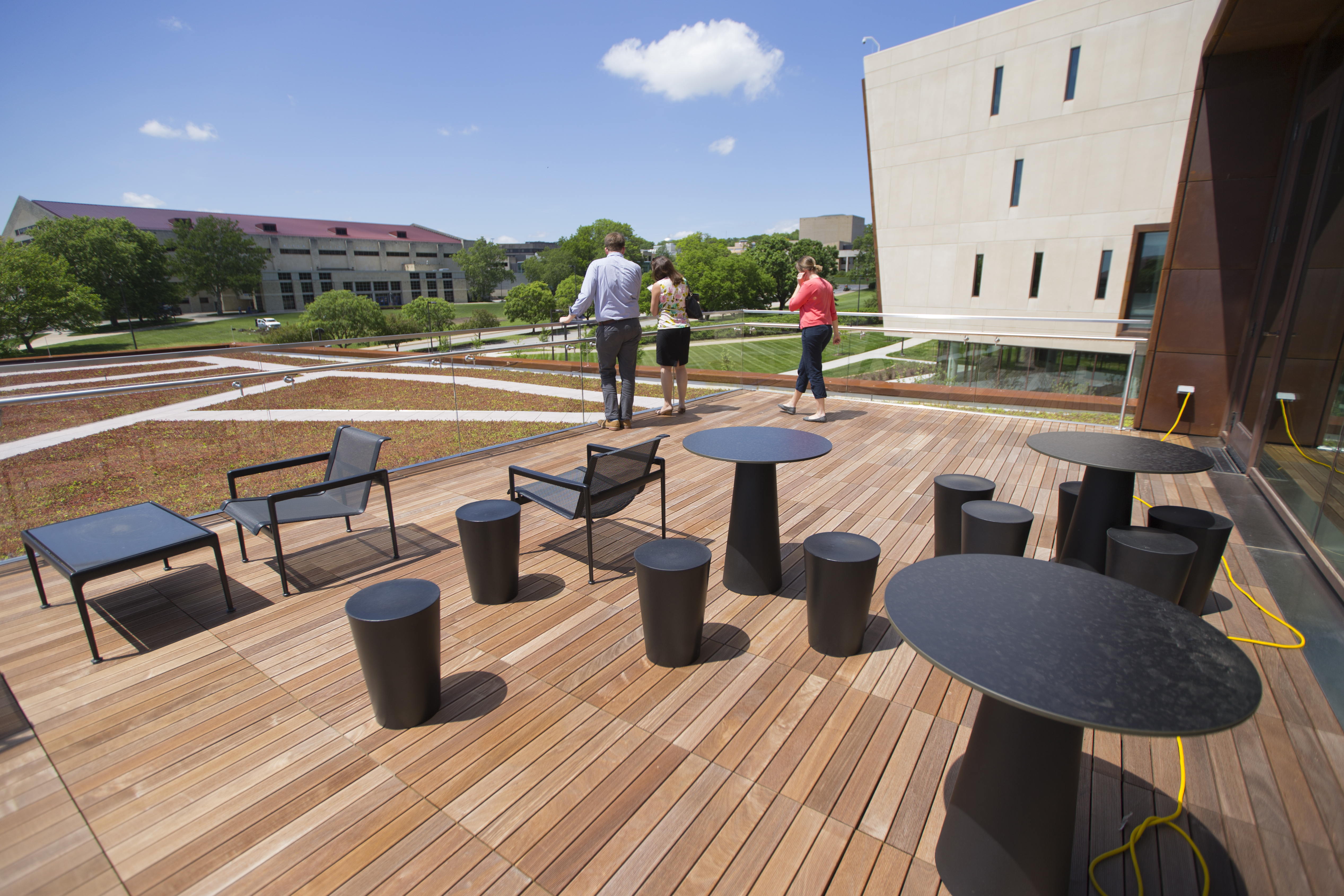 A deck overlooking the green roof at Capitol Federal Hall can be used by students for studying.
