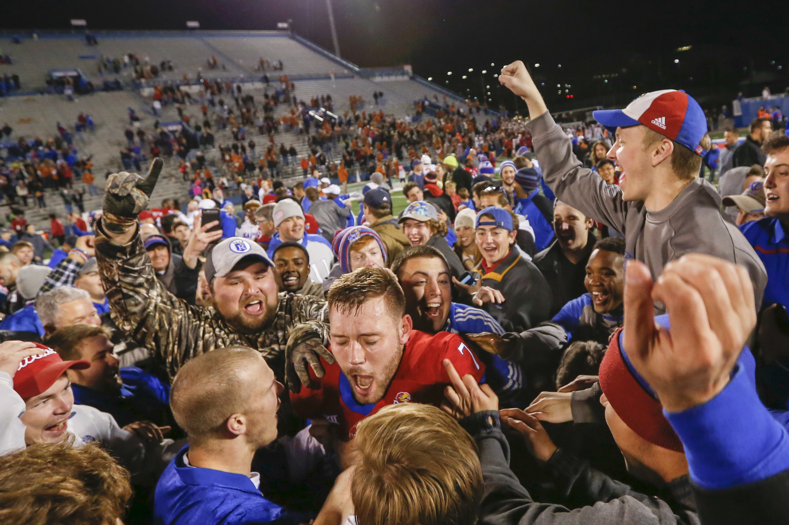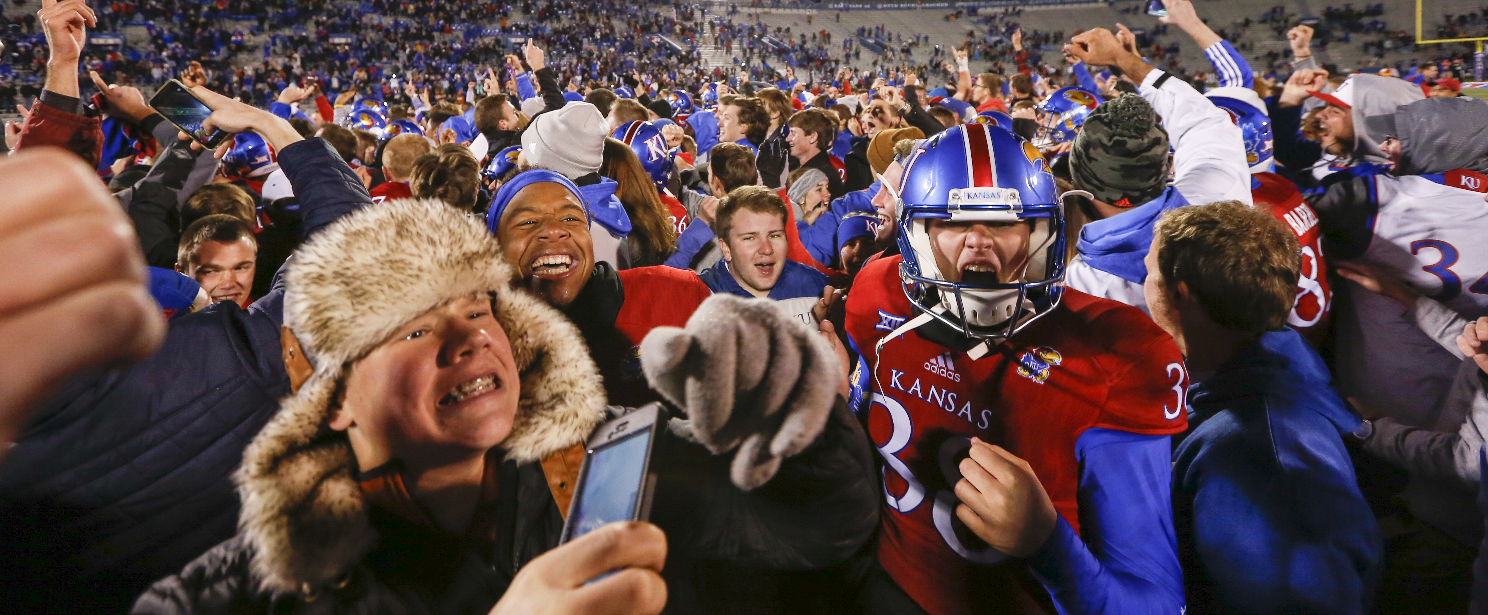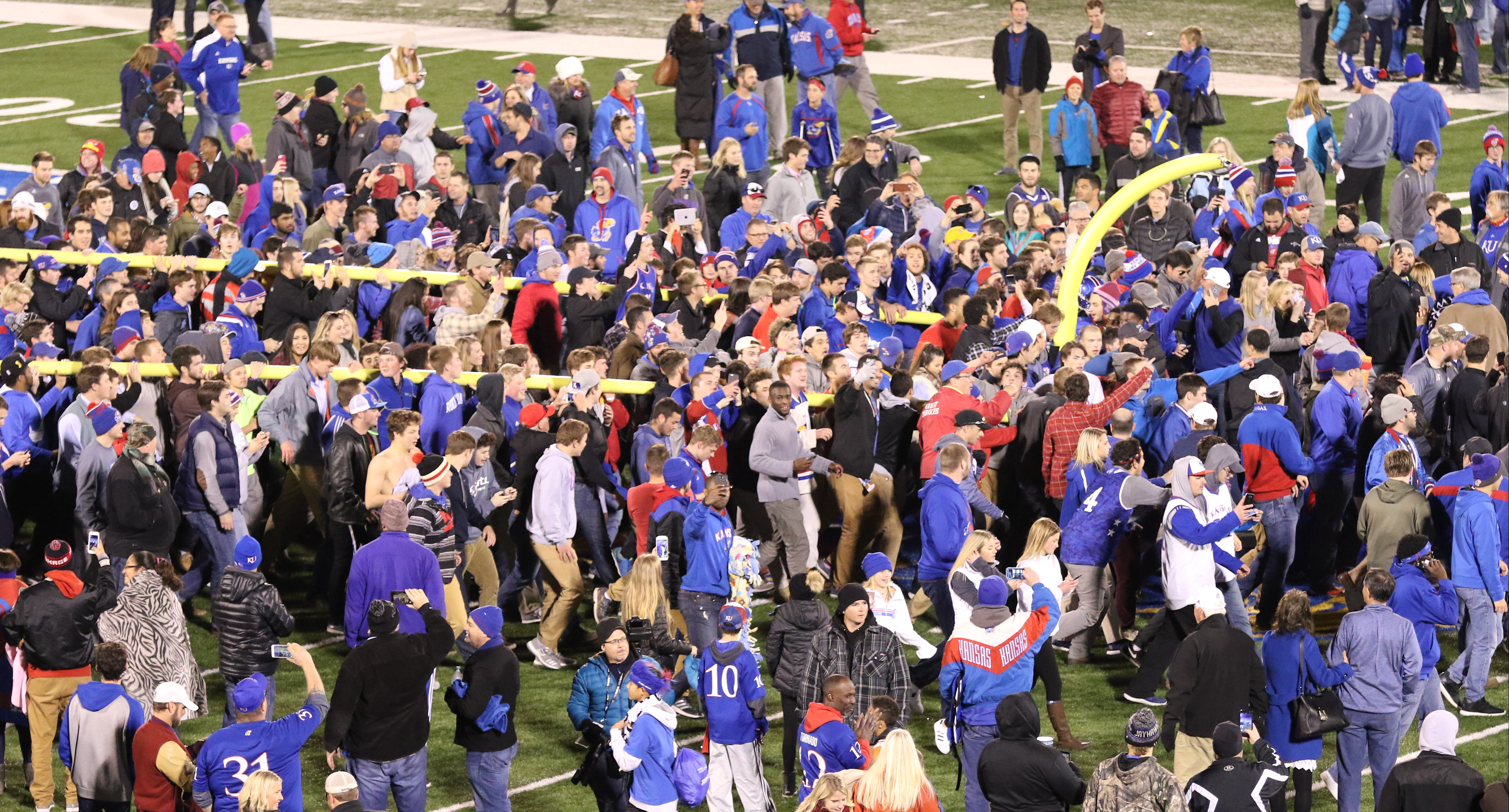 Kansas fans and players go crazy on the field following the Jayhawks' 24-21 overtime upset of Texas on Saturday, Nov. 19, 2016 at Memorial Stadium.