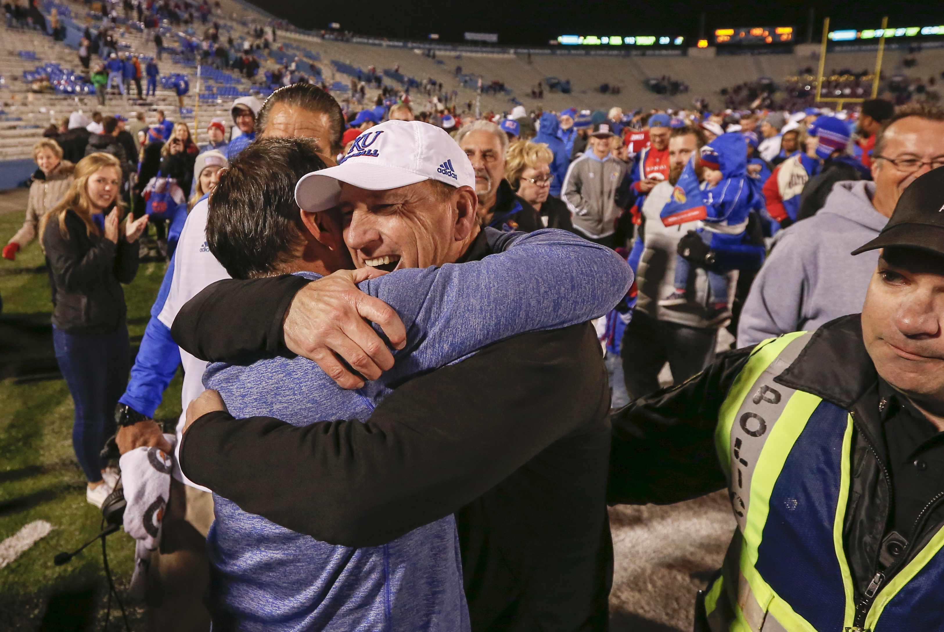 Kansas head coach David Beaty gets a hug from Kansas volleyball head coach Ray Bechard following the Jayhawks' 24-21 overtime upset of Texas on Saturday, Nov. 19, 2016 at Memorial Stadium. Saturday's victory was Beaty's first Big 12 coaching win. Bechard's volleyball team clinched a share of the Big 12 conference title with a win against Iowa State earlier in the day.