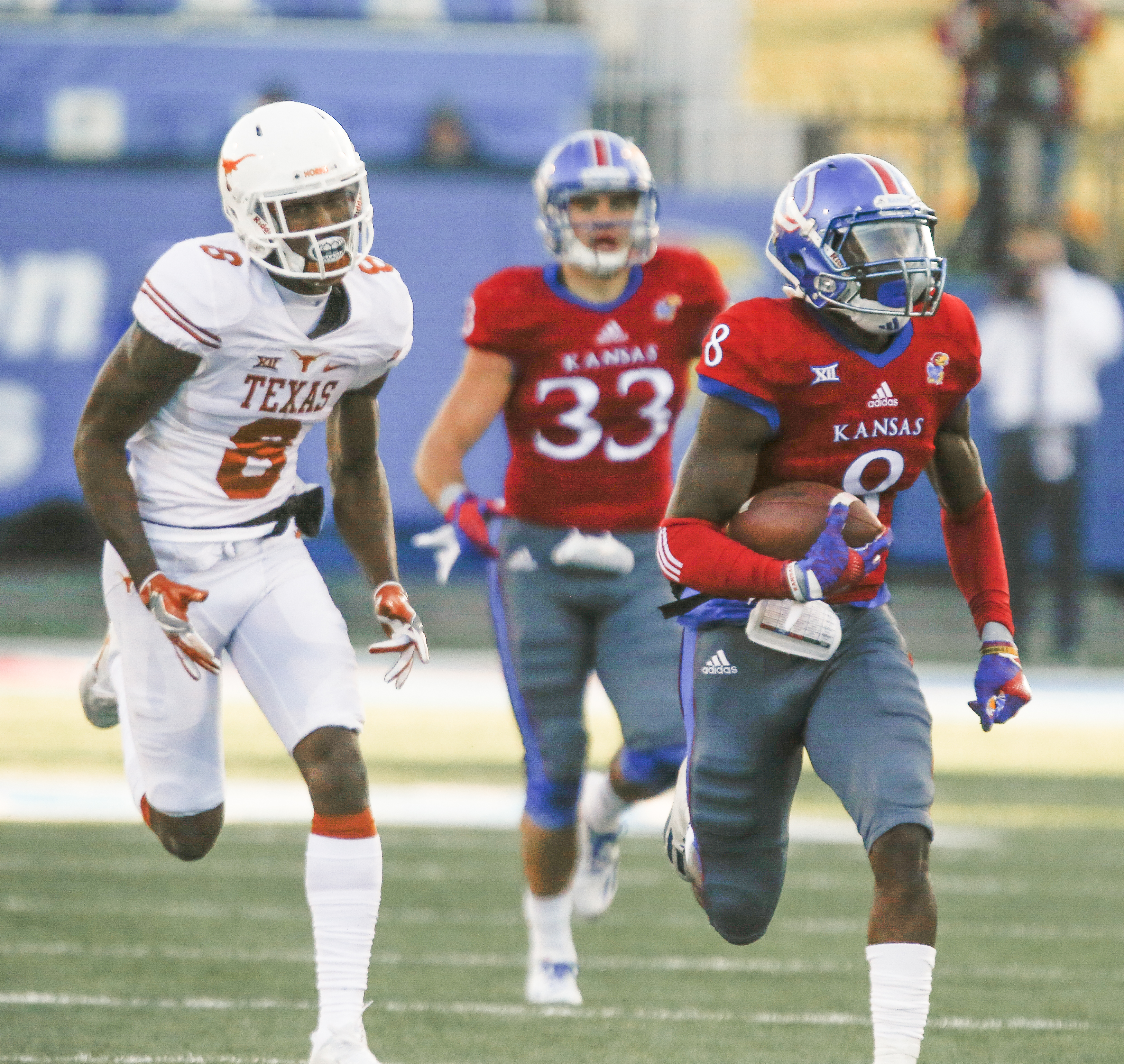Texas quarterback Logan Vinklarek (11) heads for then end zone past Kansas cornerback Marnez Ogletree (10) and Kansas safety Tevin Shaw (30) on the first play from scrimmage during the first quarter on Saturday, Nov. 19, 2016 at Memorial Stadium.
