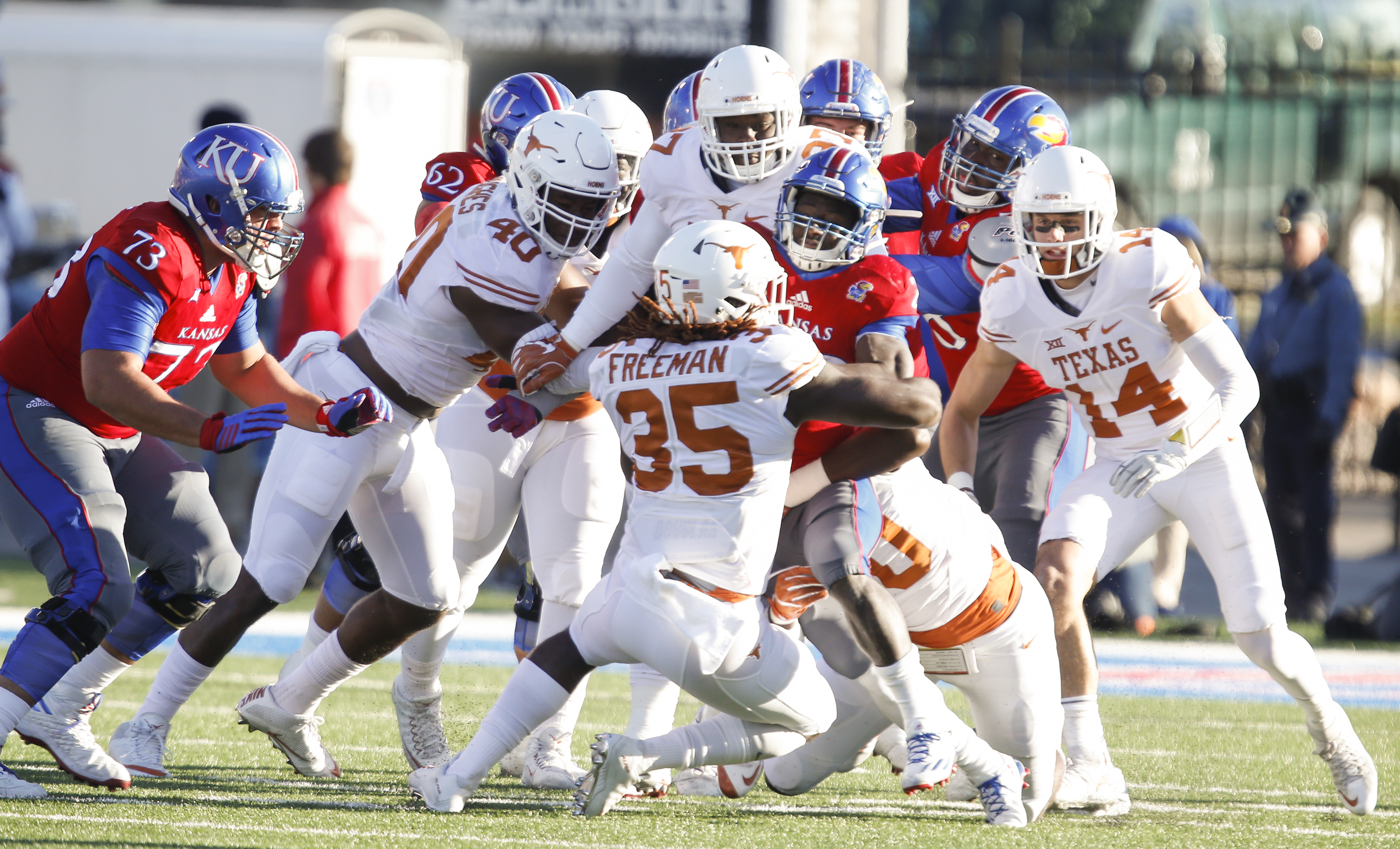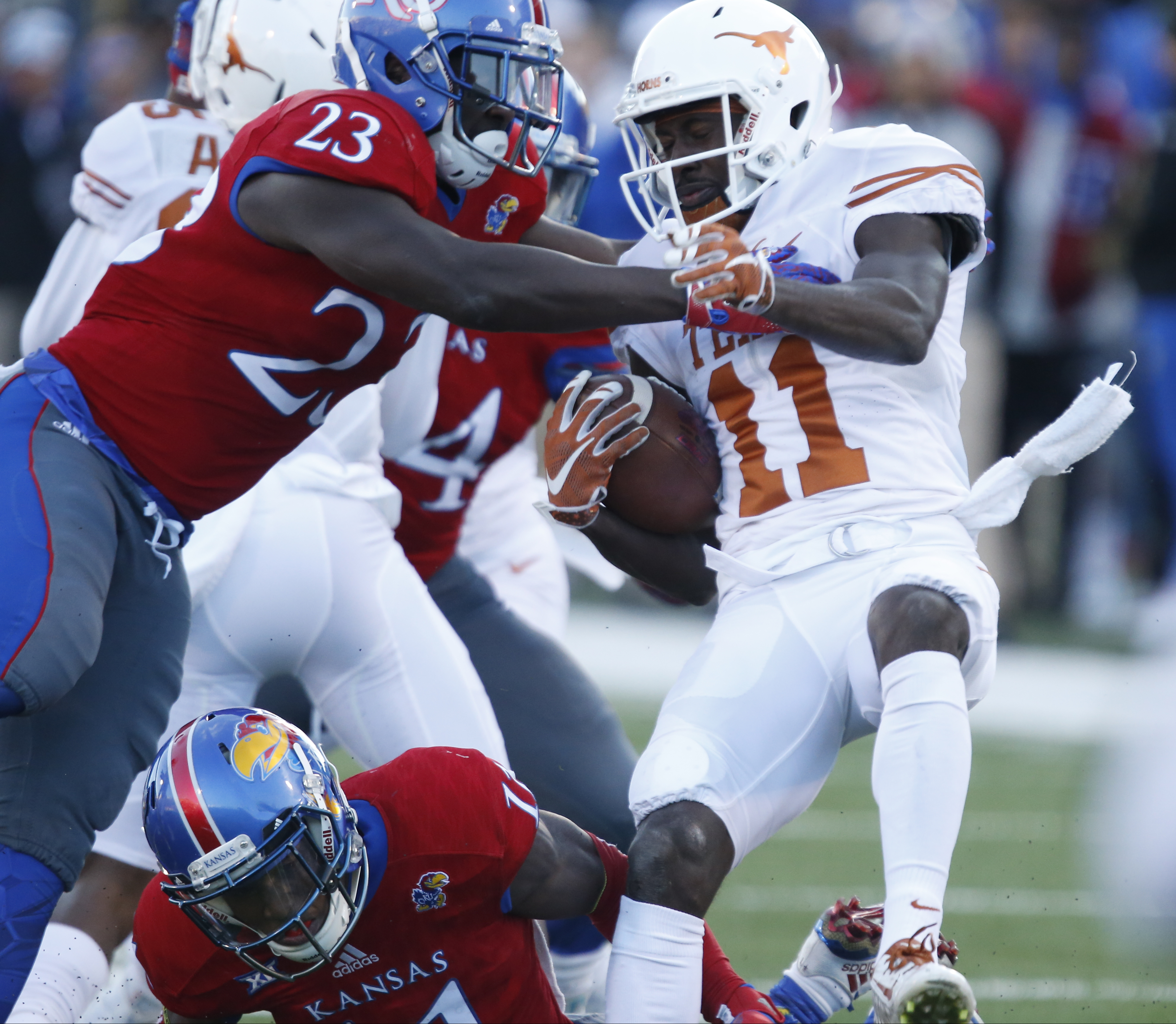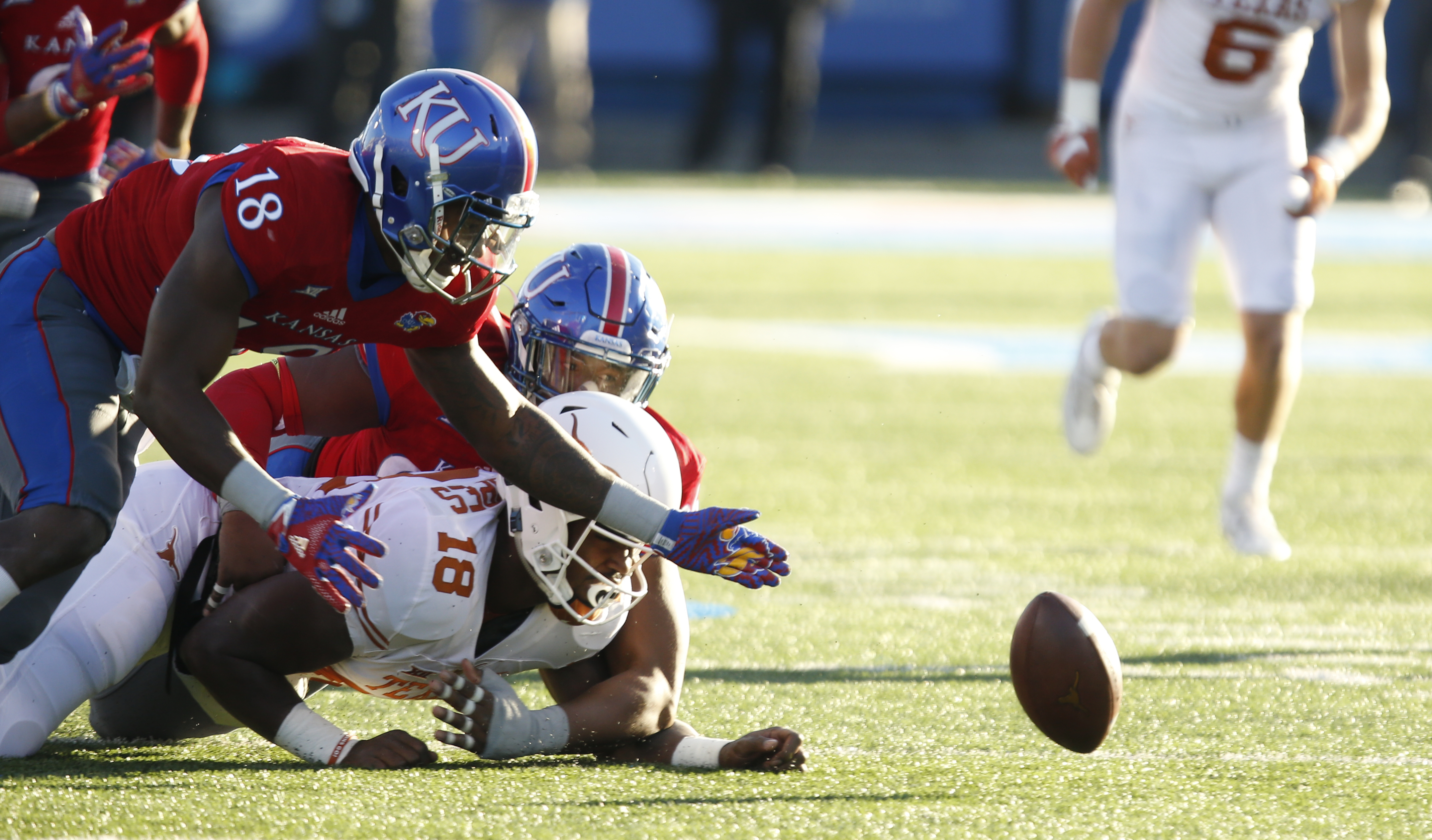 Kansas linebacker Denzel Feaster (18) looks for a fumble dropped by Texas quarterback Tyrone Swoopes (18) during the second quarter on Saturday, Nov. 19, 2016 at Memorial Stadium.