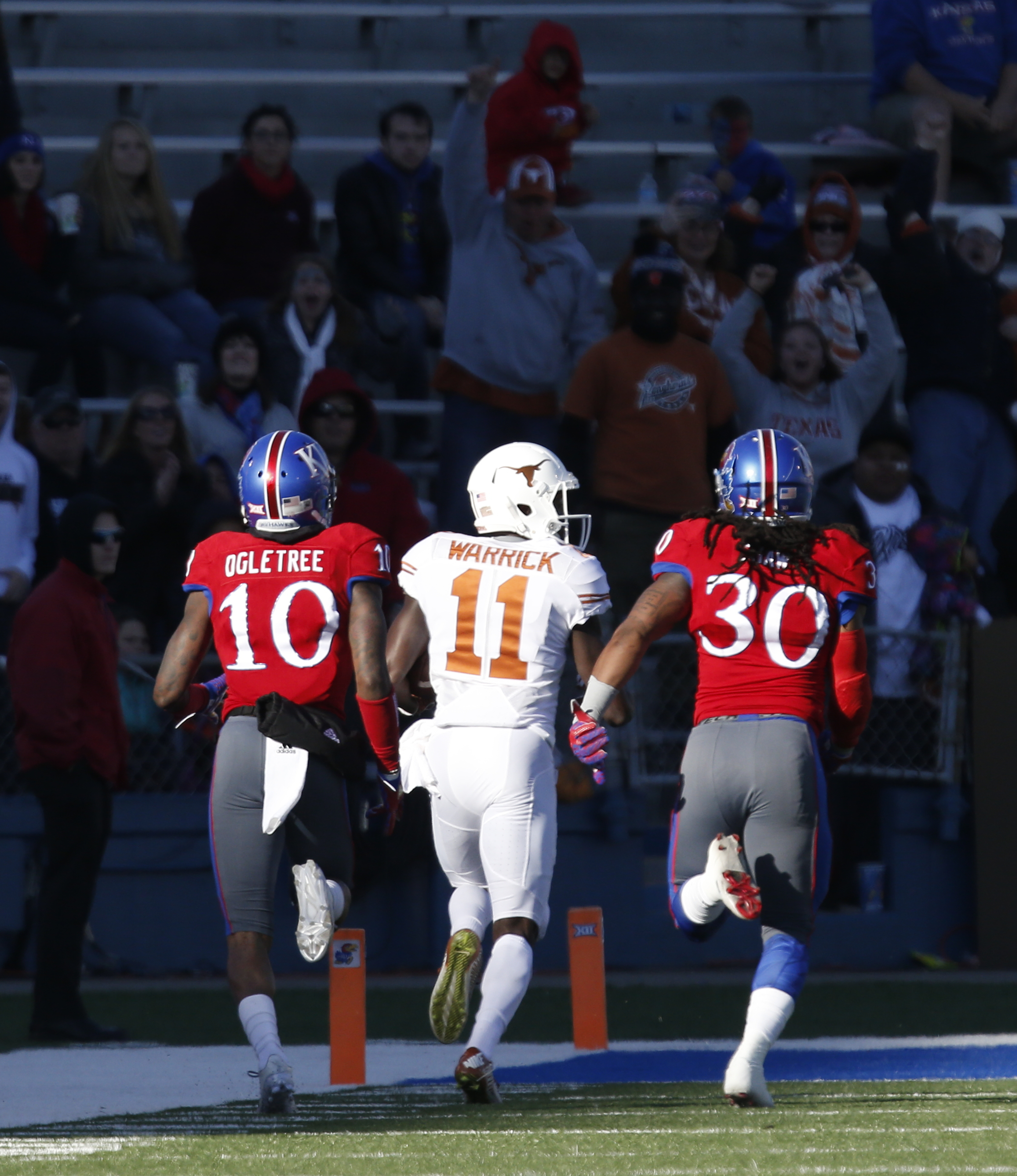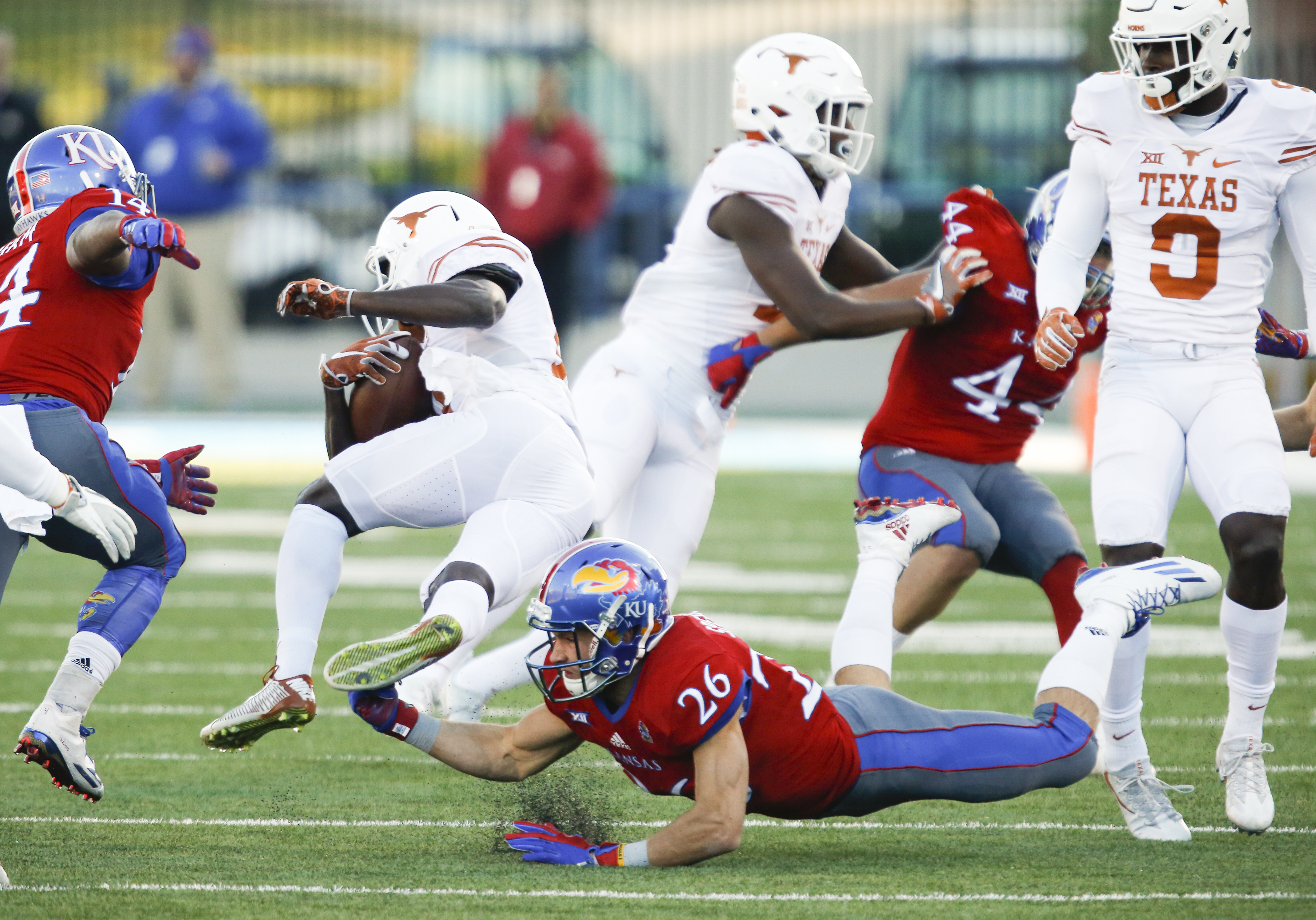 Kansas cornerback Colin Spencer (26) trips up Texas receiver Jacorey Warrick during the second quarter on Saturday, Nov. 19, 2016 at Memorial Stadium.