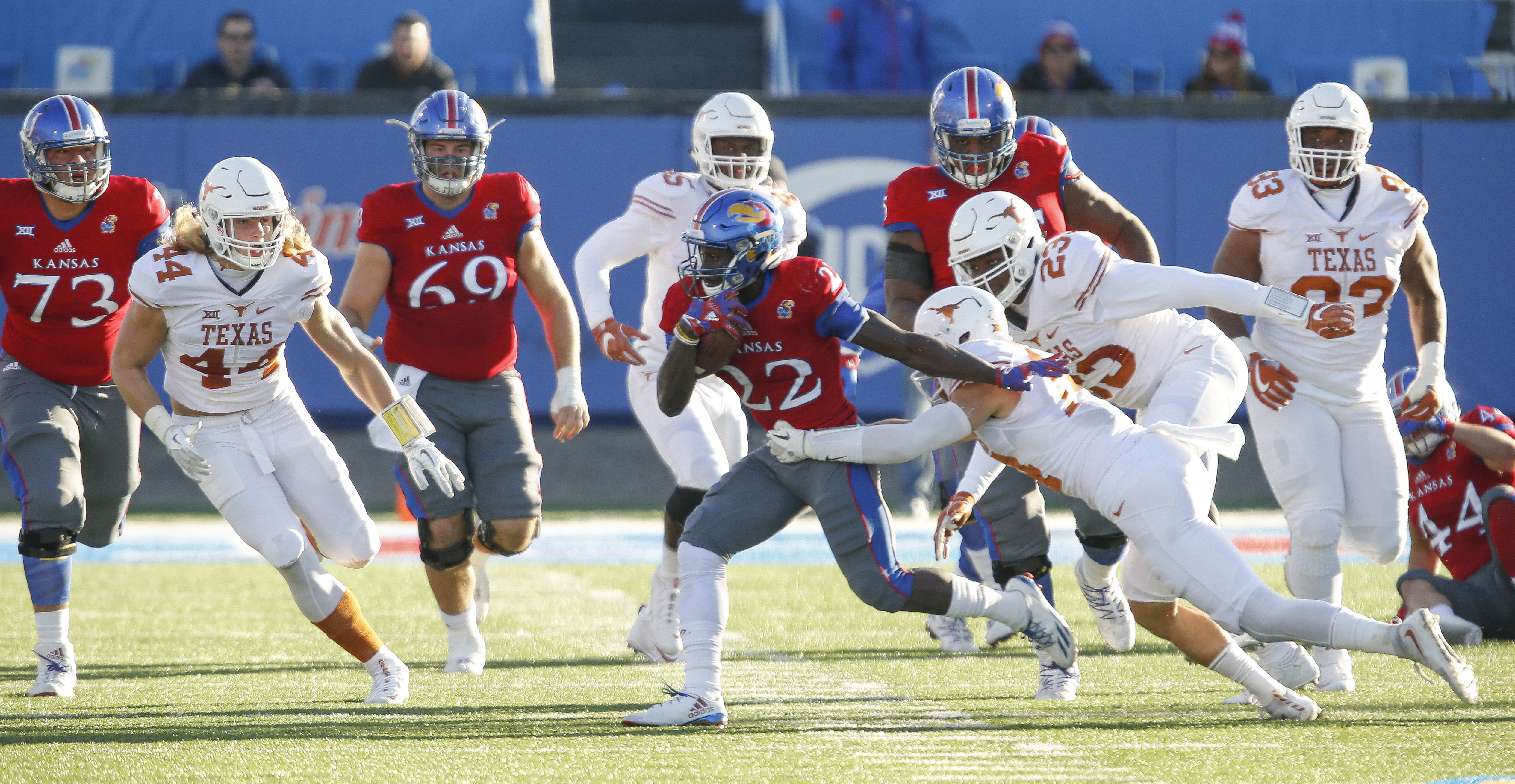 Kansas running back Ke'aun Kinner is stopped by the Texas defense during the second quarter on Saturday, Nov. 19, 2016 at Memorial Stadium.