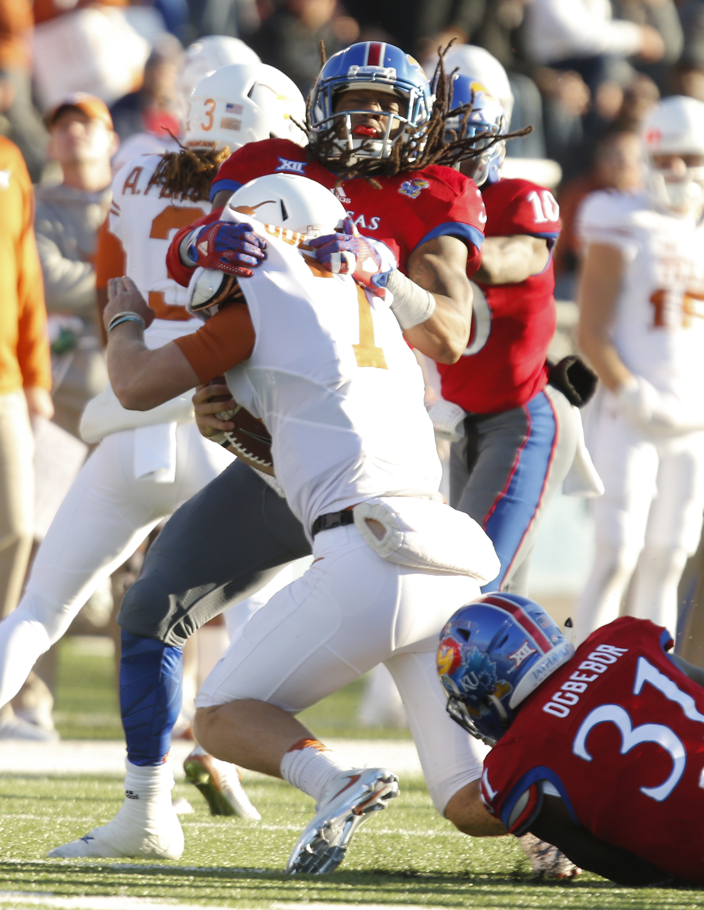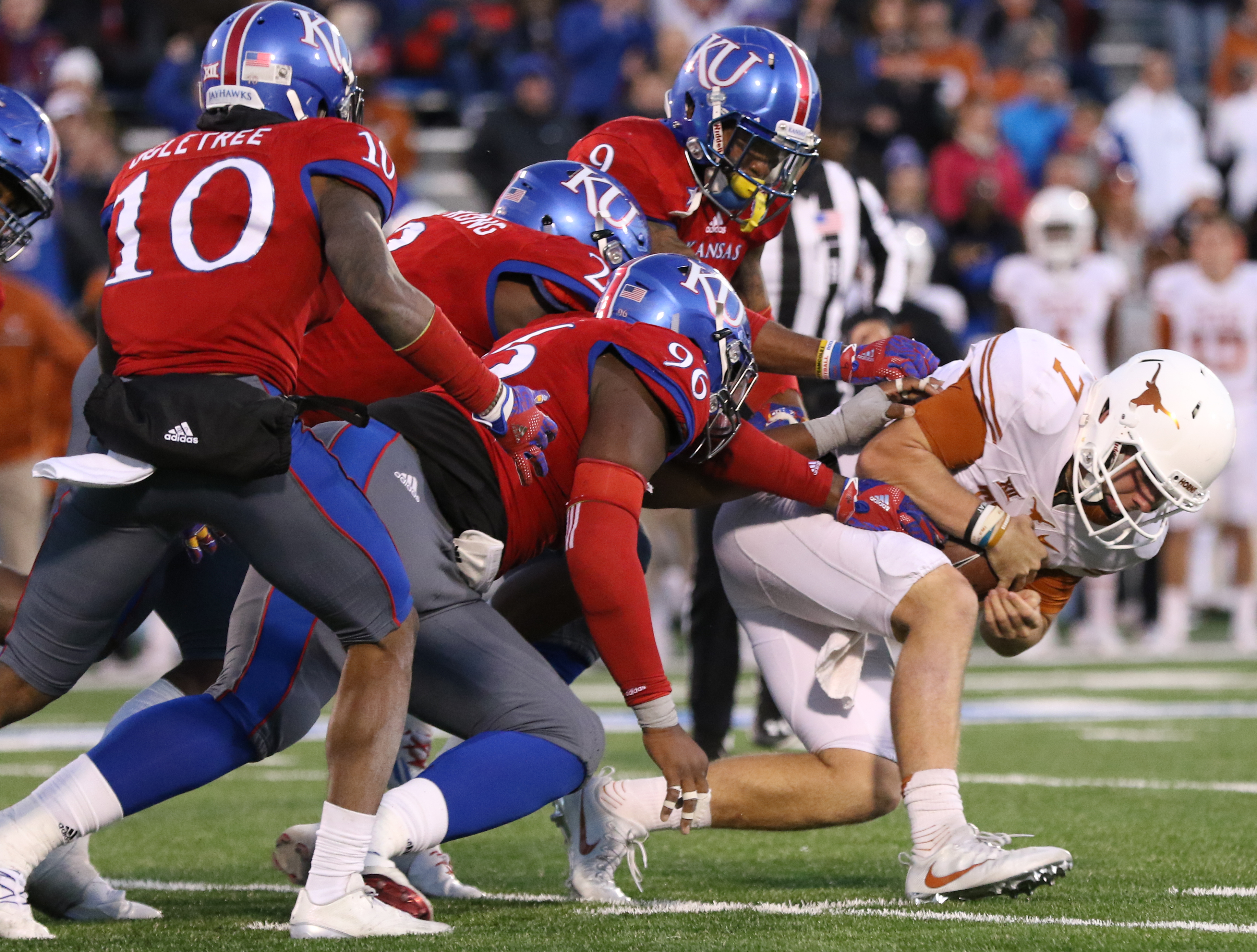 The Kansas defense sacks Texas quarterback Shane Buechele (7) during the third quarter on Saturday, Nov. 19, 2016 at Memorial Stadium.
