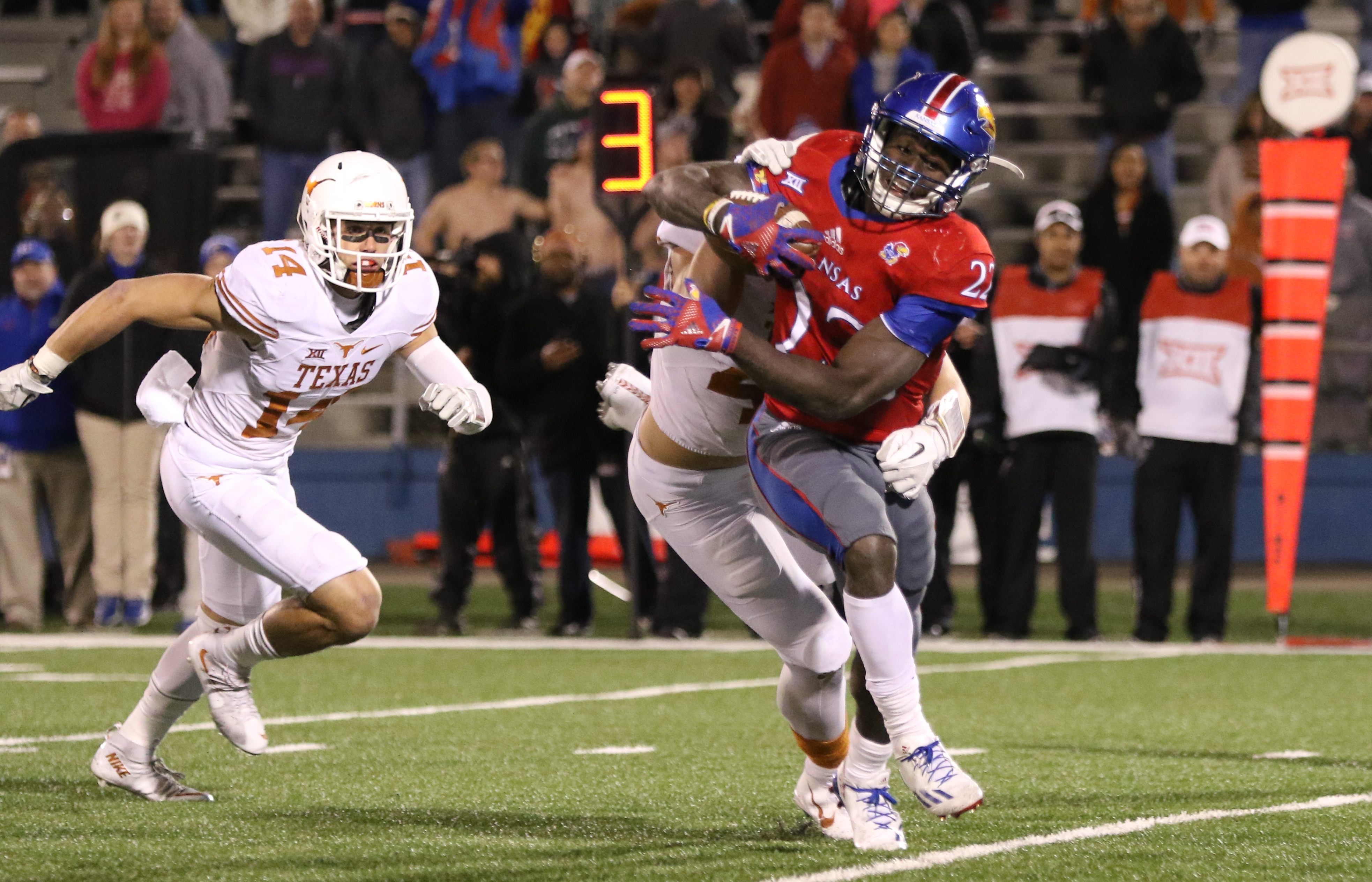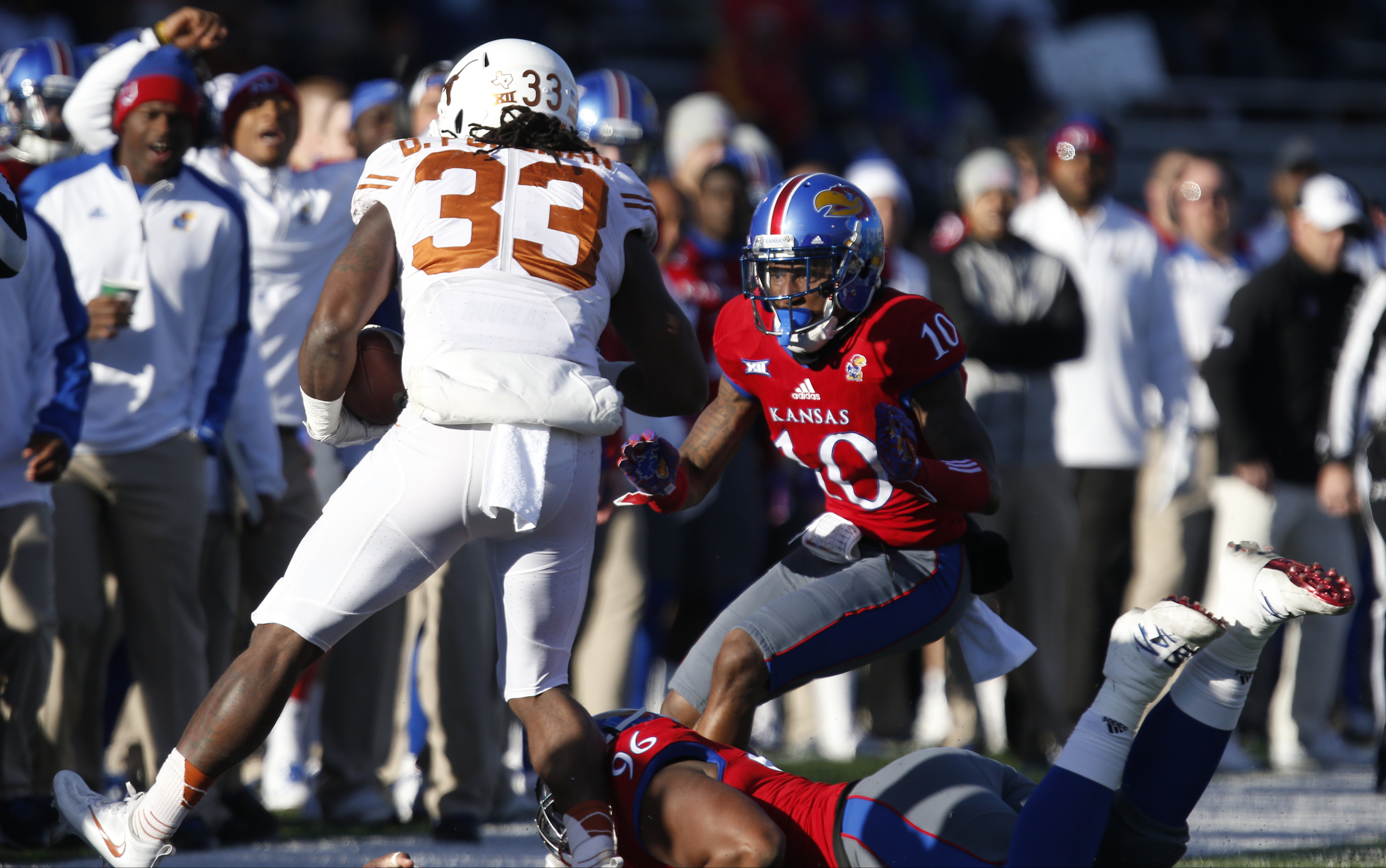 Kansas cornerback Marnez Ogletree (10) helps to force Texas running back D'Onta Foreman (33) out of bounds during the first quarter on Saturday, Nov. 19, 2016 at Memorial Stadium.