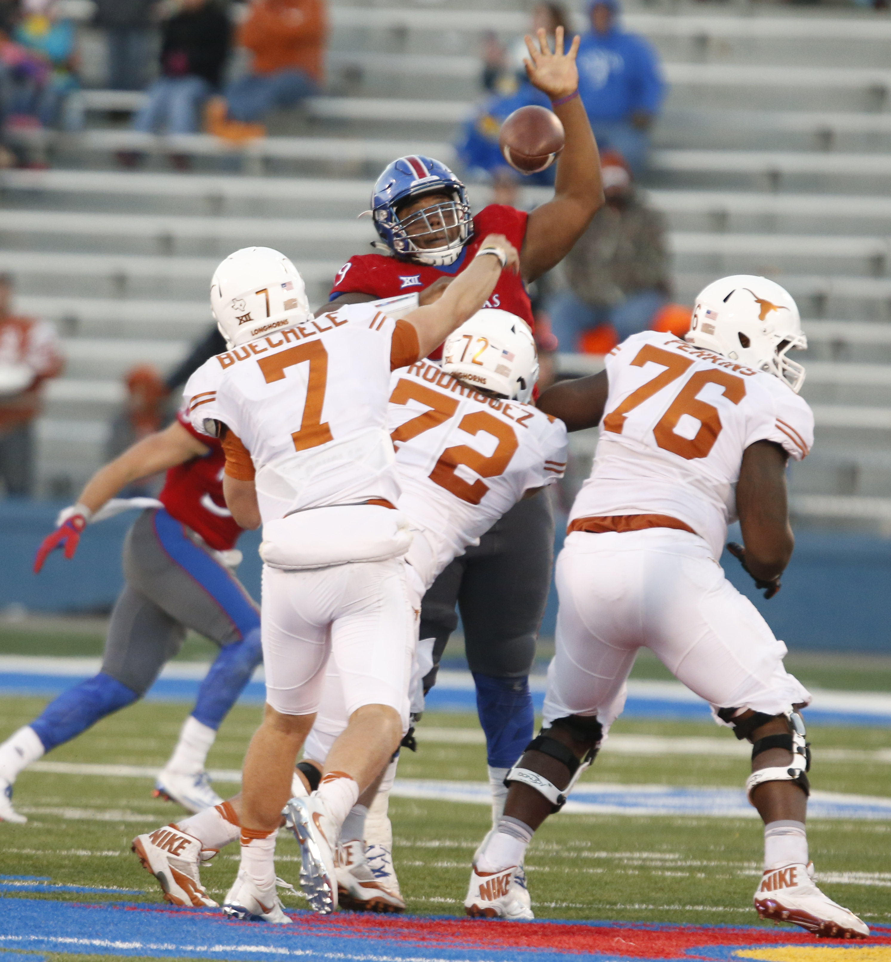 Kansas defensive tackle DeeIsaac Davis (99) gets up to bat down a pass by Texas quarterback Shane Buechele (7) during the third quarter on Saturday, Nov. 19, 2016 at Memorial Stadium.