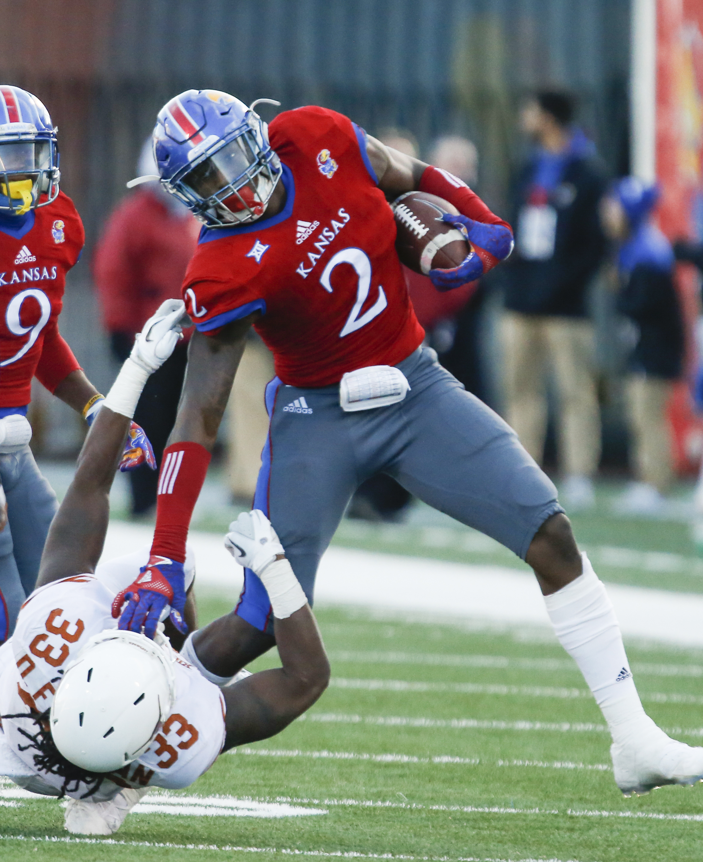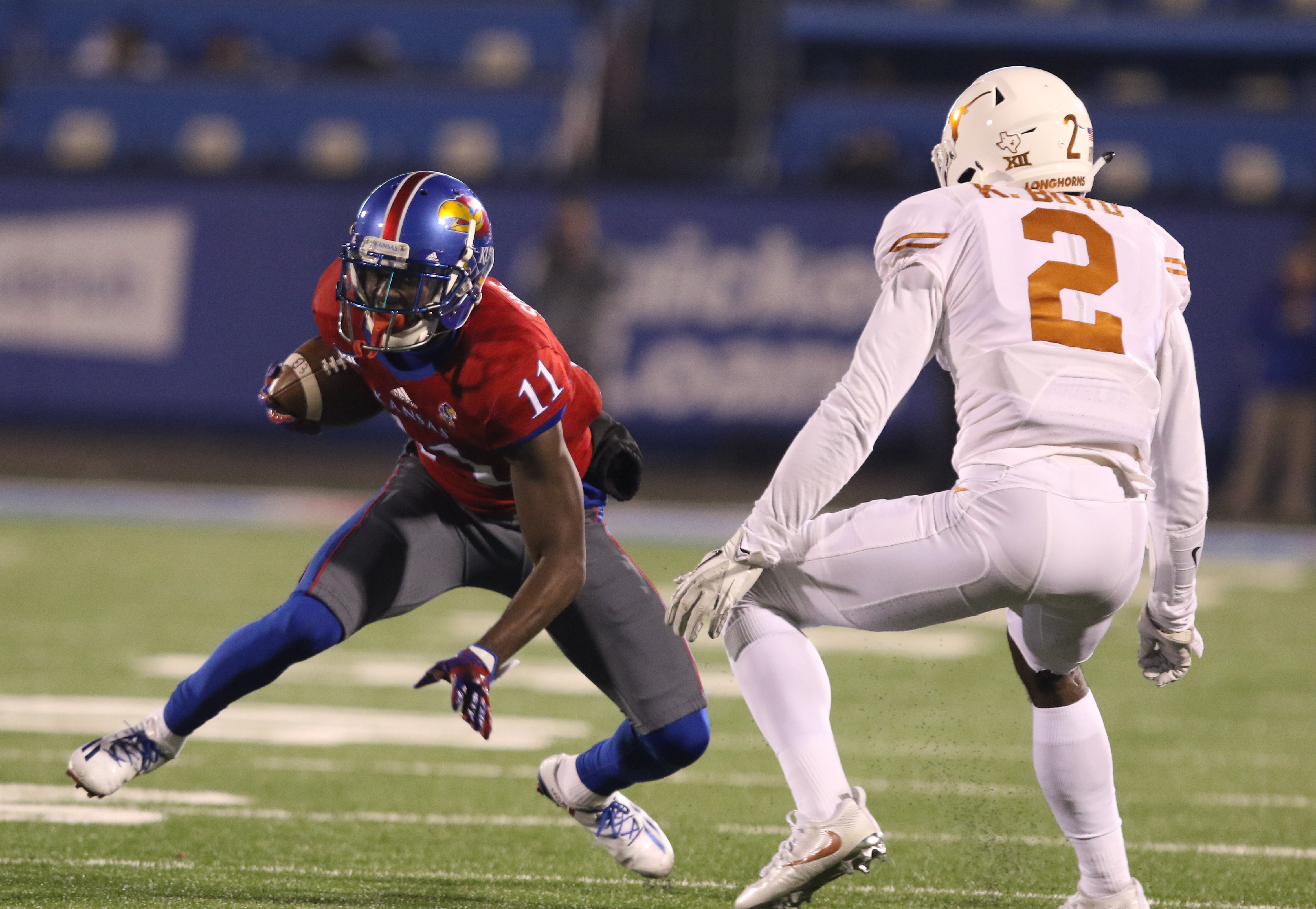 Kansas wide receiver Steven Sims Jr. (11) puts a juke move on Texas cornerback Kris Boyd (2) during the fourth quarter on Saturday, Nov. 19, 2016 at Memorial Stadium.