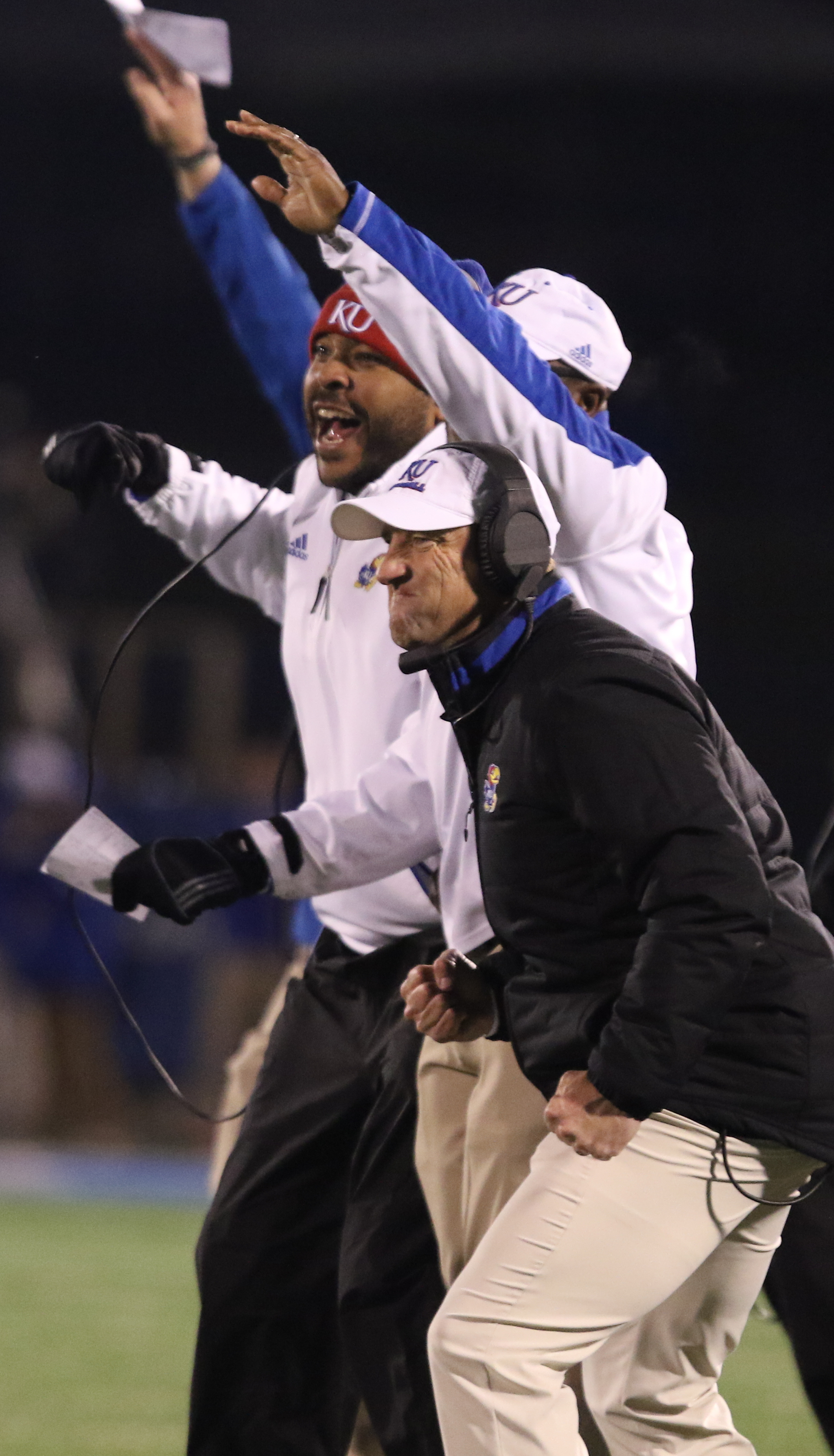 Kansas head coach David Beaty celebrates with the coaching staff after a successful two-point conversion during the fourth quarter on Saturday, Nov. 19, 2016 at Memorial Stadium.