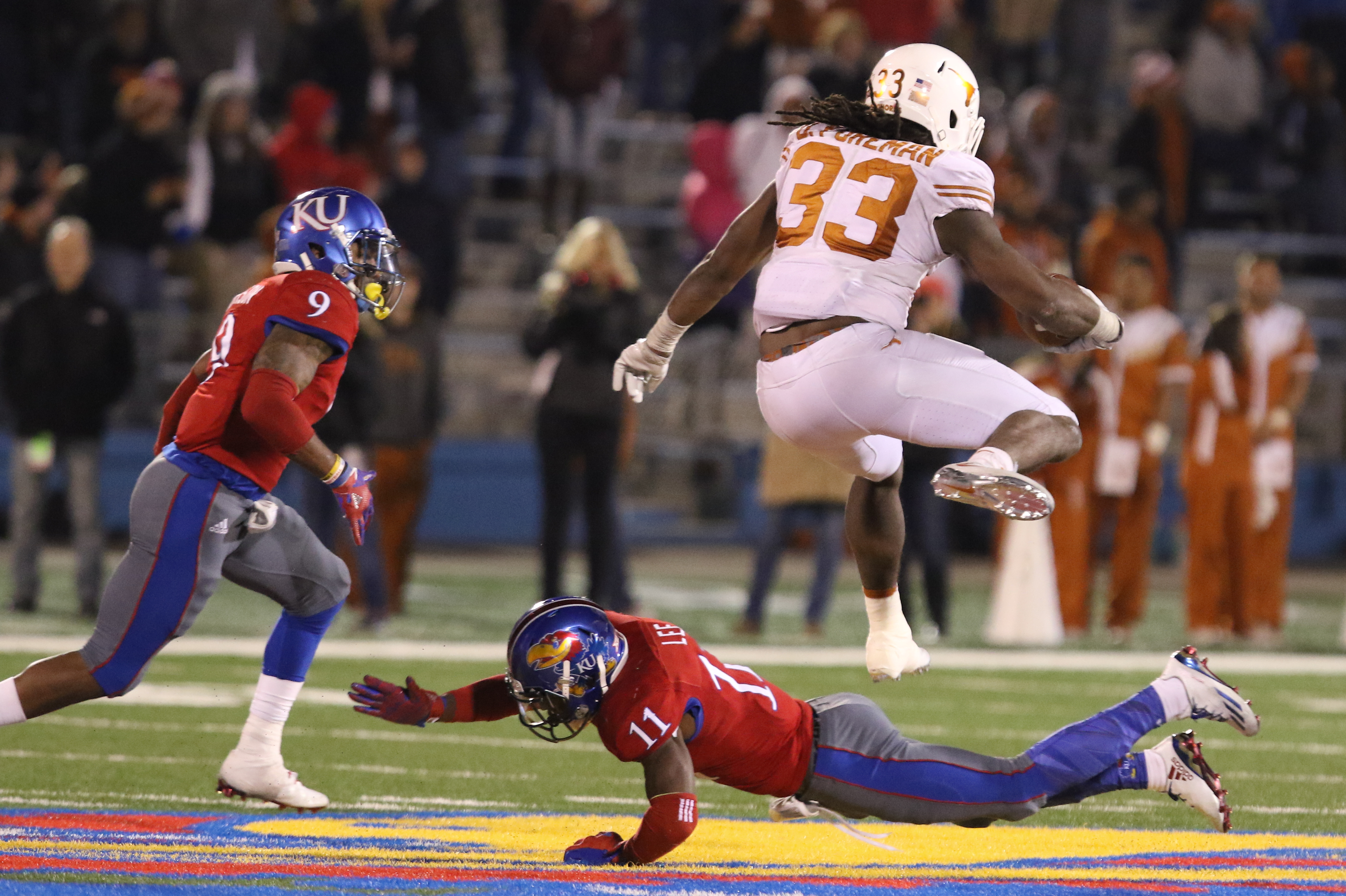Texas running back D'Onta Foreman (33) hurdles Kansas safety Mike Lee (11) on a run during the fourth quarter on Saturday, Nov. 19, 2016 at Memorial Stadium.