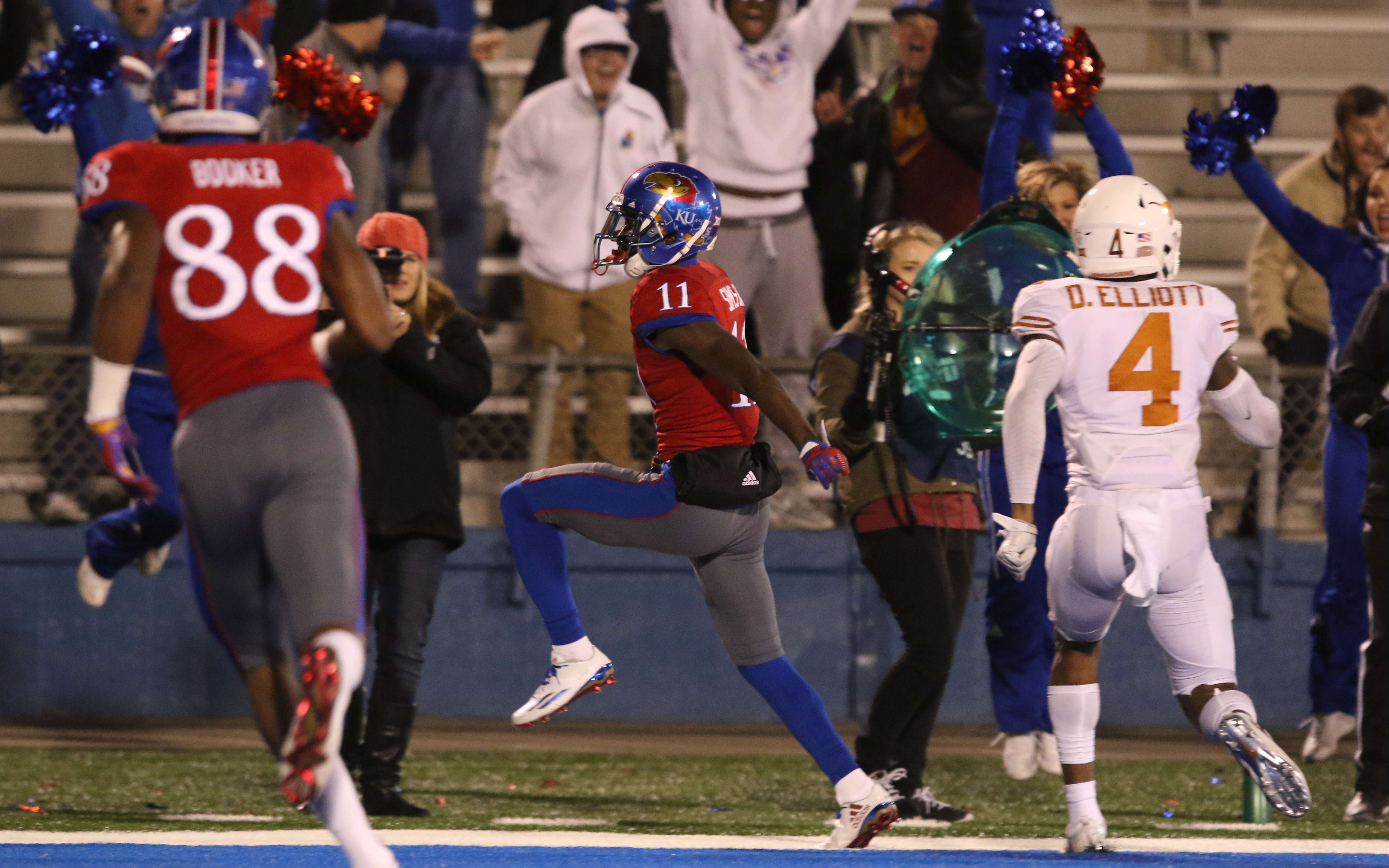 Kansas wide receiver Steven Sims Jr. (11) gets near the end zone after a catch late in the fourth quarter on Saturday, Nov. 19, 2016 at Memorial Stadium.