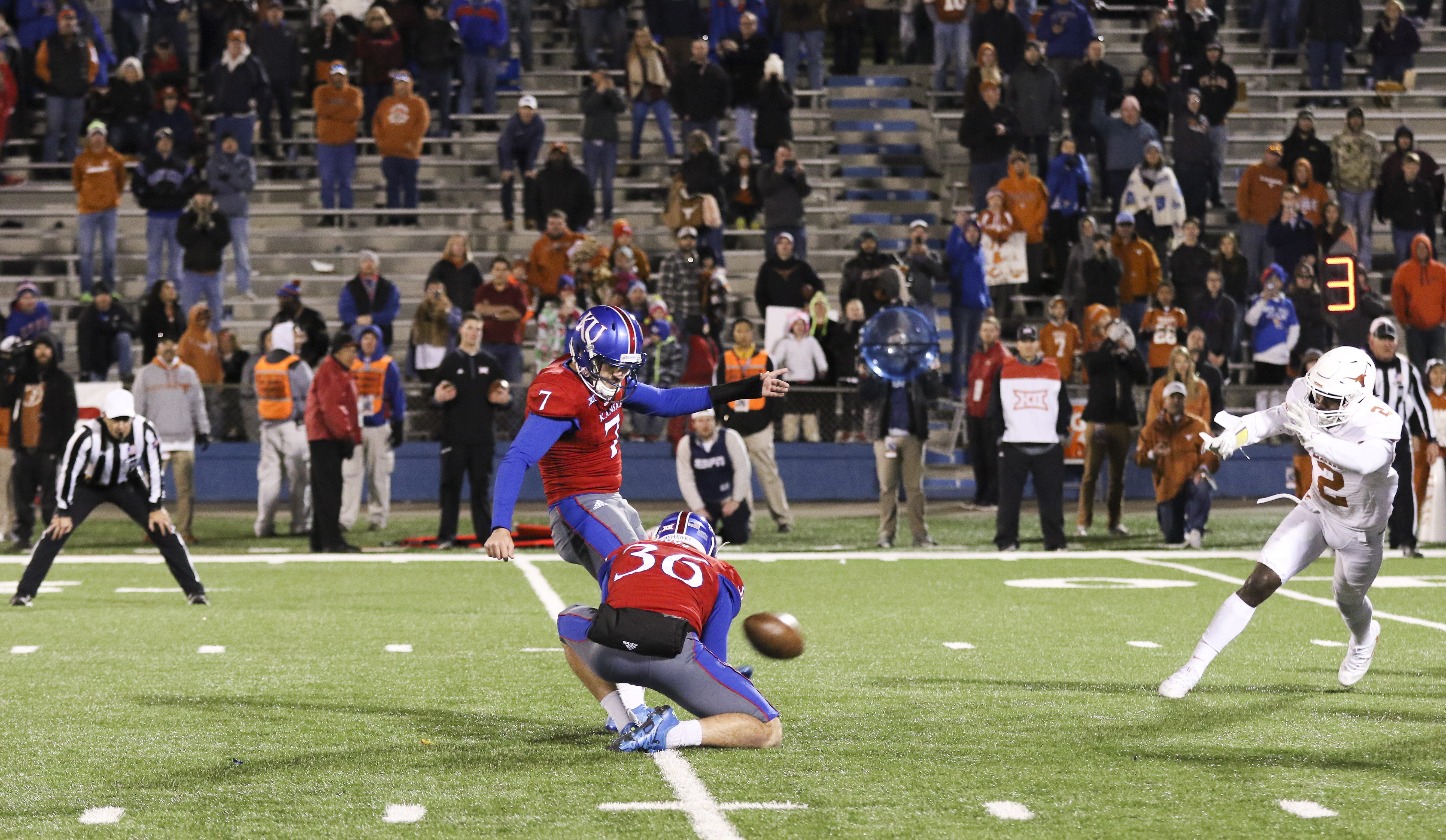 Kansas place kicker Matthew Wyman (7) and holder Cole Moos (36) go wild after Wyman's game-winning field goal in overtime against Texas on Saturday, Nov. 19, 2016 at Memorial Stadium.