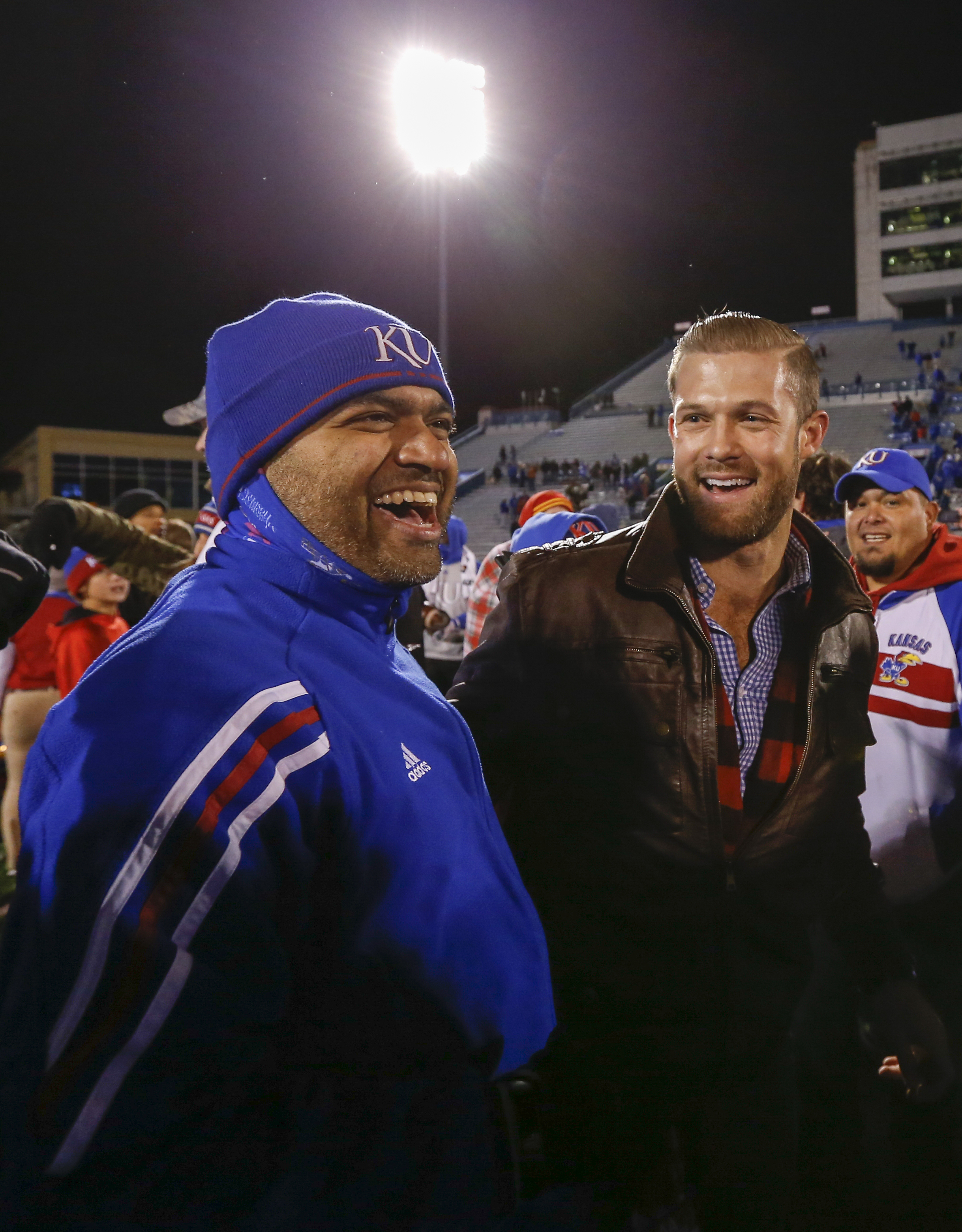 Kansas head coach David Beaty is flanked by fullback Michael Zunica (44) and offensive line coach Zach Yenser following the Jayhawks' 24-21 overtime upset of Texas on Saturday, Nov. 19, 2016 at Memorial Stadium.