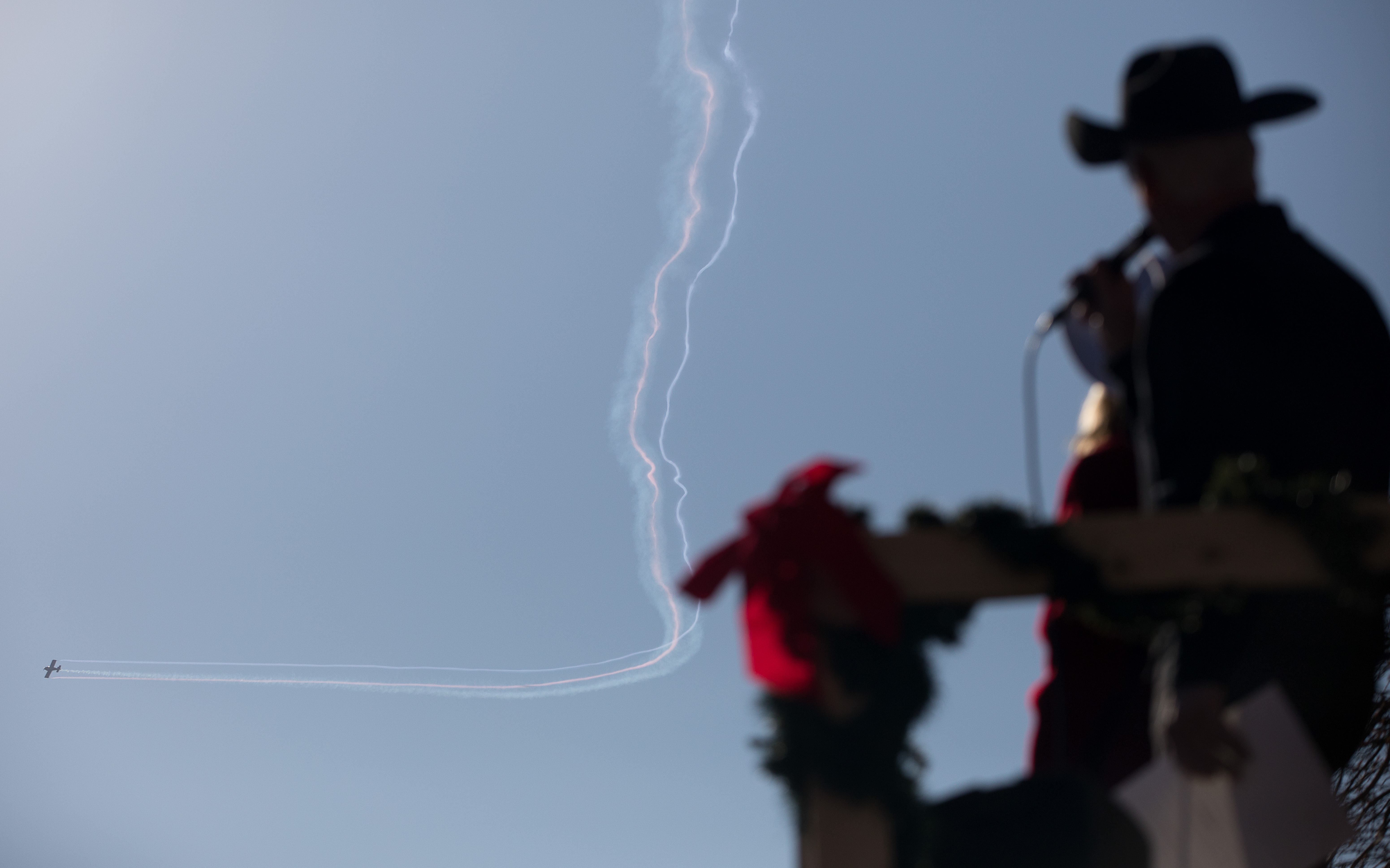 Lawrence pilot Al Stuber leaves a trail of colored smoke during a fly-by over downtown Lawrence to kick off the the 25th Lawrence Old Fashioned Christmas Parade Saturday, Dec. 2, 2017.