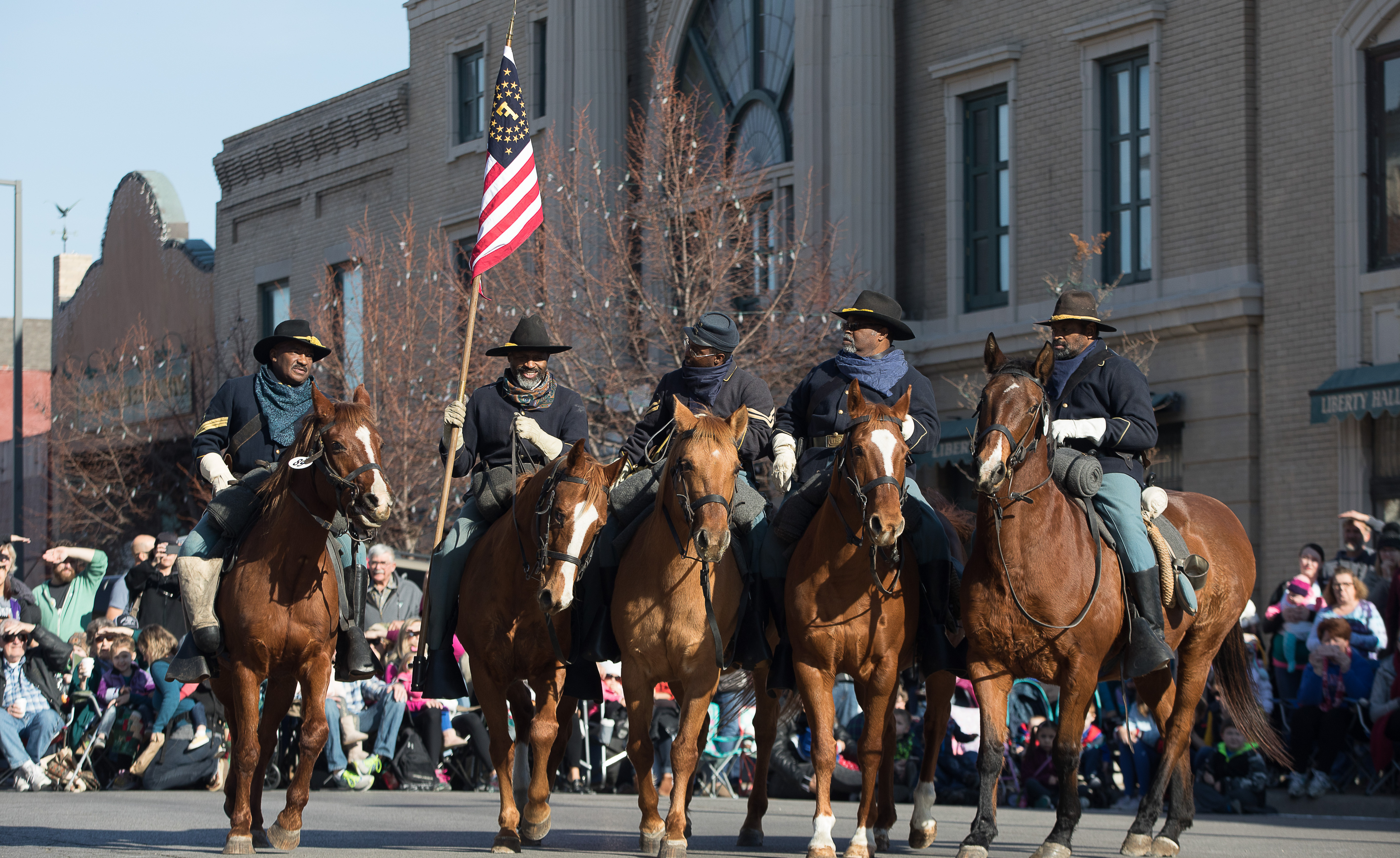 A group of Buffalo Soldiers head down Massachusetts Street at the start of the 25th Lawrence Old Fashioned Christmas Parade Saturday, Dec. 2, 2017.