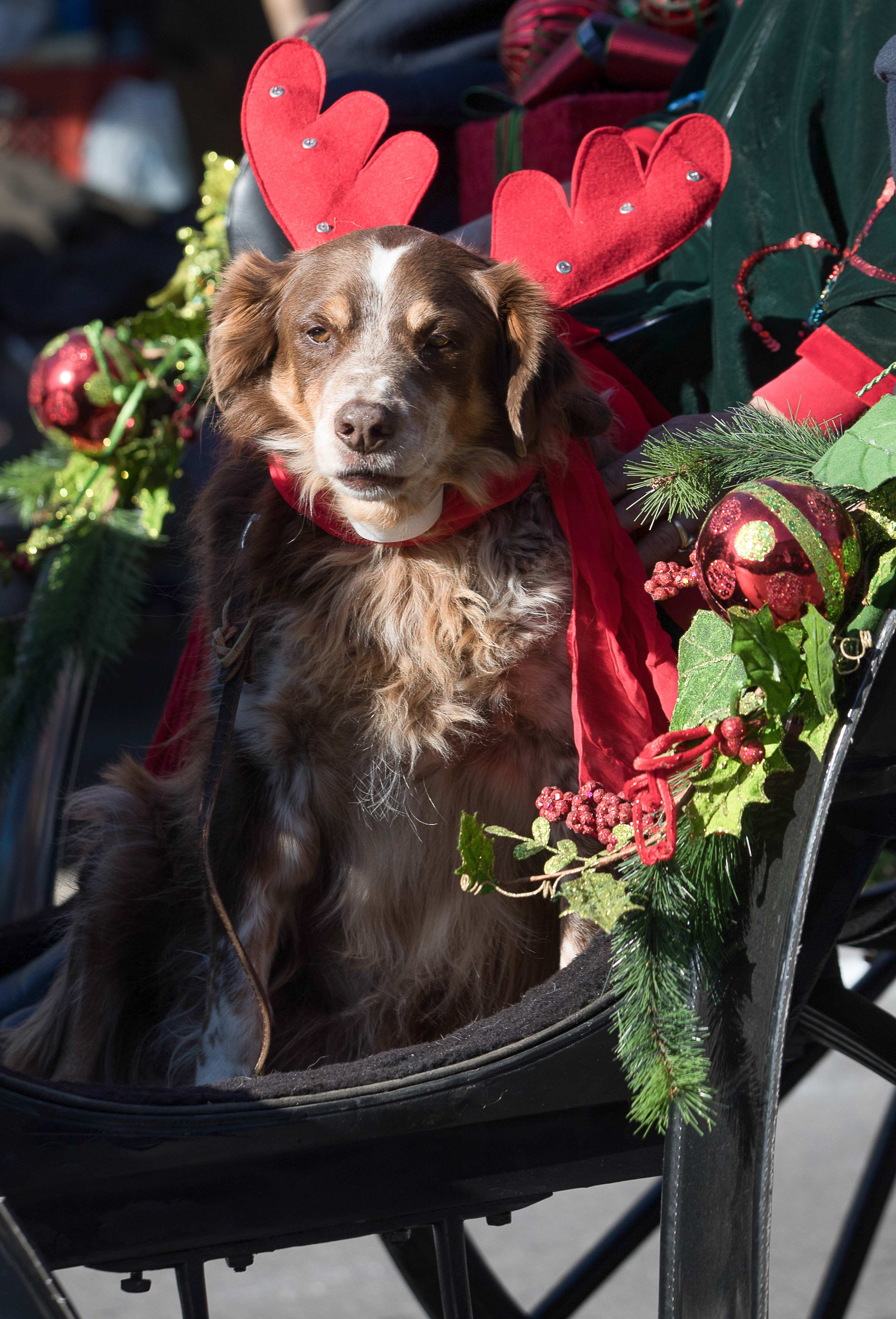 A festively dressed dog rides in a carriage during the 25th Lawrence Old Fashioned Christmas Parade Saturday, Dec. 2, 2017.