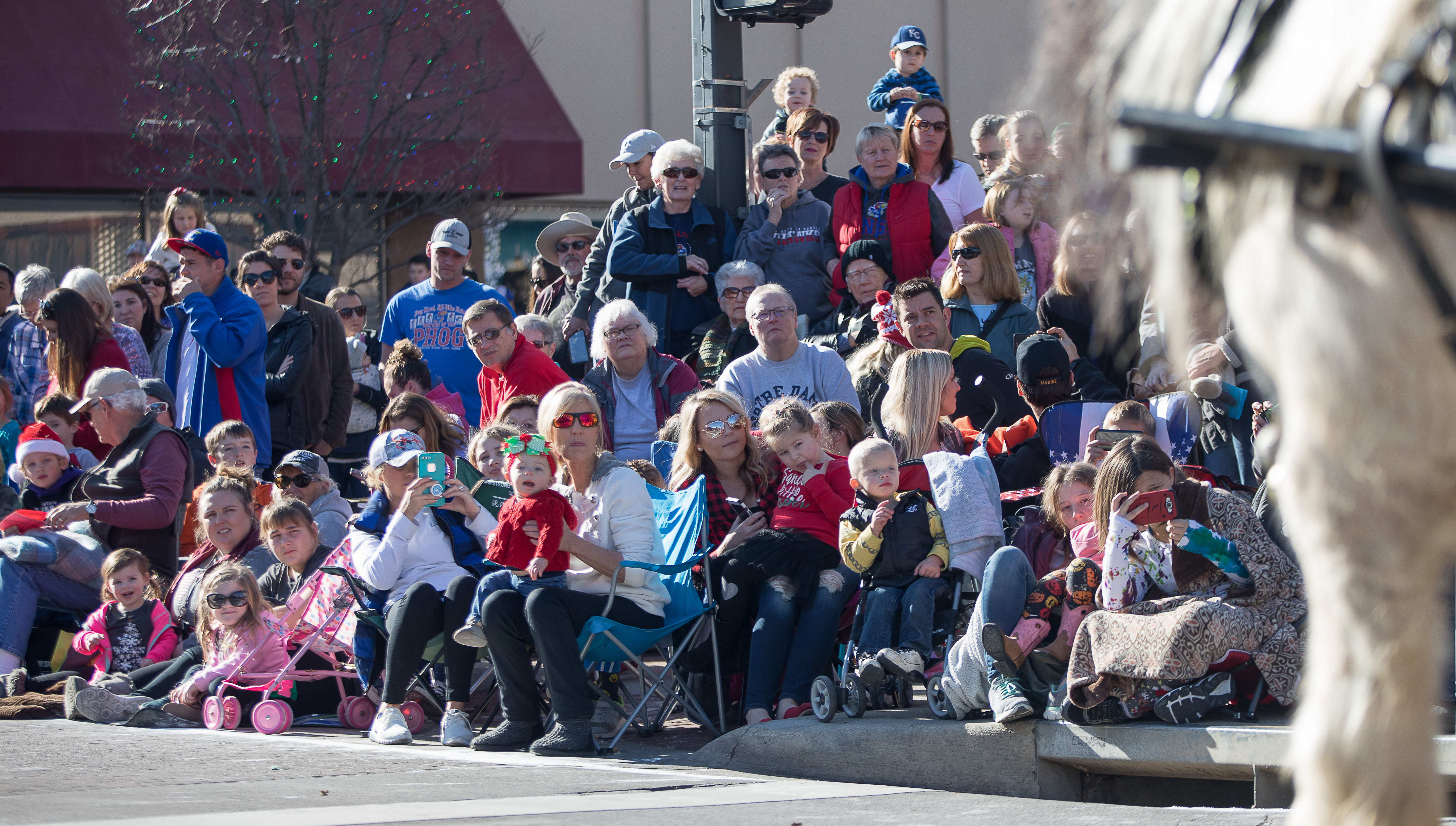 A crowd watches passing horses and carriages in downtown Lawrence during the 25th Lawrence Old Fashioned Christmas Parade Saturday, Dec. 2, 2017.