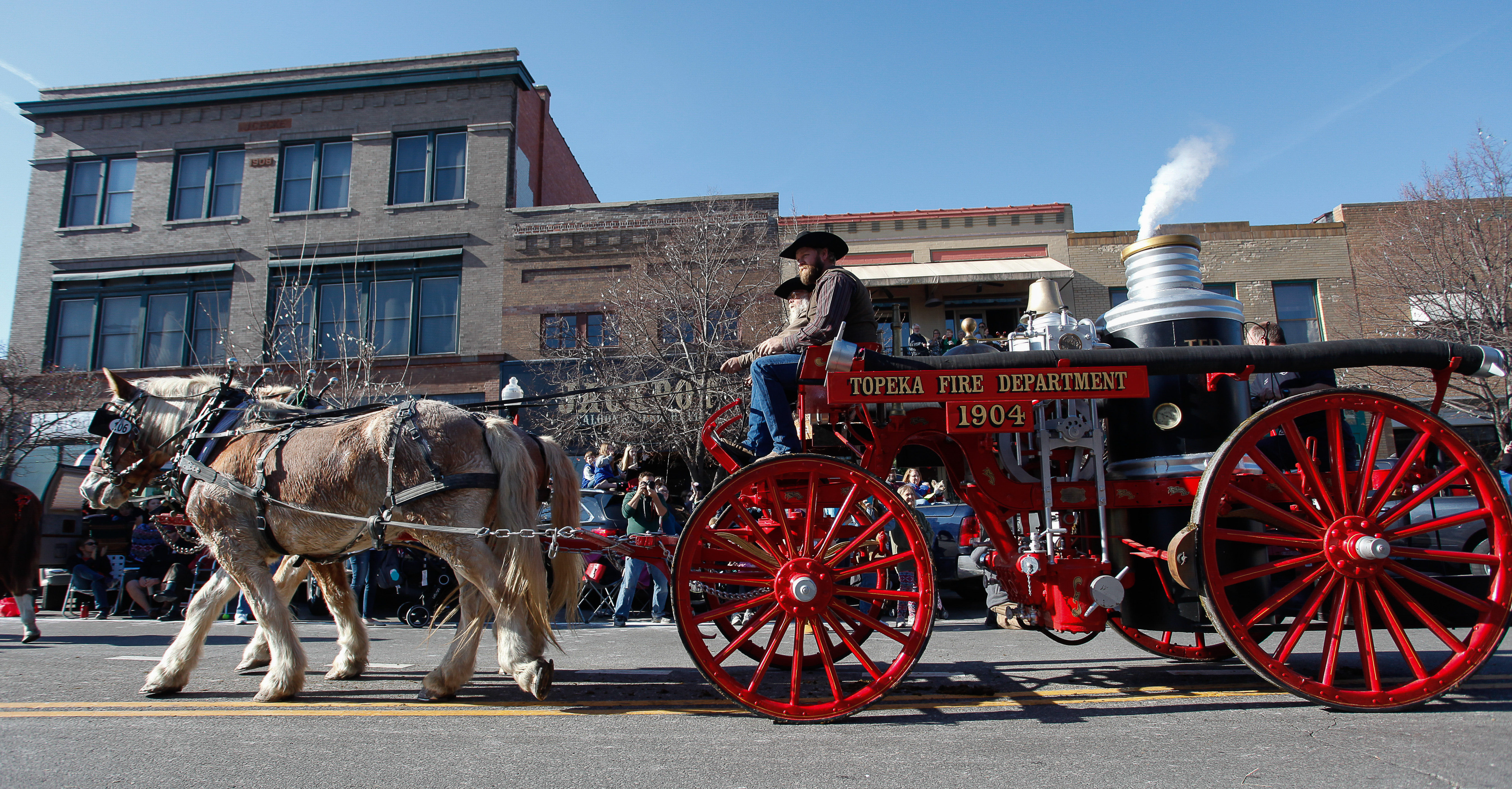 Topeka Fire Department members ride in their 1904 wagon in the 25th Lawrence Old Fashioned Christmas Parade Saturday, Dec. 2, 2017.