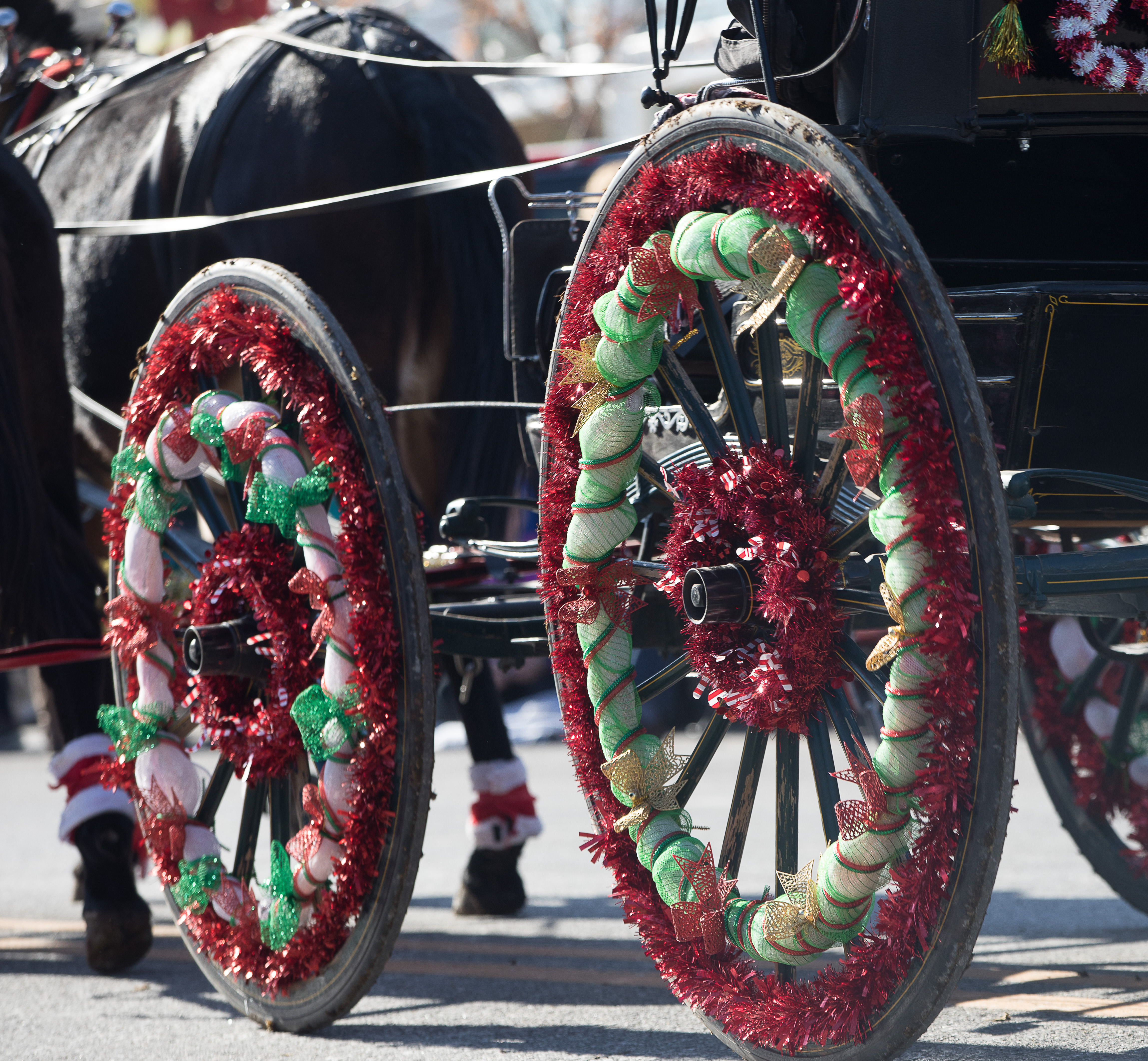 Decorated carriage wheels attract the crowd's attention during the 25th Lawrence Old Fashioned Christmas Parade Saturday, Dec. 2, 2017.