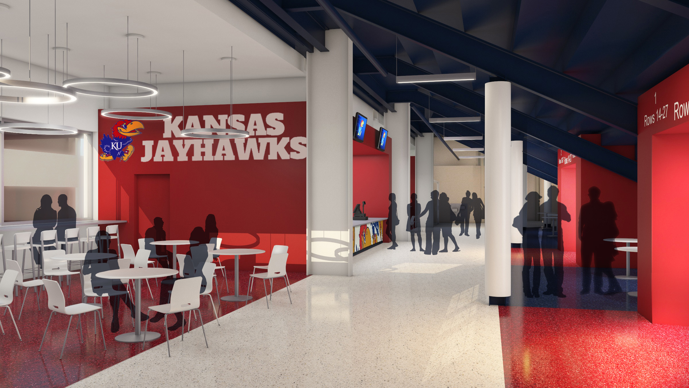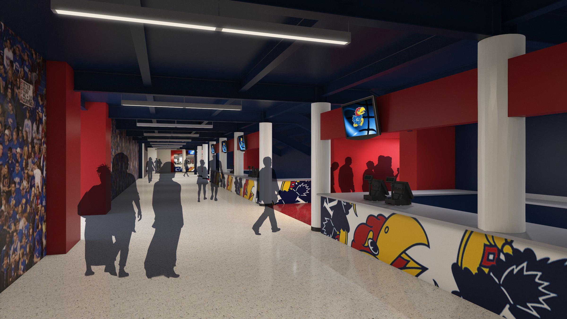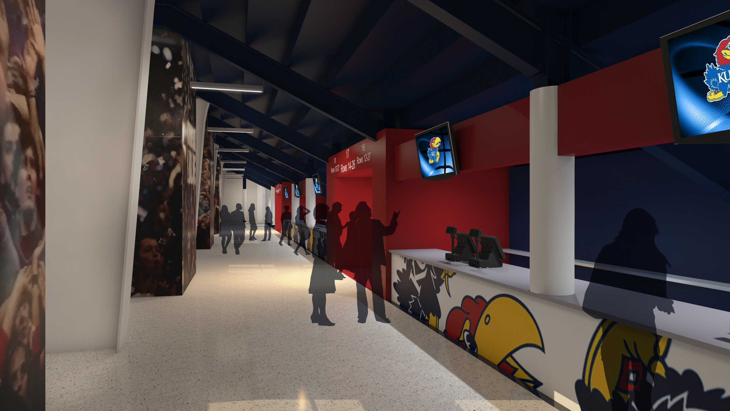 Rendering of Allen Fieldhouse second level concourse west, looking north, at completion of renovation project.