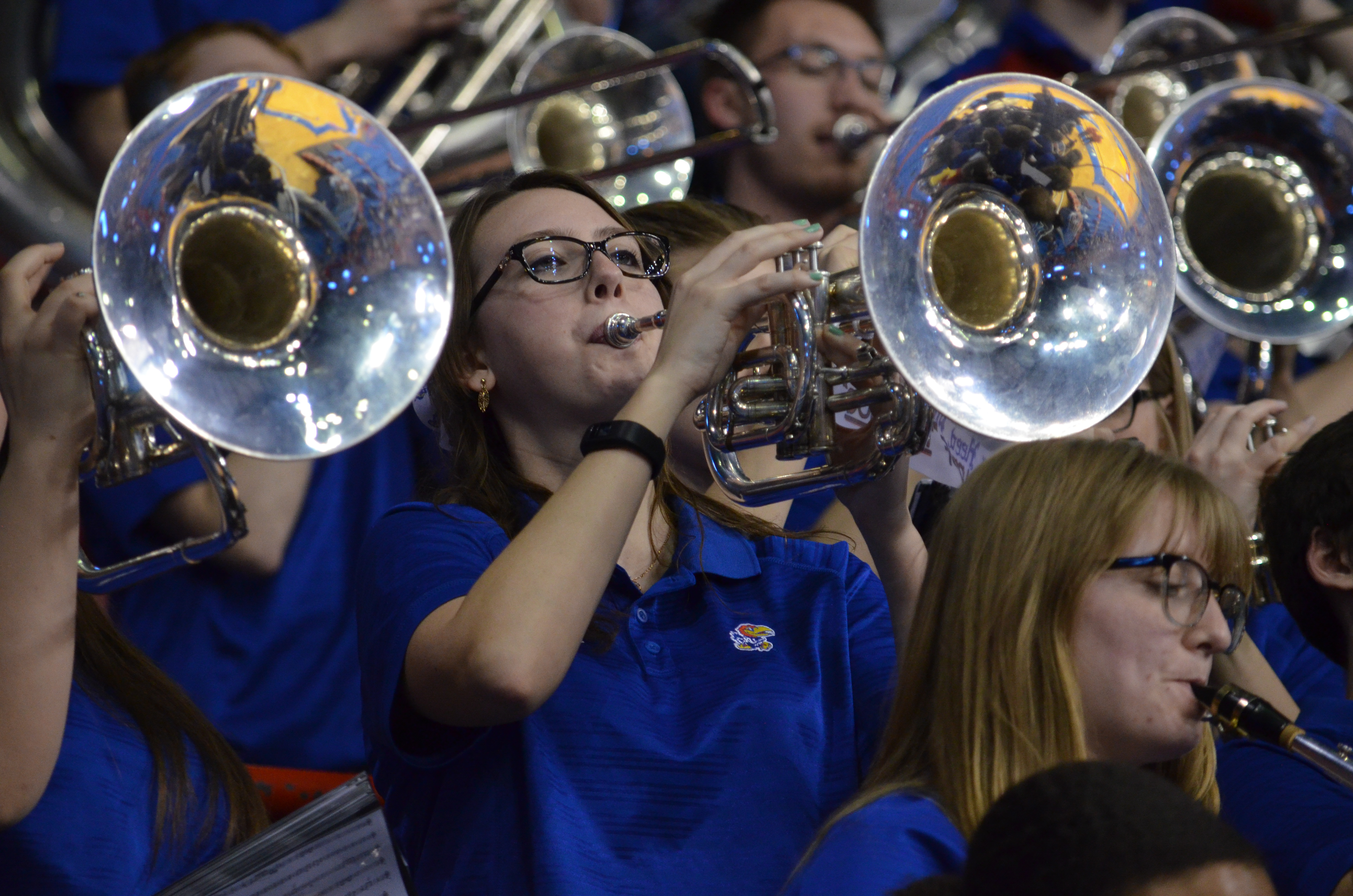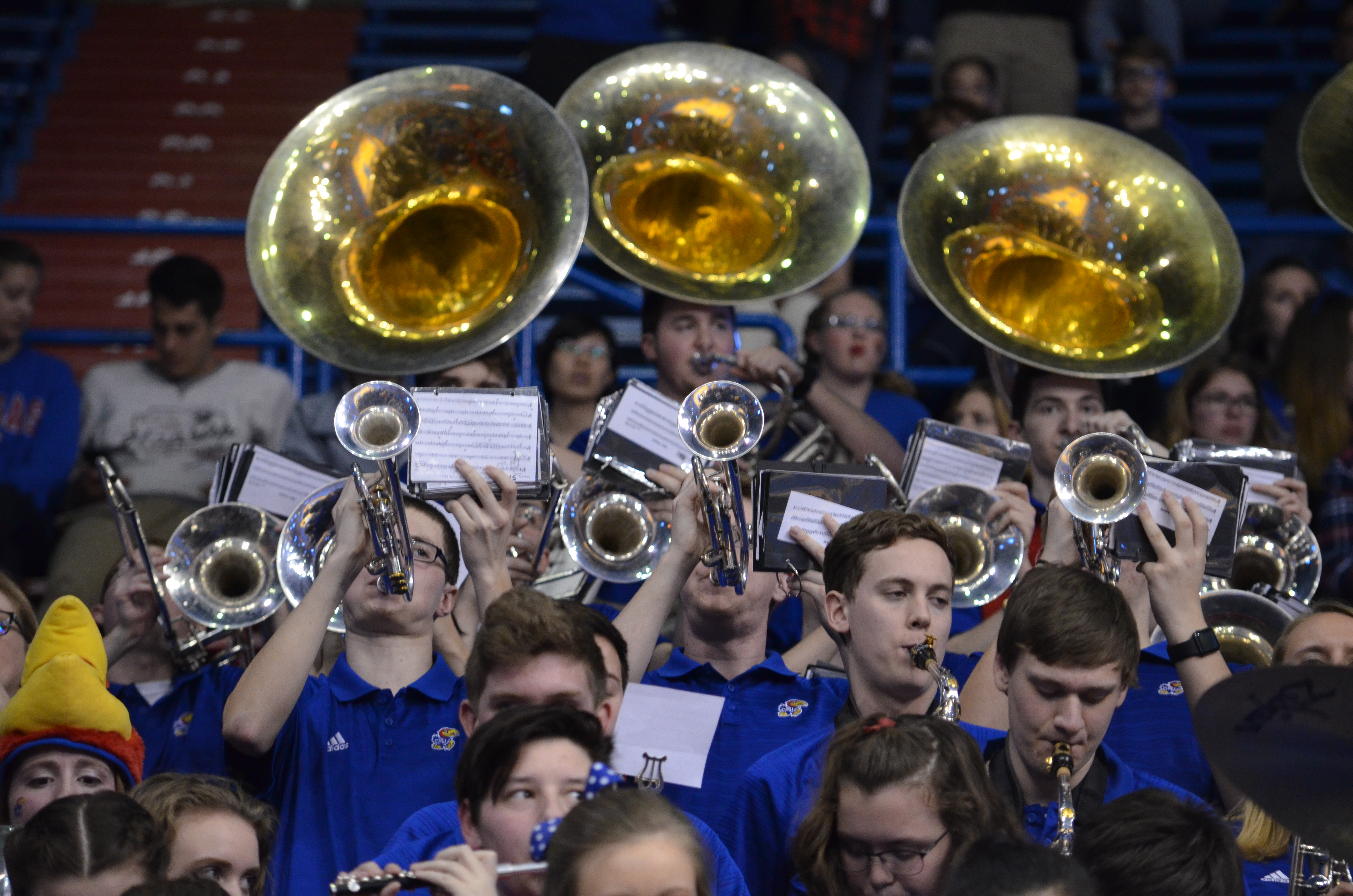 Members of the KU band perform a song at Allen Fieldhouse on Saturday, March 31, 2018. The Kansas basketball team's game against Villanova was played on the video board. KU lost to Villanova, 95-79.