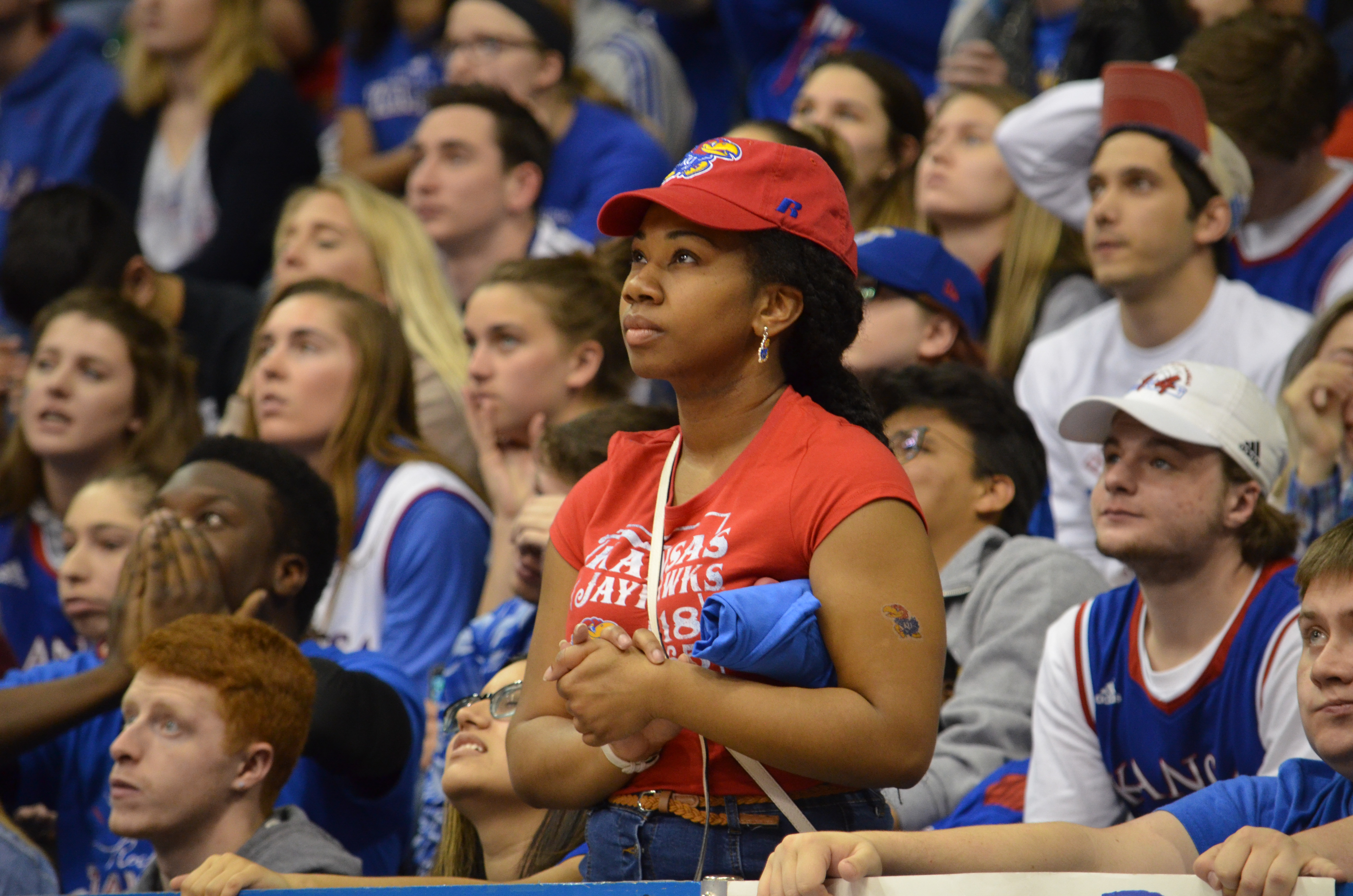 University of Kansas student Chiquita Jackson watches the video board at Allen Fieldhouse, where the KU basketball game against Villanova was being screened. KU lost to Villanova, 95-79, on Saturday, March 31, 2018.