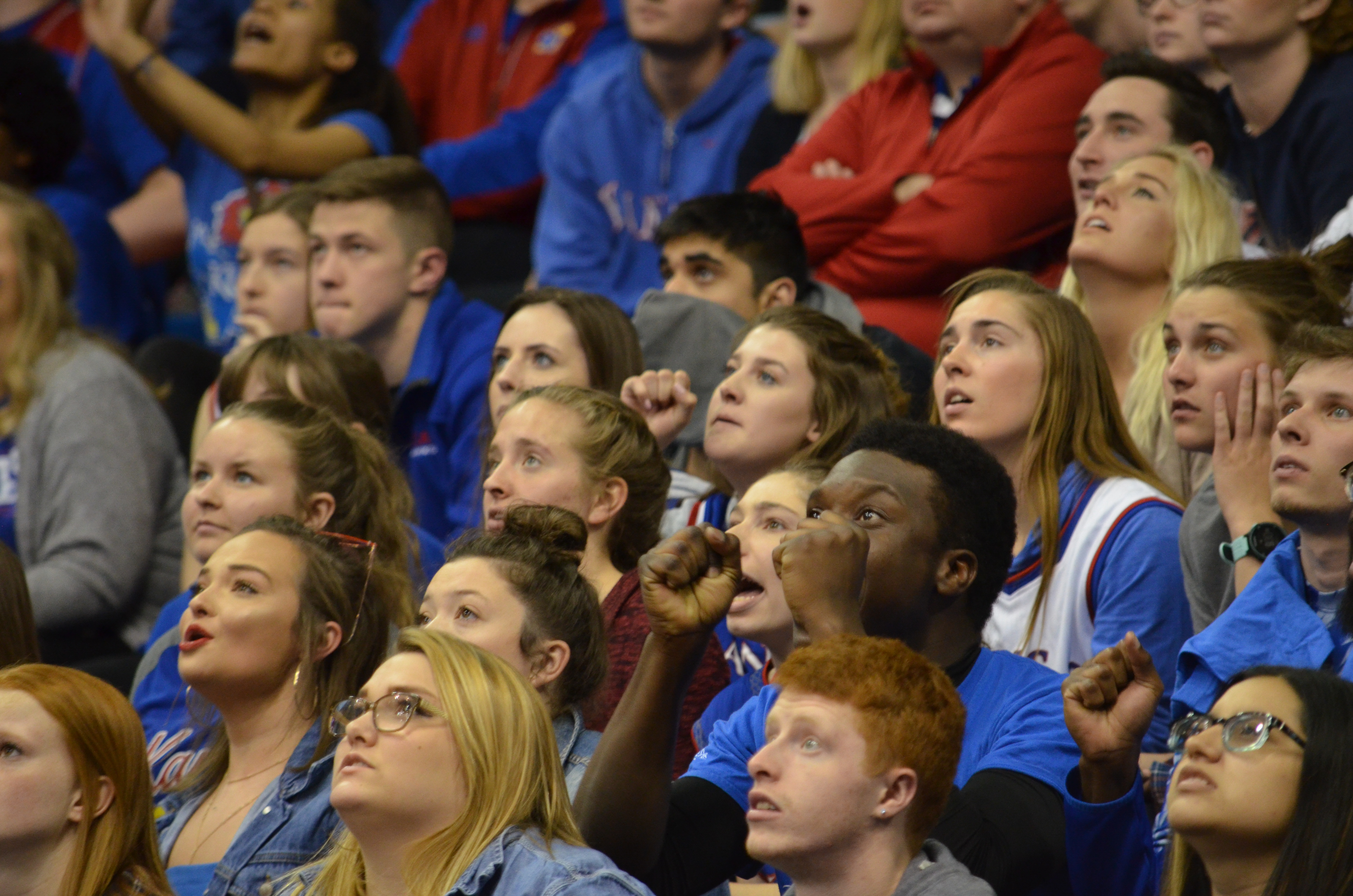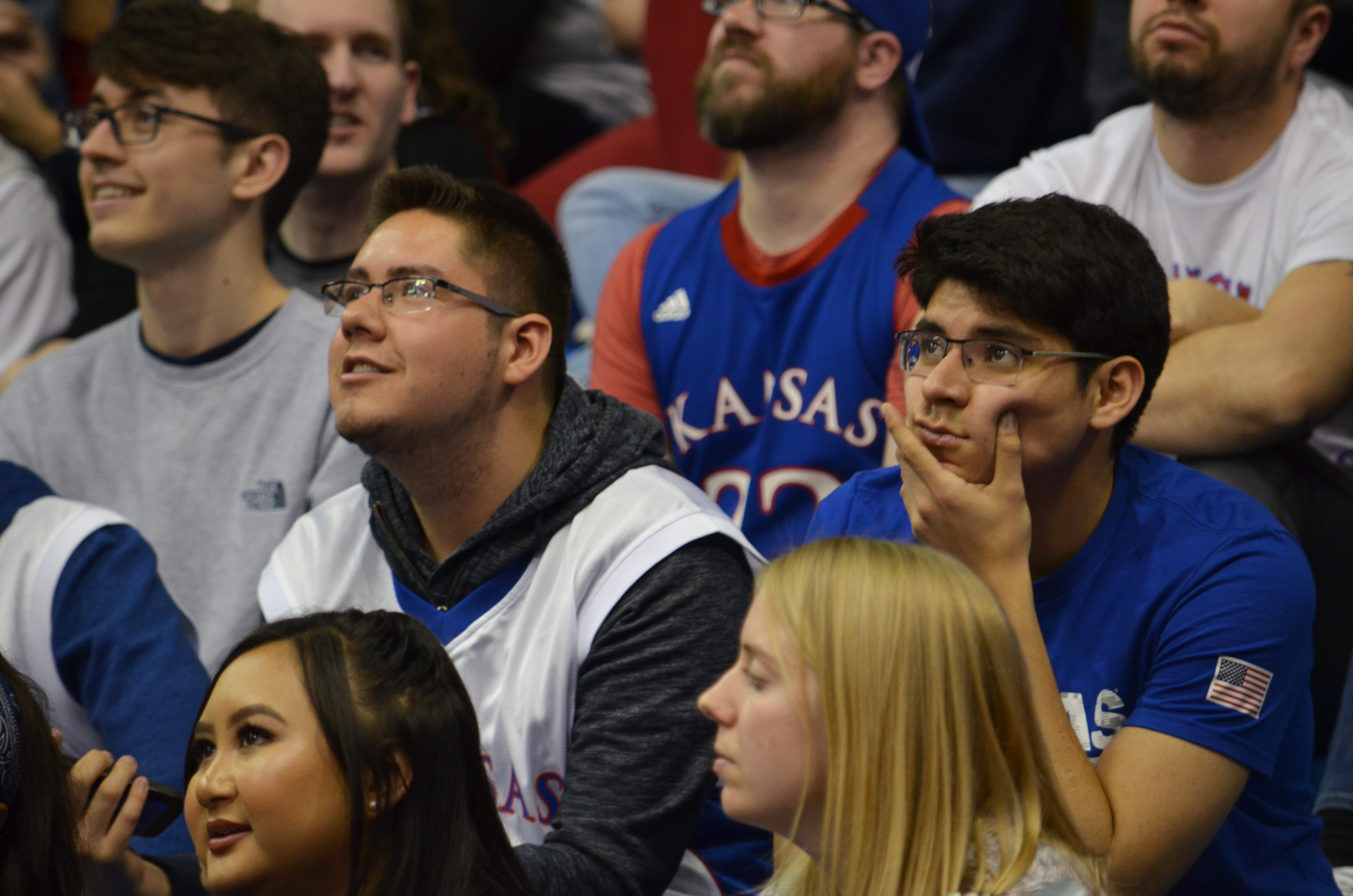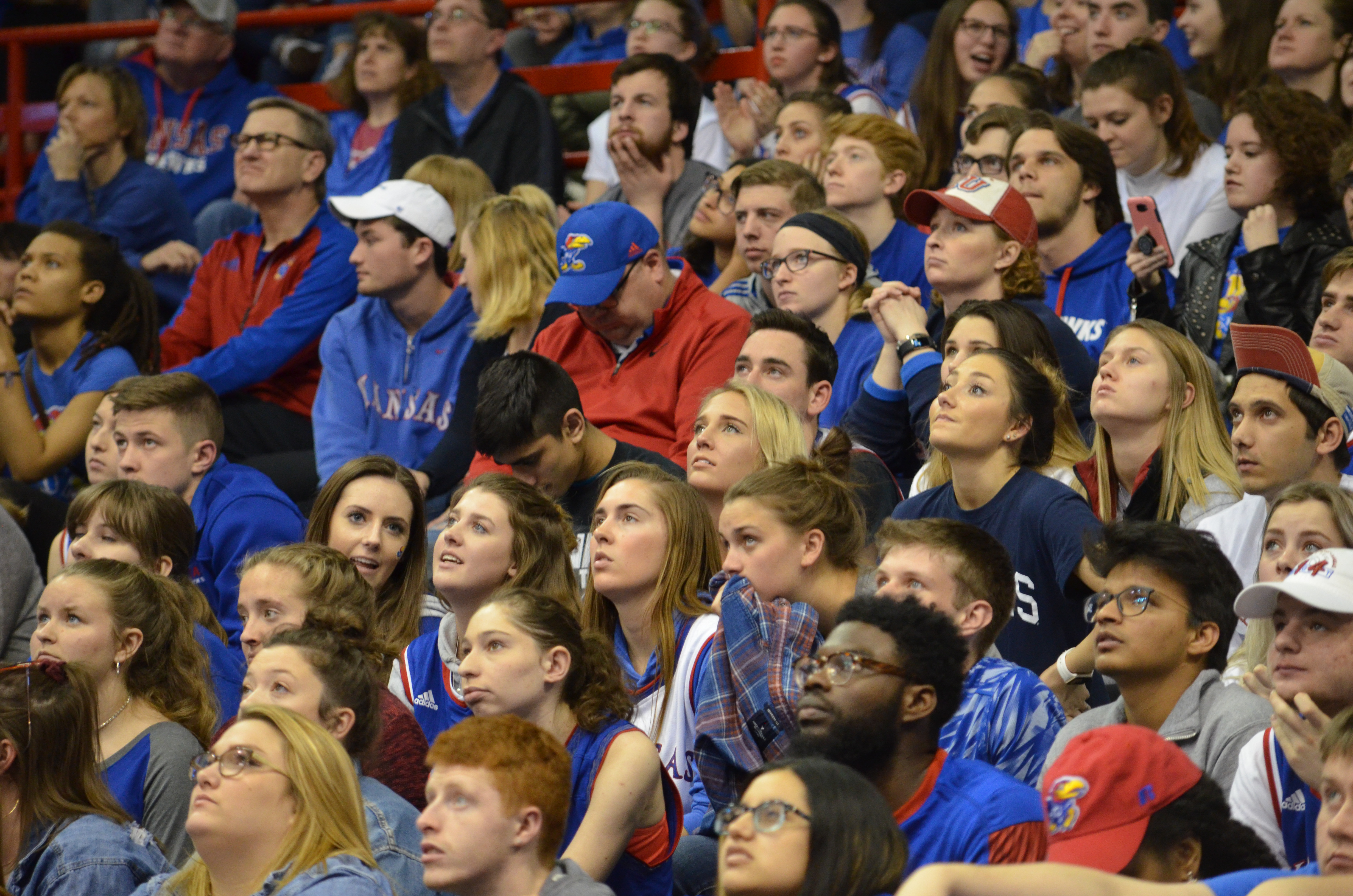 Kansas basketball fans watch the video board at Allen Fieldhouse, where the KU basketball game against Villanova was being screened. KU lost to Villanova, 95-79, on Saturday, March 31, 2018.