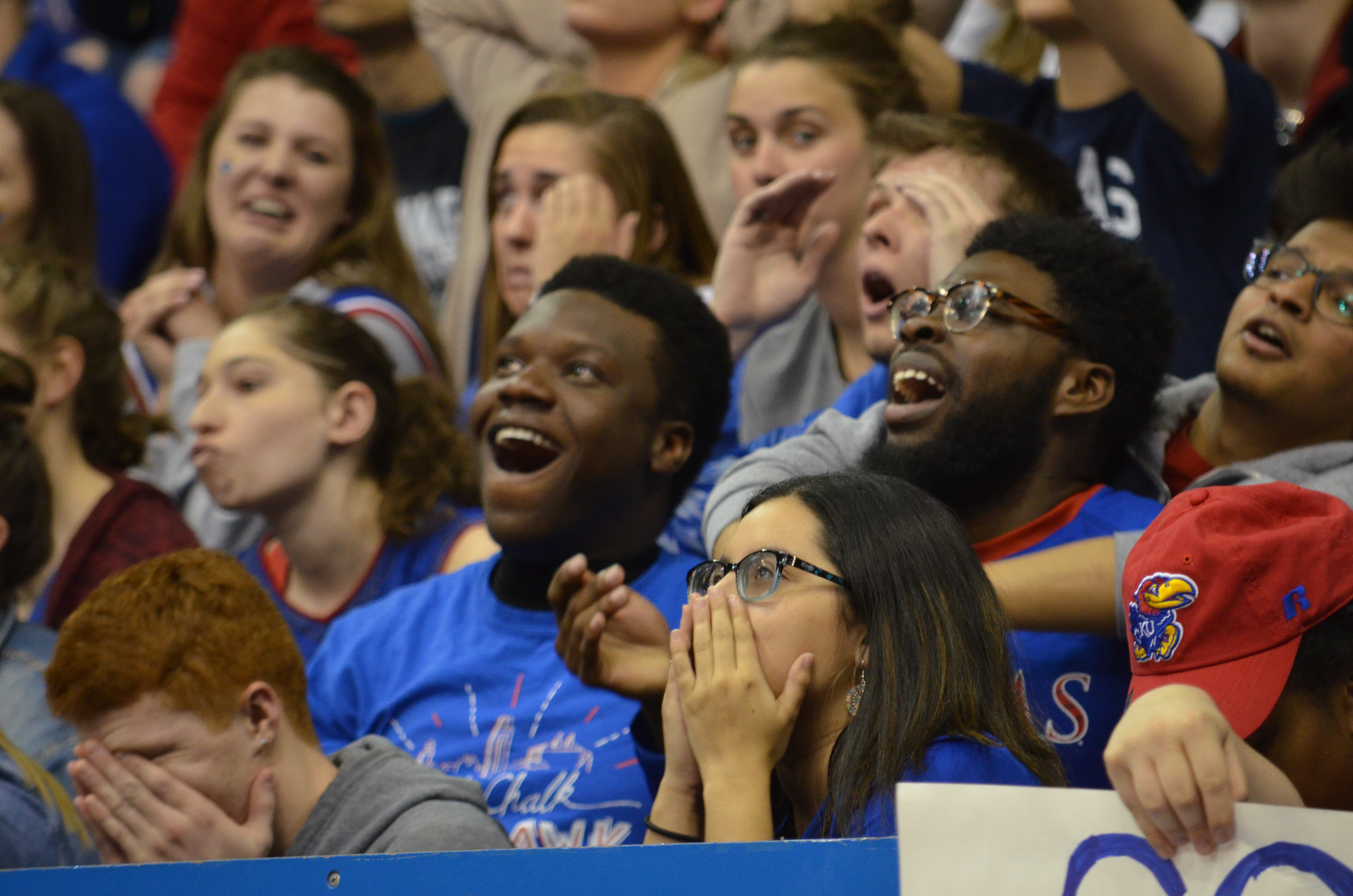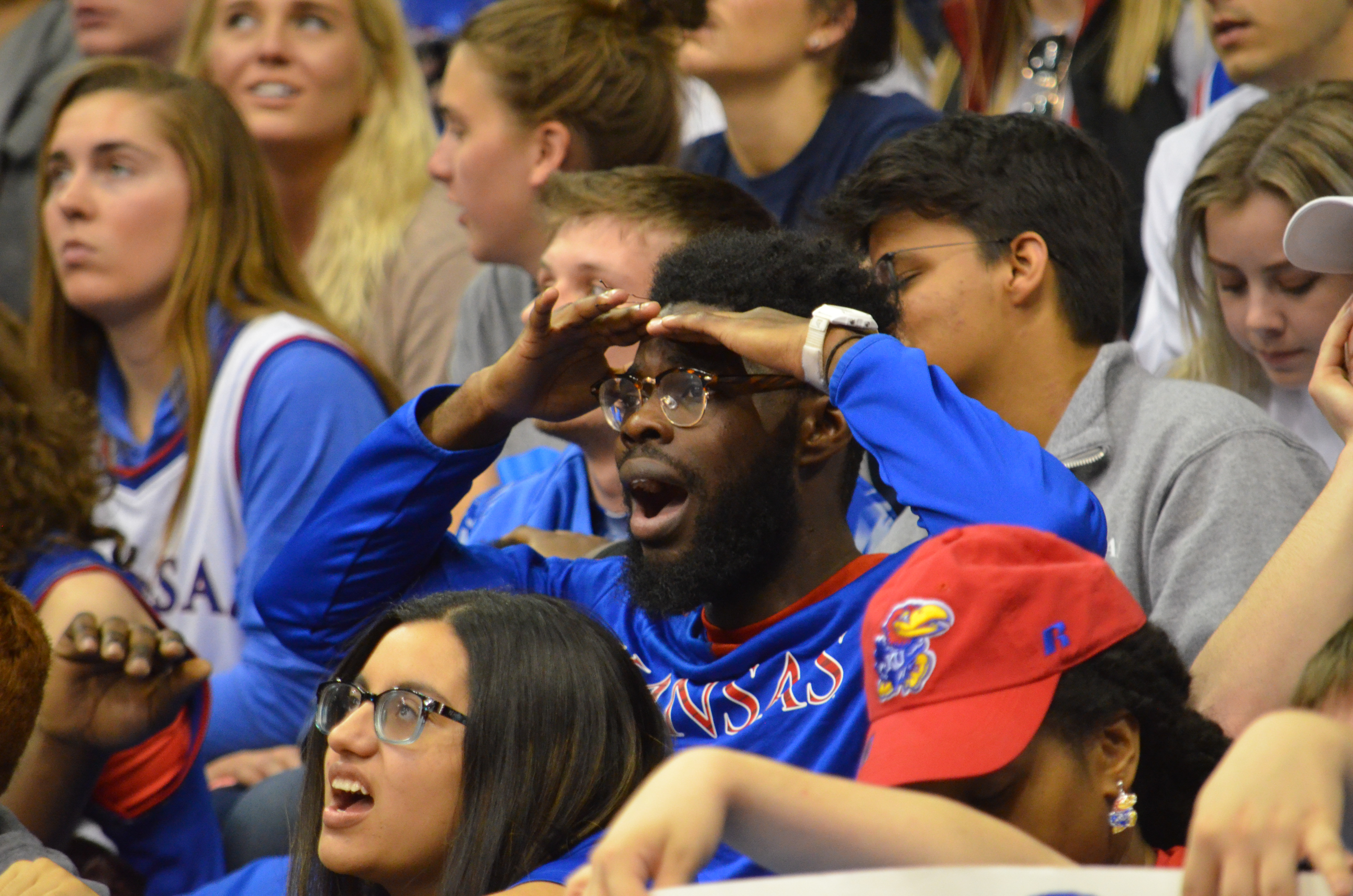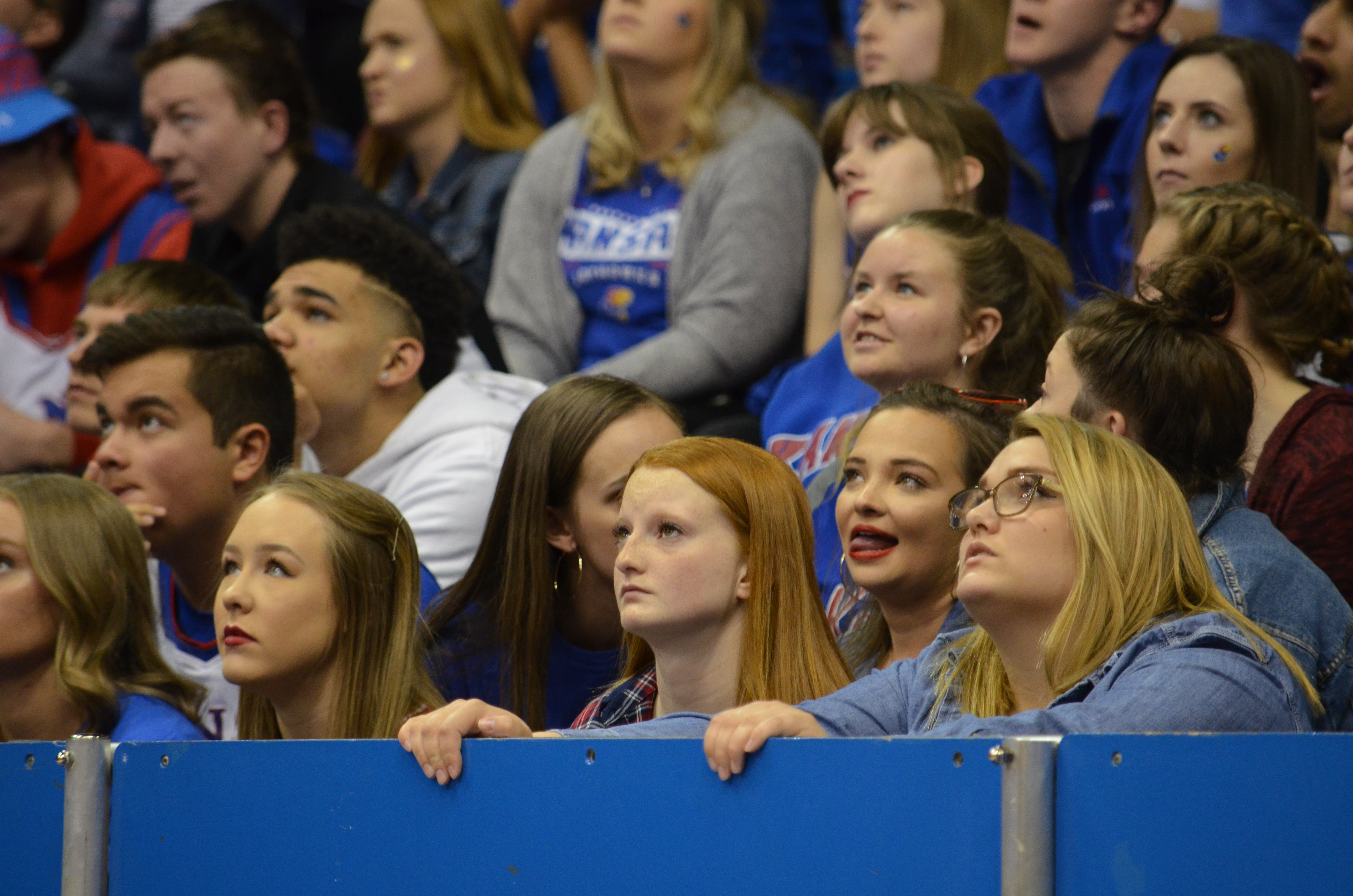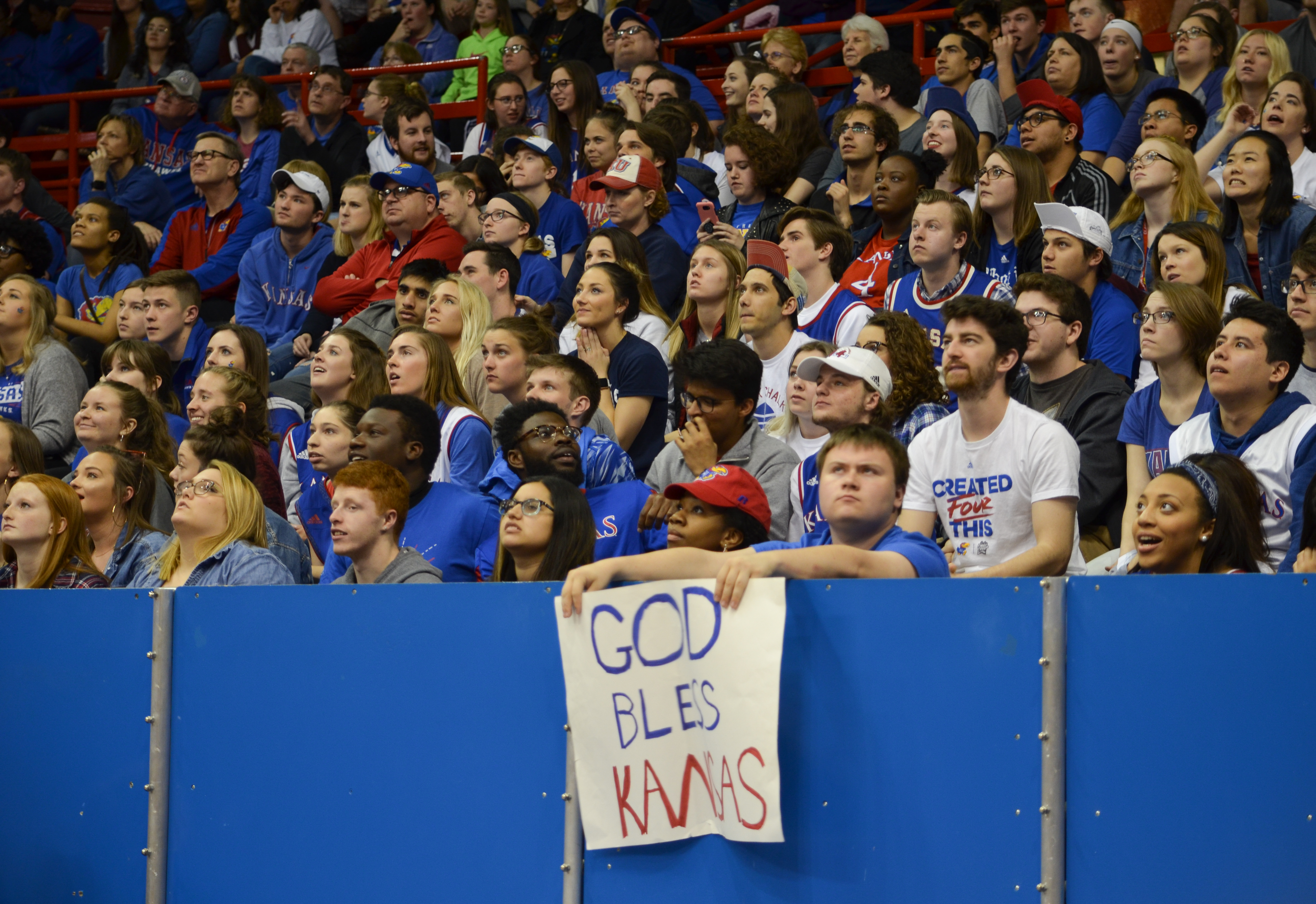 Kansas basketball fans watch the video board at Allen Fieldhouse, where the KU basketball game against Villanova was being screened. KU lost to Villanova, 95-79, on Saturday, March 31, 2018.