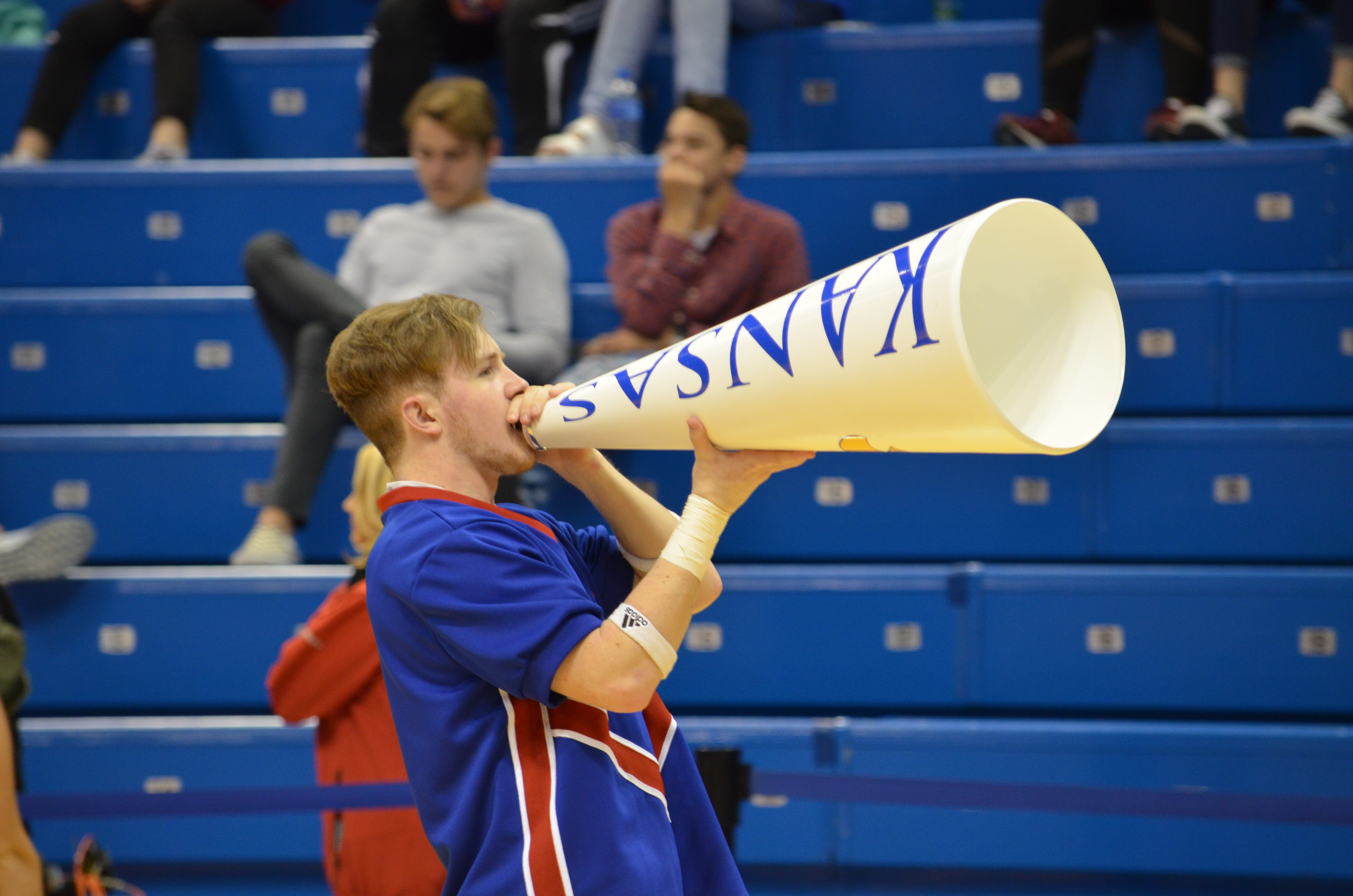Kansas cheerleader Joshua Ladevich performs a chant at Allen Fieldhouse, on Saturday, March 31, 2018. The Kansas basketball team's game against Villanova was played on the video board. KU lost to Villanova, 95-79.